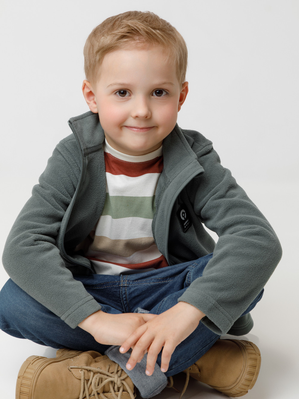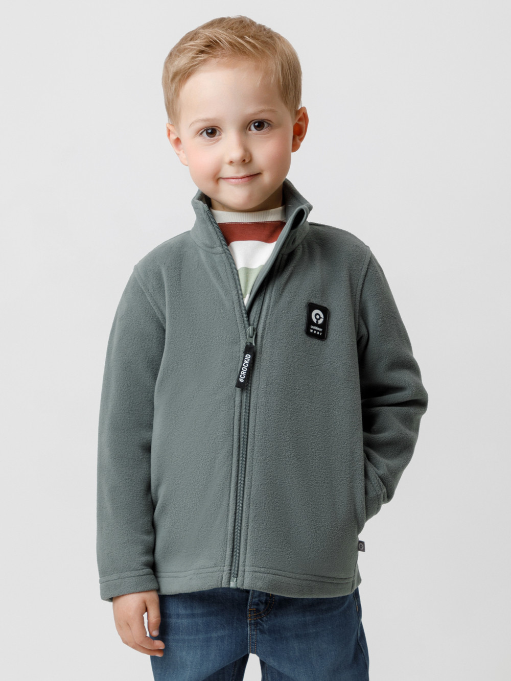 Флисовая куртка для мальчика. У изделия высокий воротник и застёжка на молнию с мягкой защитой шеи и подбородка. По бокам два кармана. Куртка сохраняет цвет и форму после многократных стирок.
