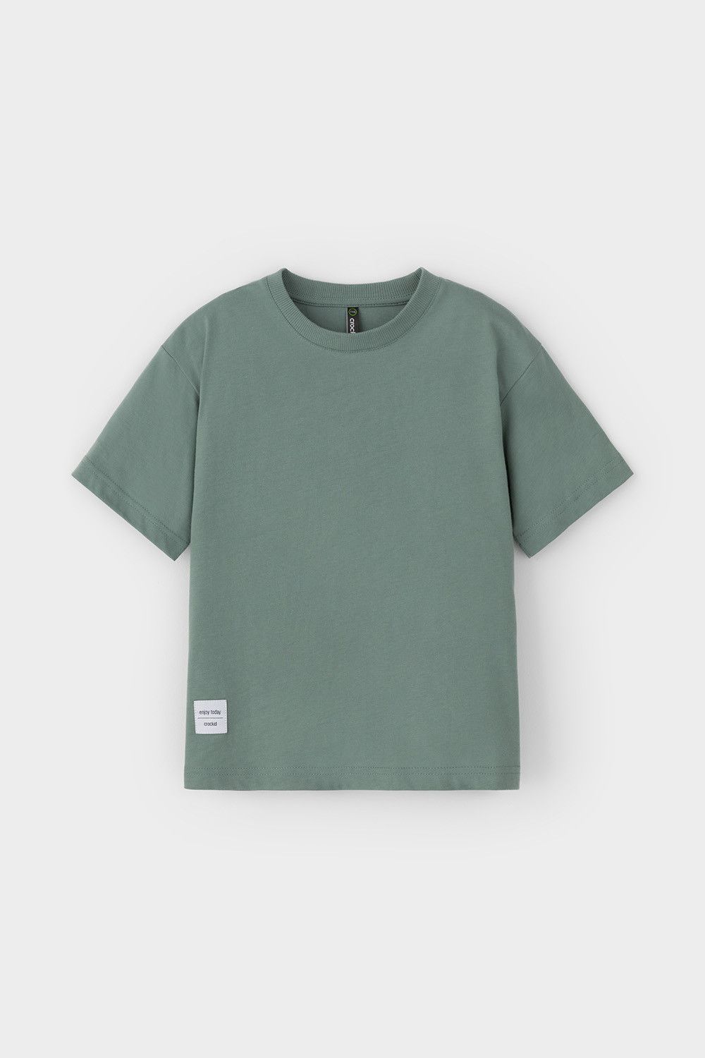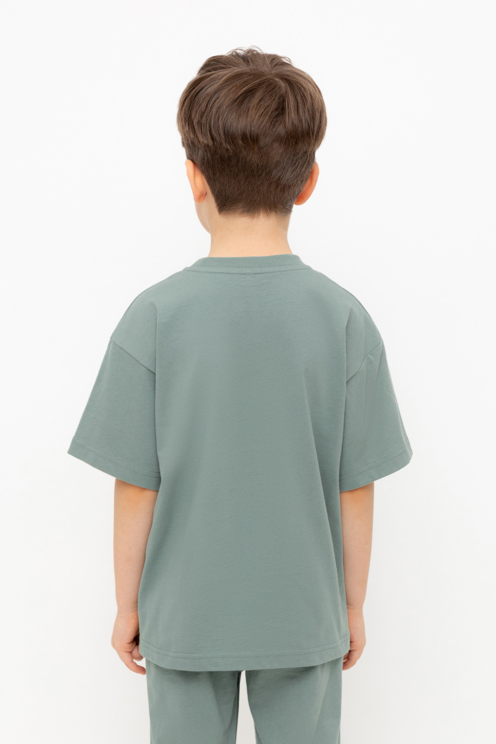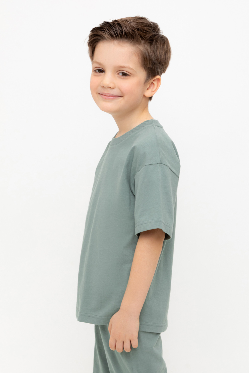 Однотонная футболка для мальчика из высококачественного трикотажного полотна. Для удобства одевания в размерах 92 и 98 застёгивается на спинке с помощью кнопок.