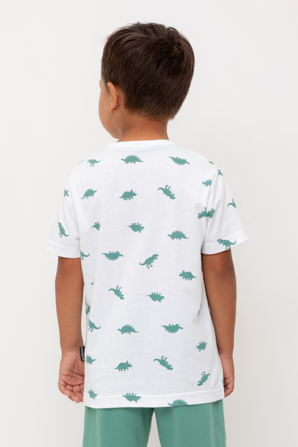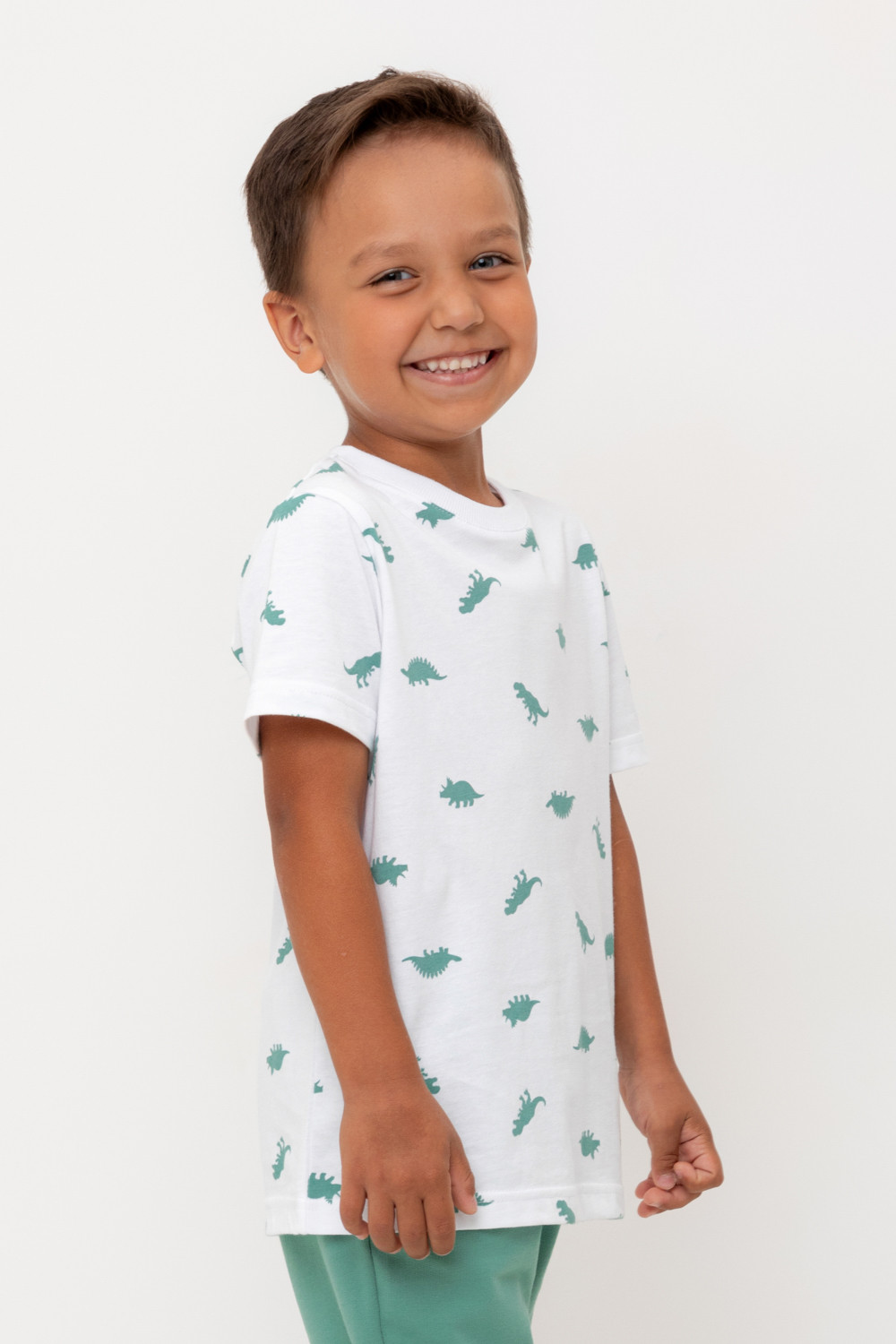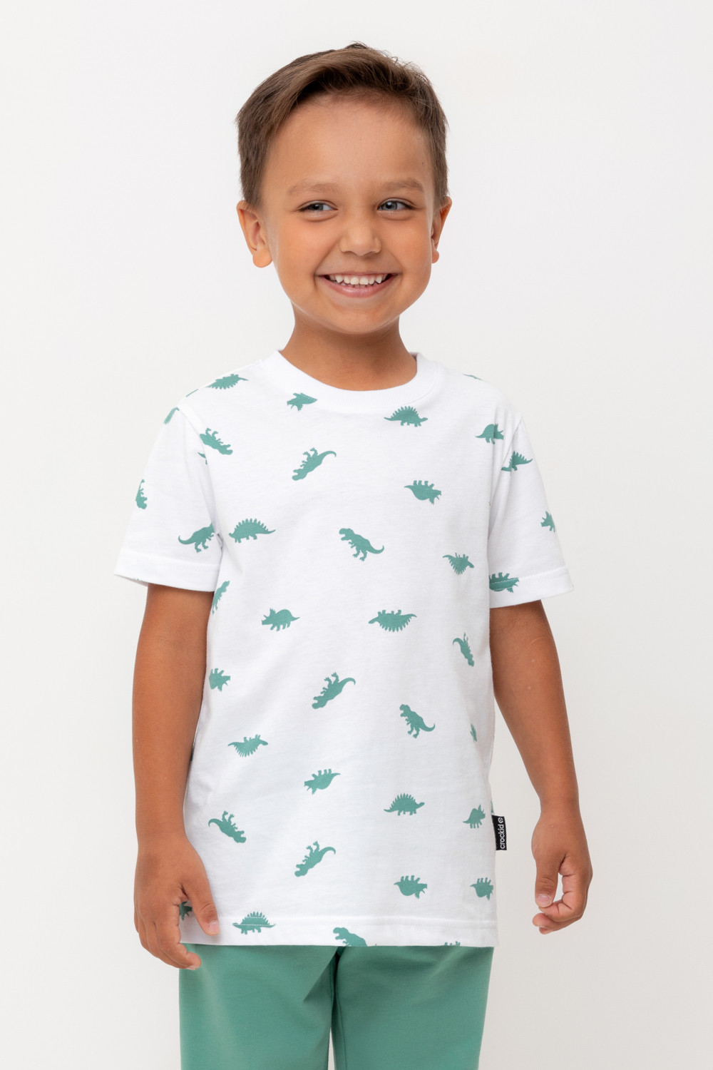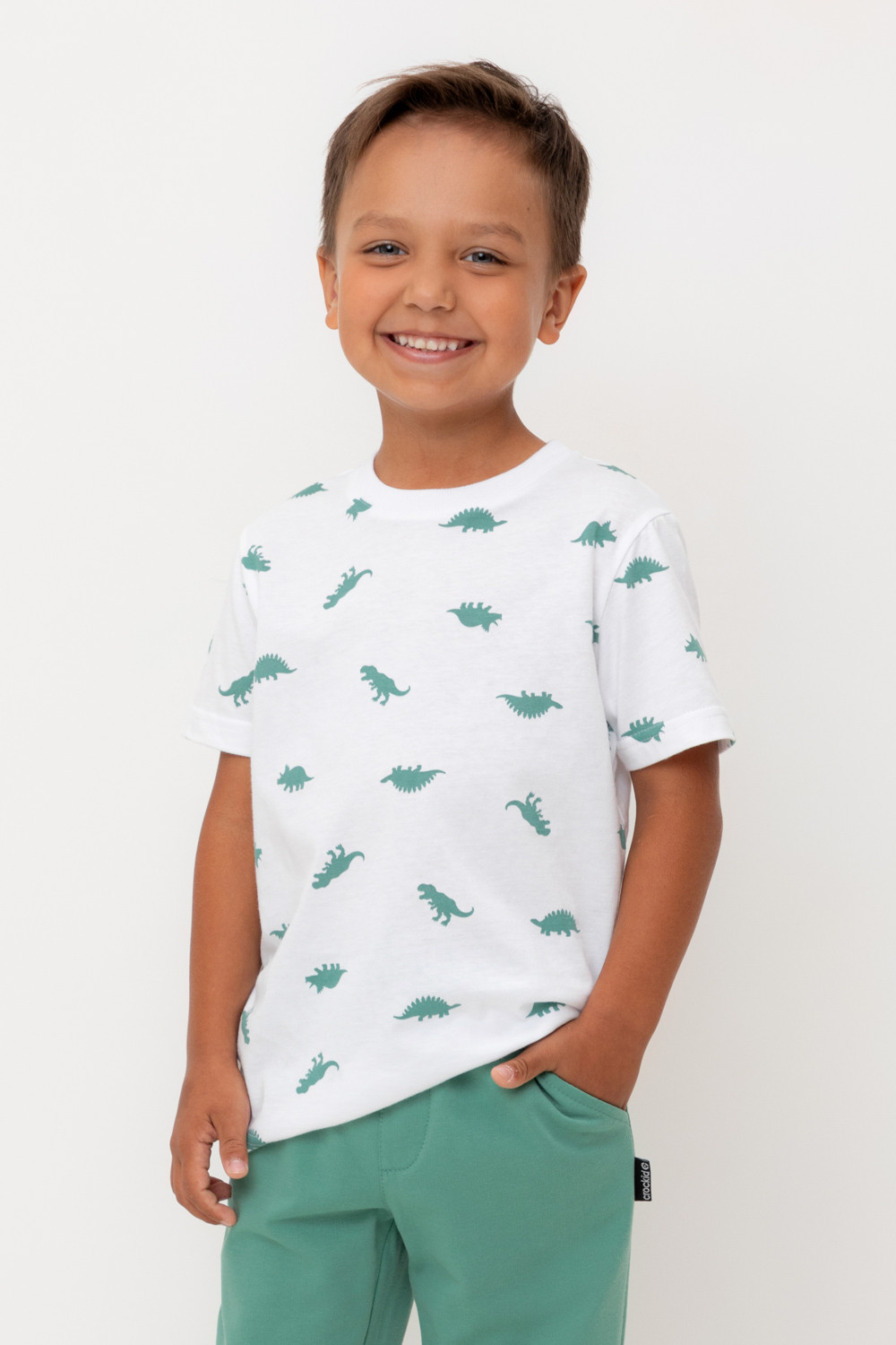 Футболка для мальчика из высококачественного трикотажного полотна. Оригинальная набивка выполнена из стойких текстильных гипоаллергенных красителей. Для удобства в размерах 92 и 98 на плече есть застежка на кнопки.