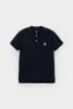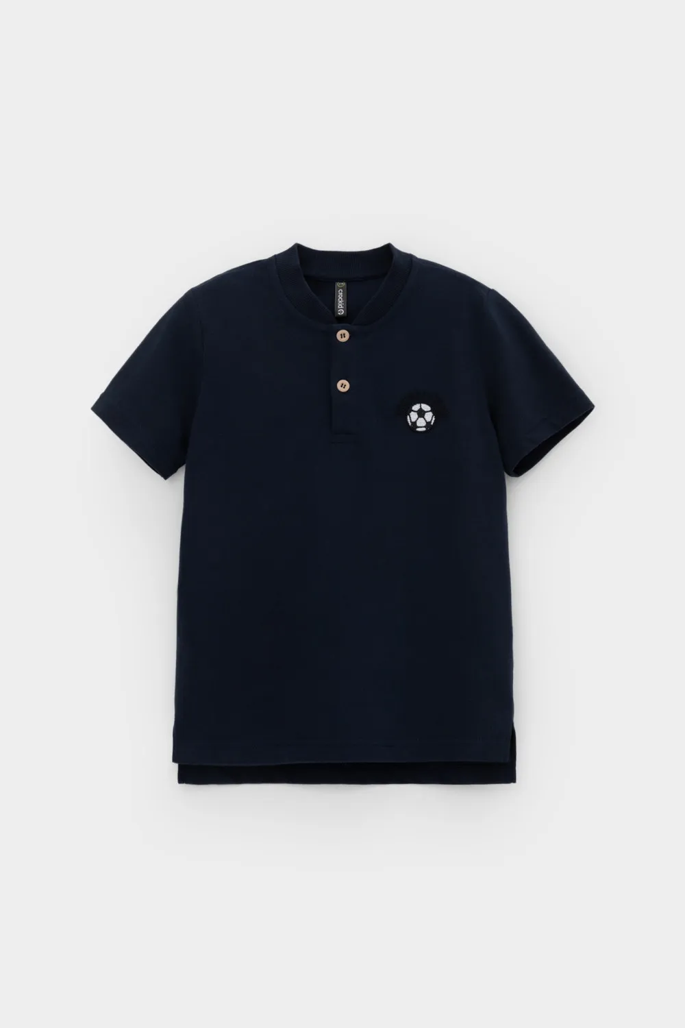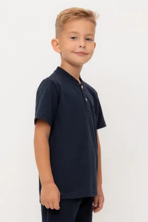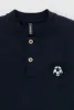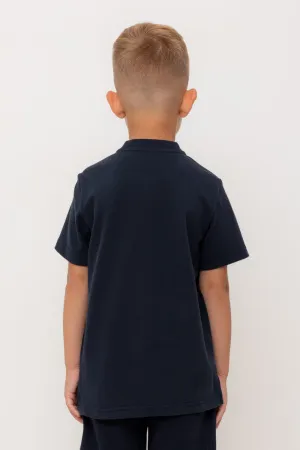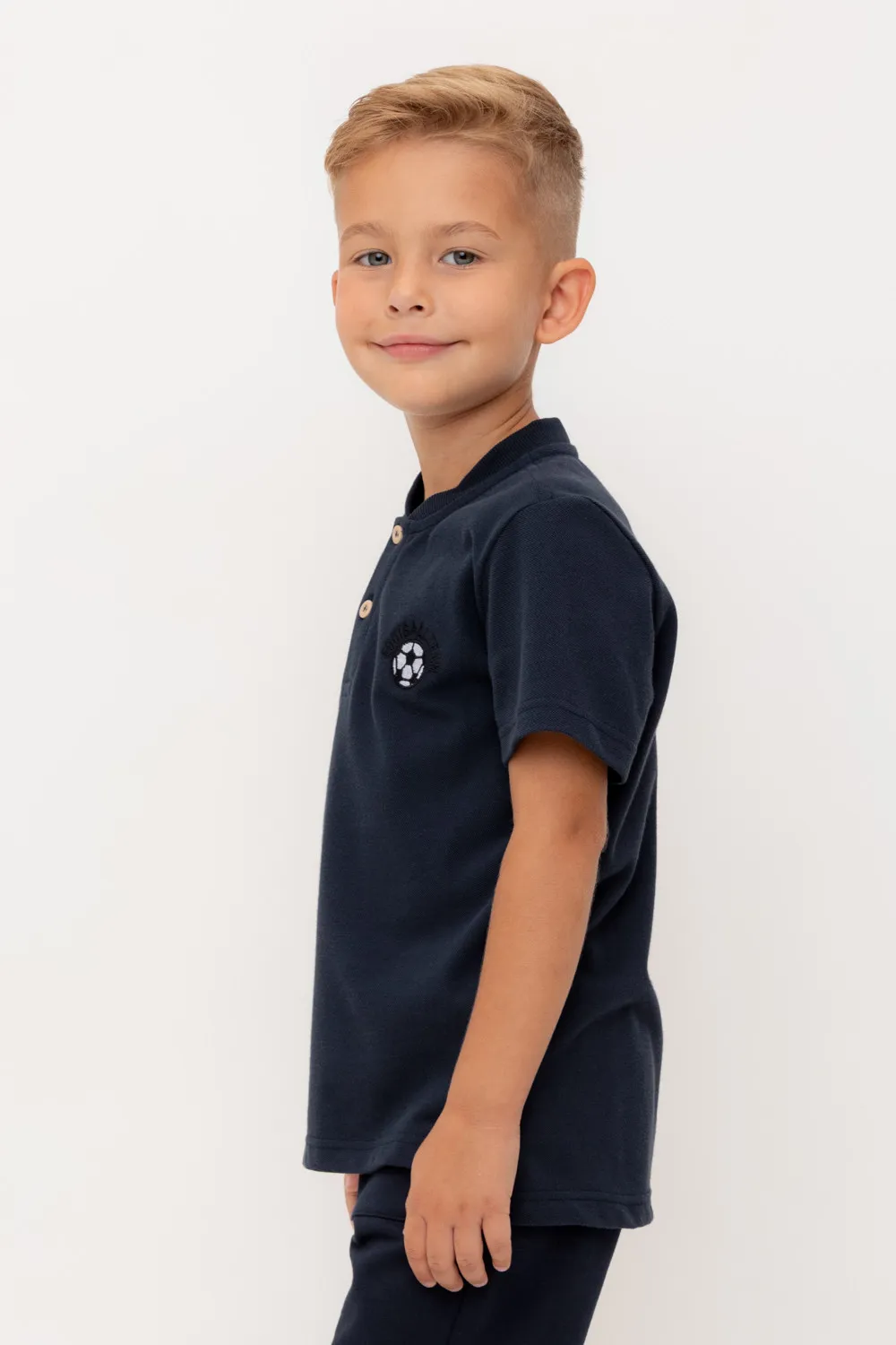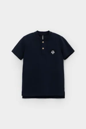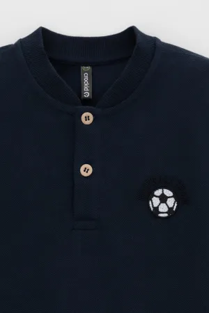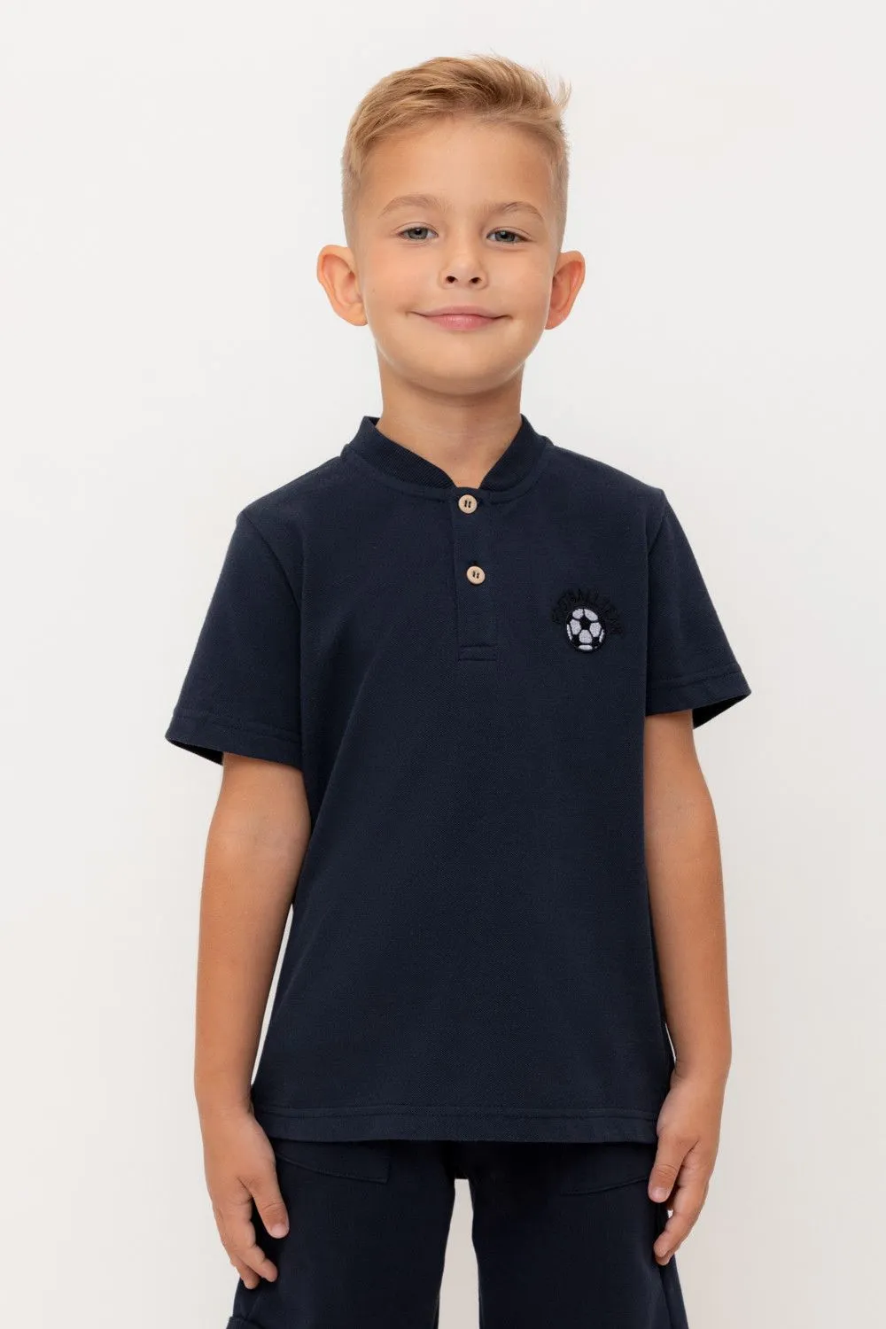 Поло с вышивкой для мальчика. Изготовлено из высококачественного трикотажного полотна пике. У изделия вязаный воротник и застежка спереди на две пуговицы.
