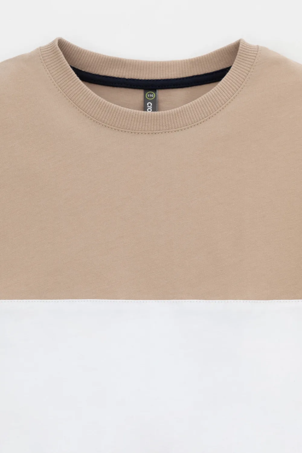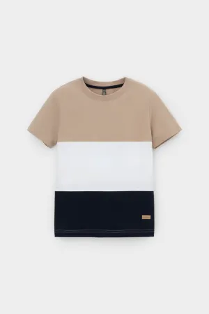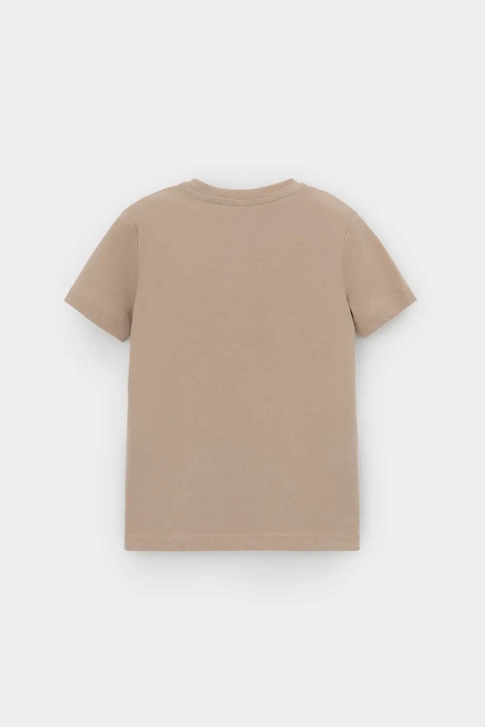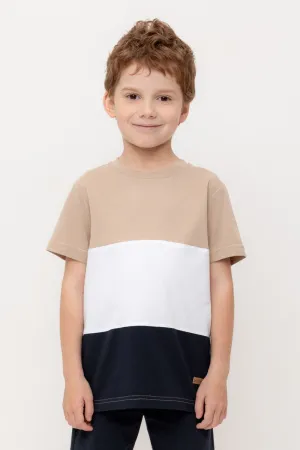 Футболка для мальчика из высококачественного трикотажного полотна. Спинка однотонная.  Для удобства в 92 и 98 размерах на плече застежка на кнопки.