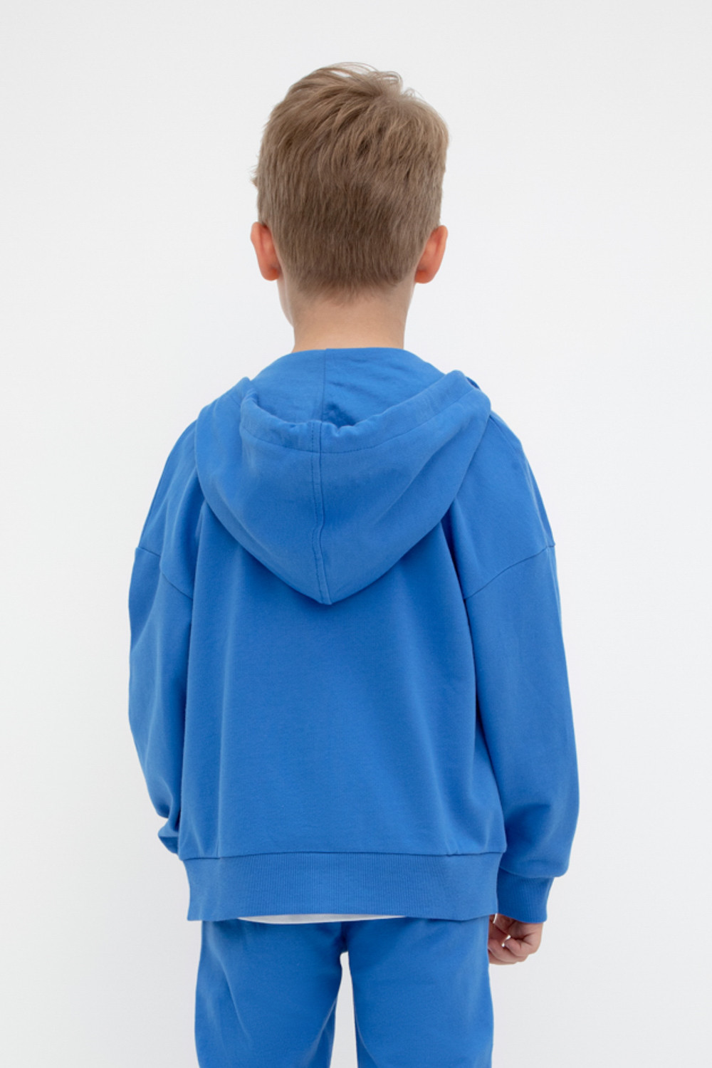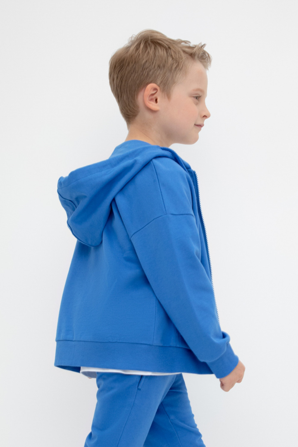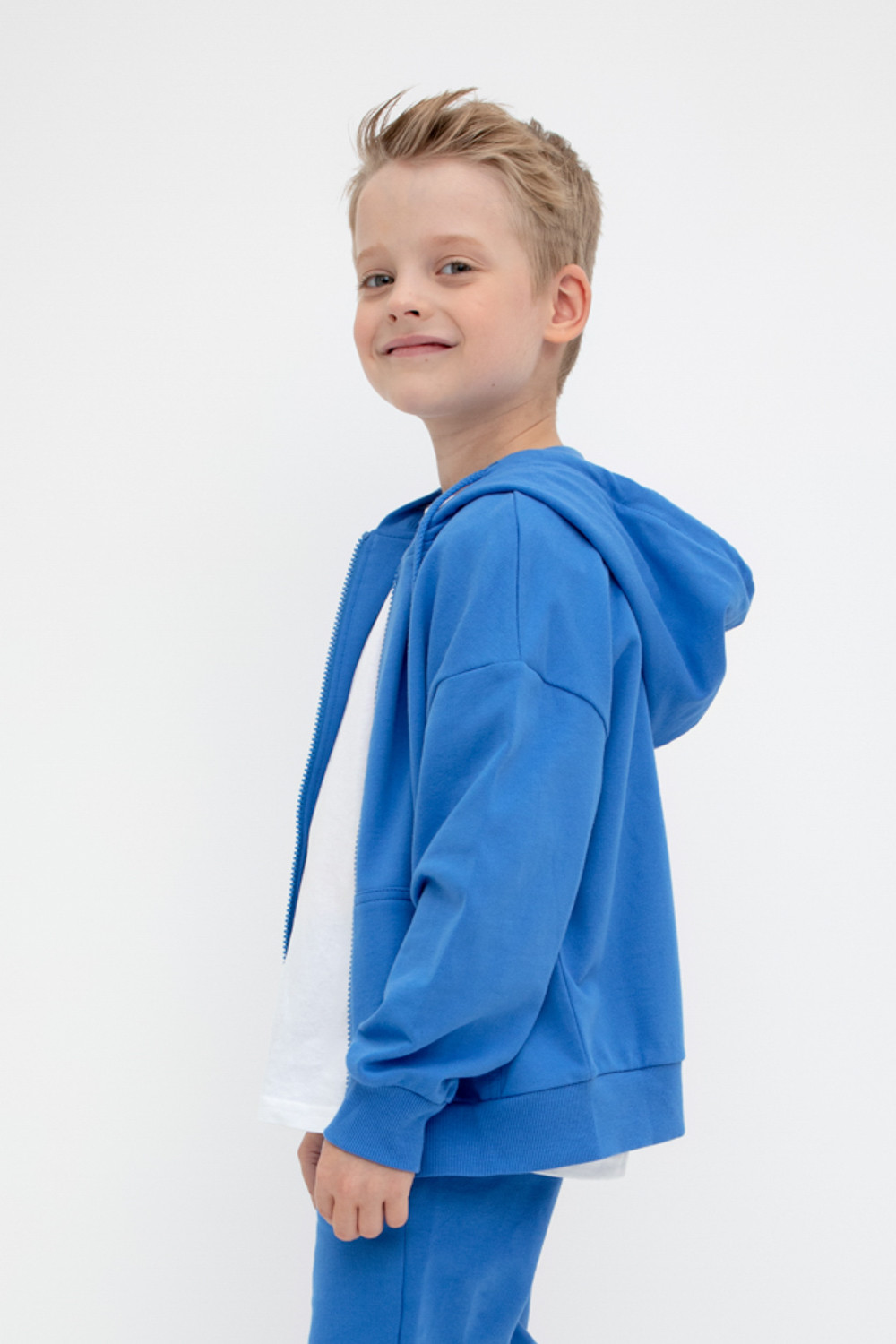 Трикотажная куртка для мальчика из петельчатого футера. Спереди удобные накладные карманы. Манжеты и пояс из эластичного трикотажа в рубчик.