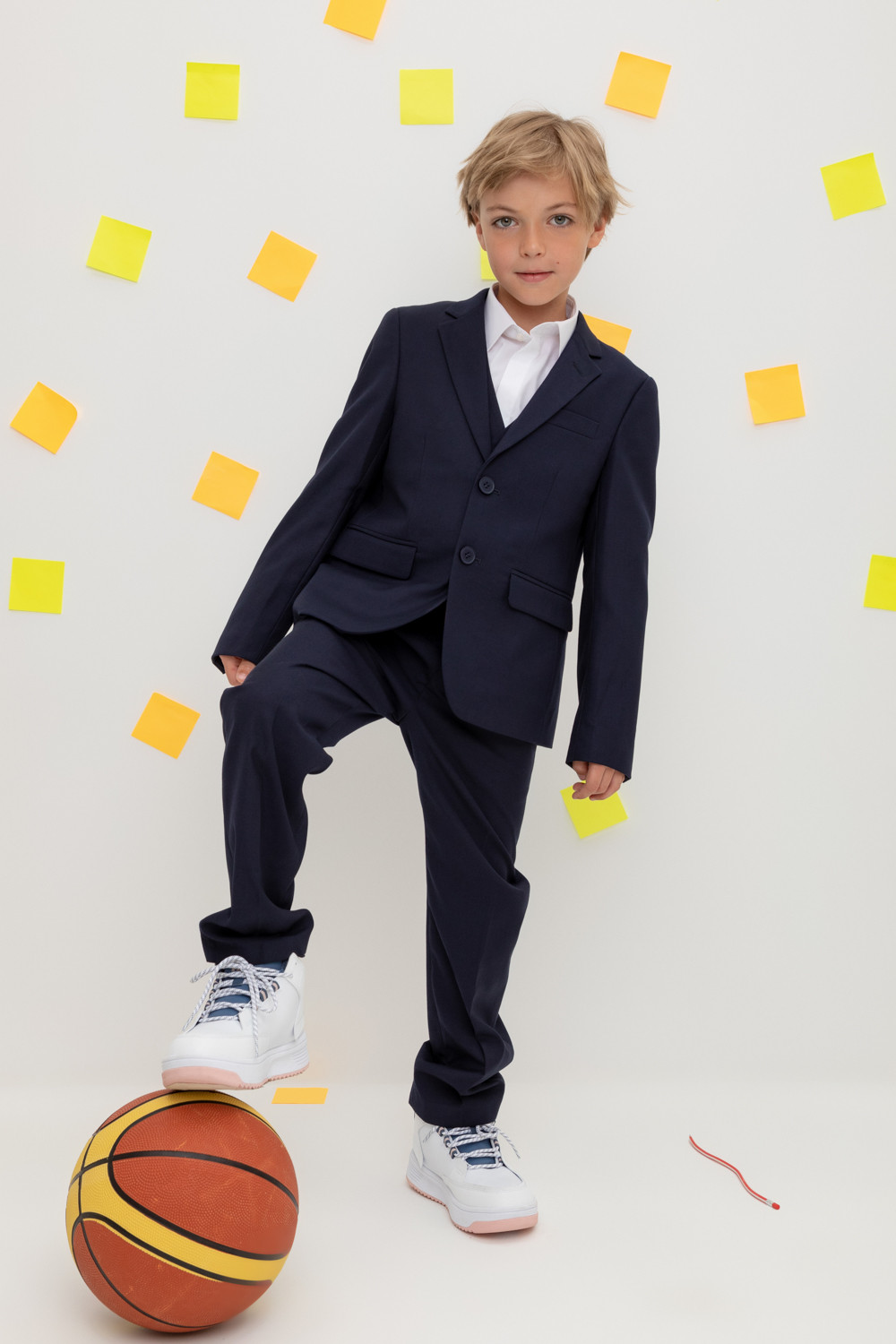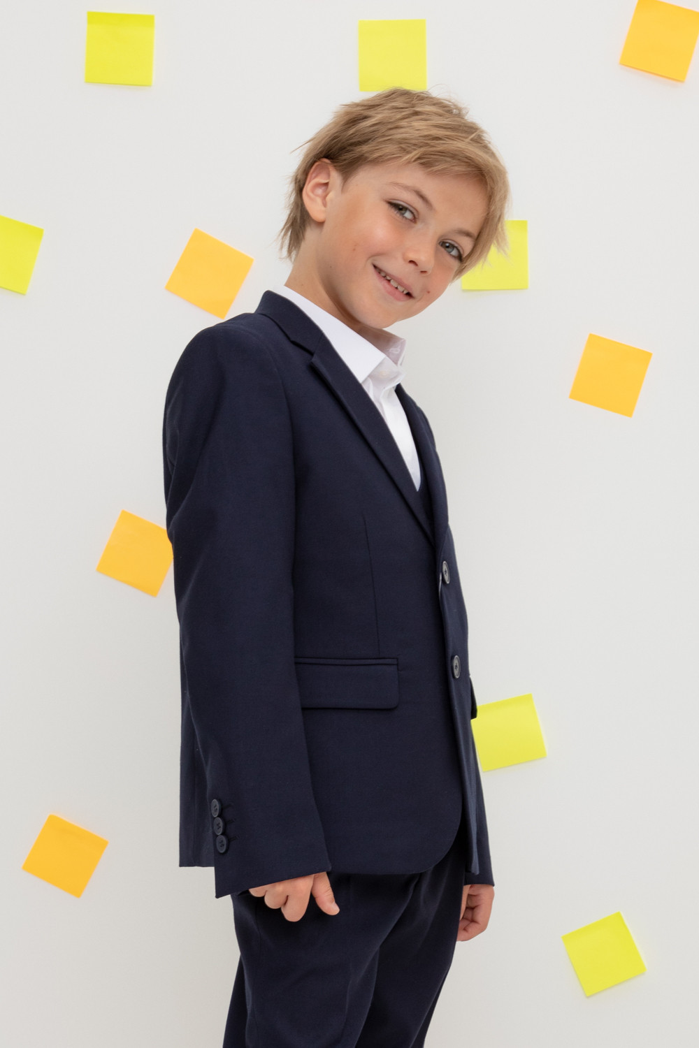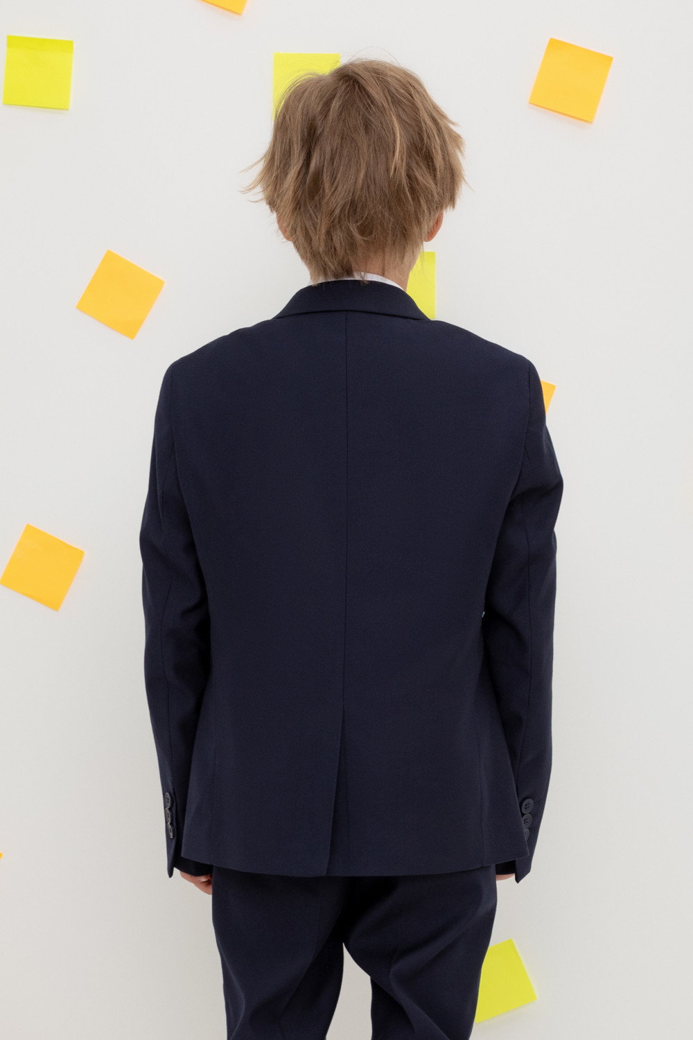Классический школьный пиджак для мальчика. Cпереди застёгивается на две пуговицы. По бокам два кармана с клапанами. Сзади шлица. Рукава украшены рядом декоративных пуговиц.