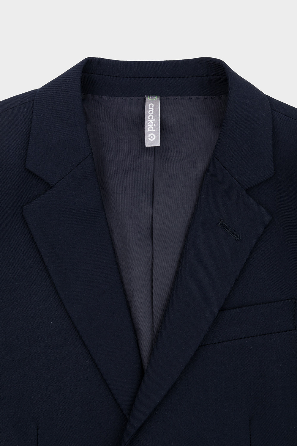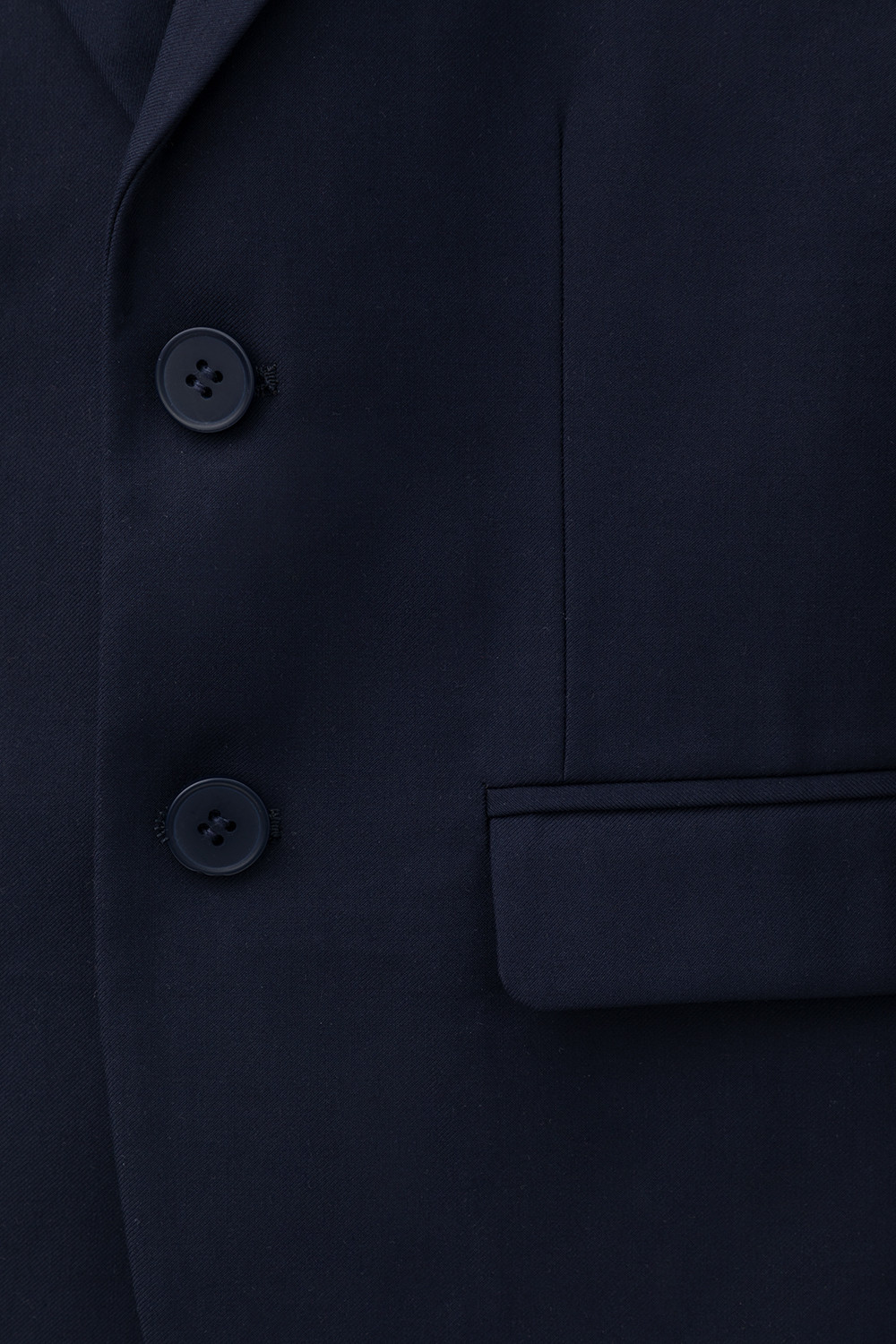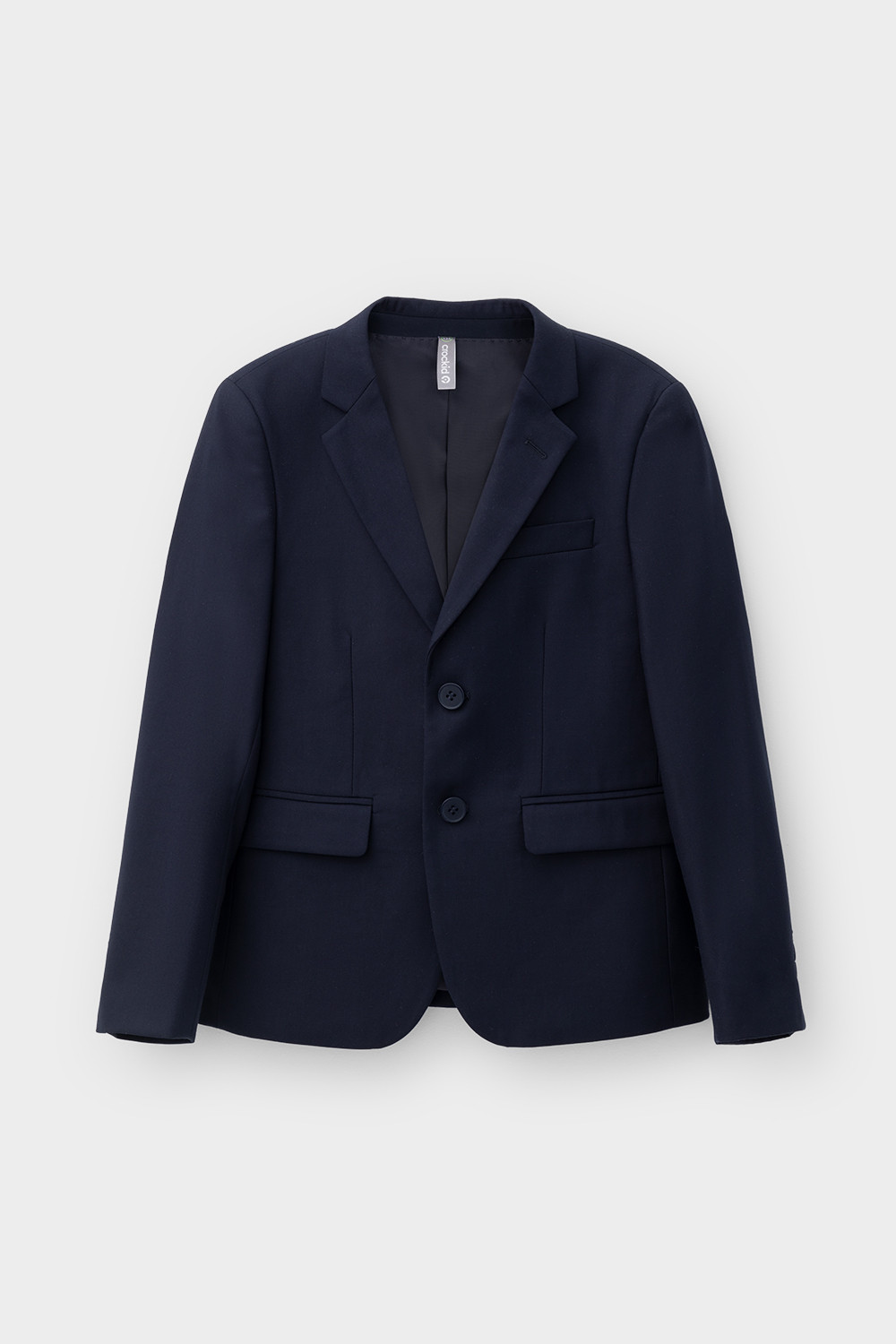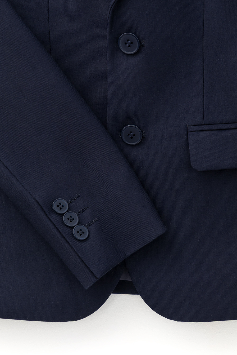 Классический школьный пиджак для мальчика. Cпереди застёгивается на две пуговицы. По бокам два кармана с клапанами. Сзади шлица. Рукава украшены рядом декоративных пуговиц.