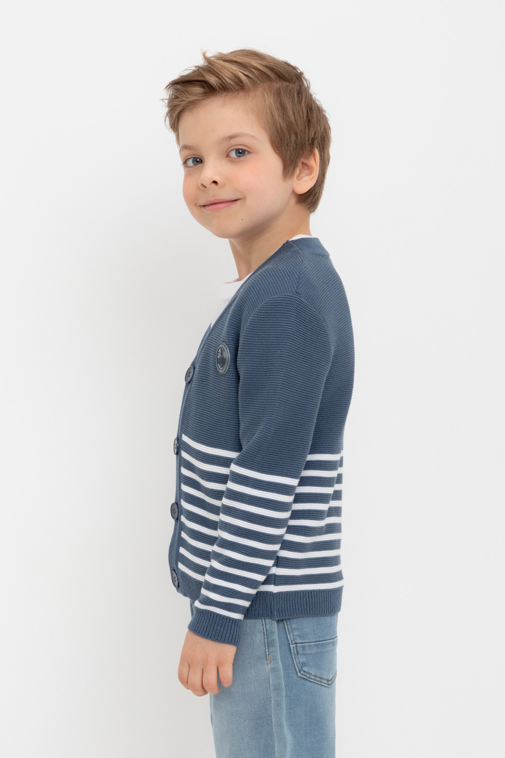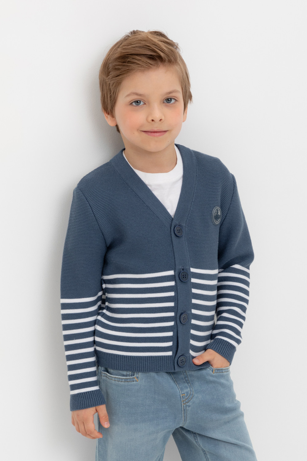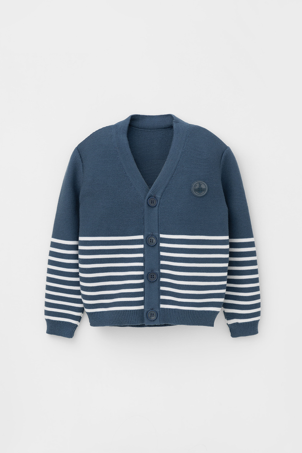 Вязаный кардиган в полоску для мальчика с втачными рукавами. Связан из хлопковой пряжи. На рукавах эластичные манжеты. Внизу мягкий пояс. Застёгивается на пуговицы.