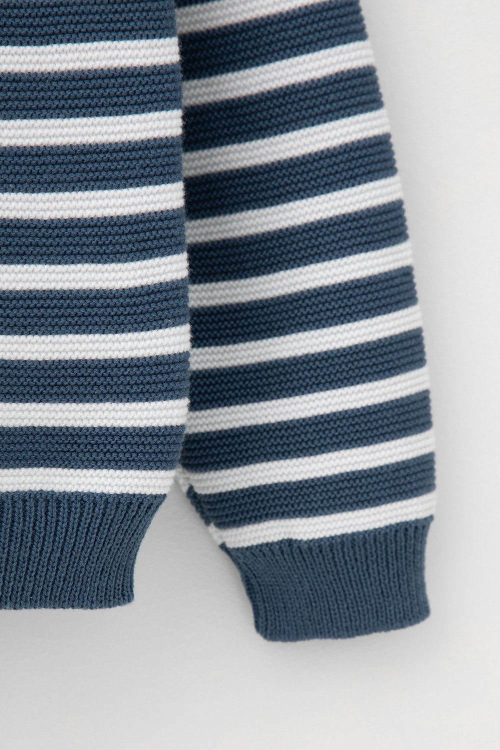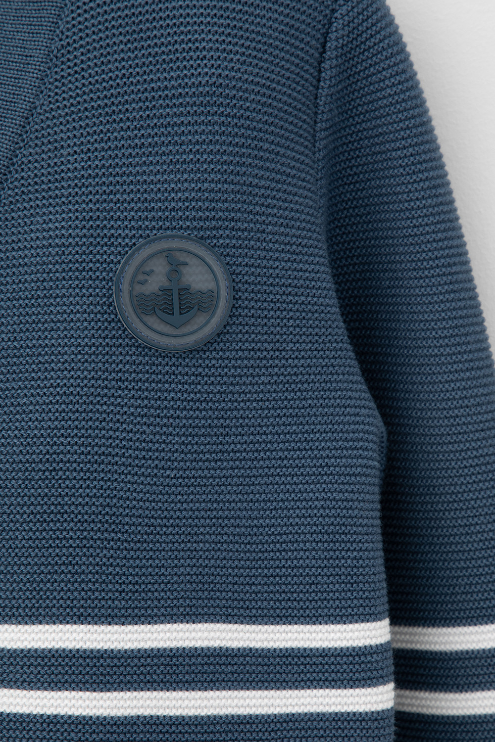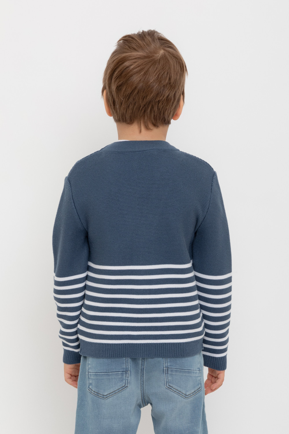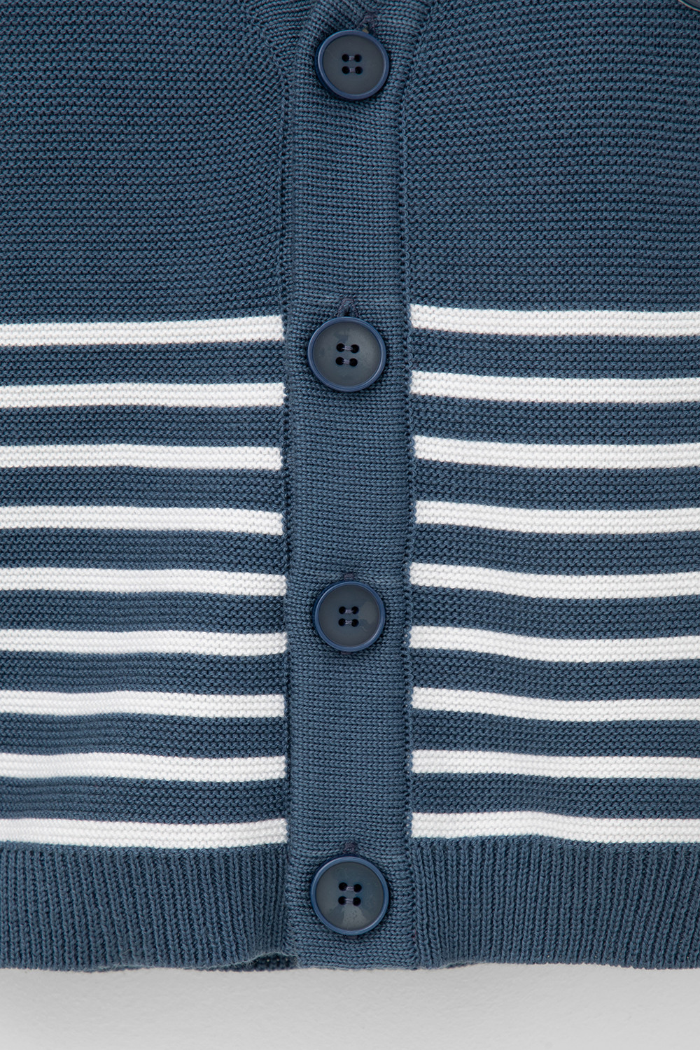 Вязаный кардиган в полоску для мальчика с втачными рукавами. Связан из хлопковой пряжи. На рукавах эластичные манжеты. Внизу мягкий пояс. Застёгивается на пуговицы.