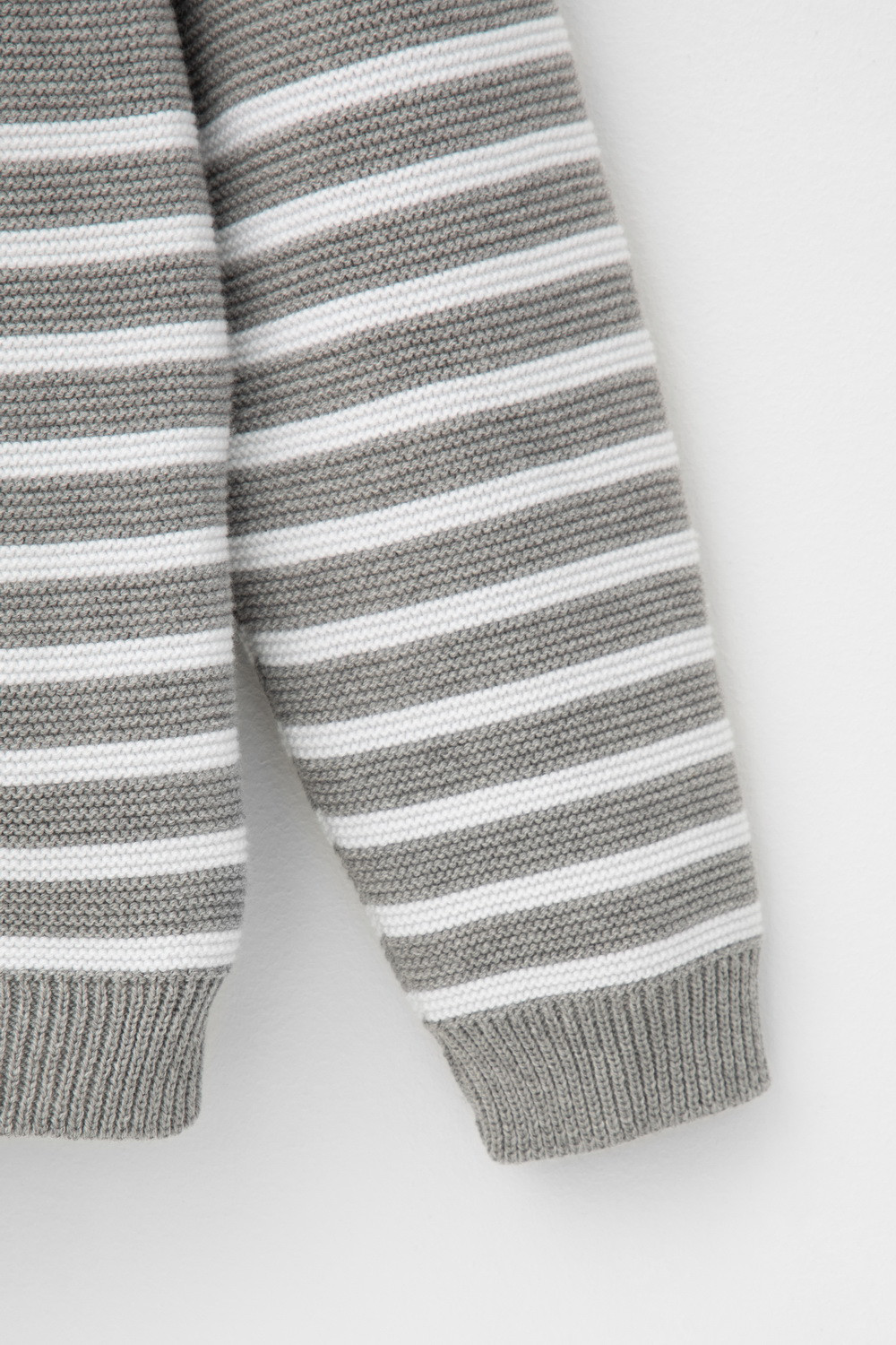 Вязаный кардиган в полоску для мальчика с втачными рукавами. Связан из хлопковой пряжи. На рукавах эластичные манжеты. Внизу мягкий пояс. Застёгивается на пуговицы.