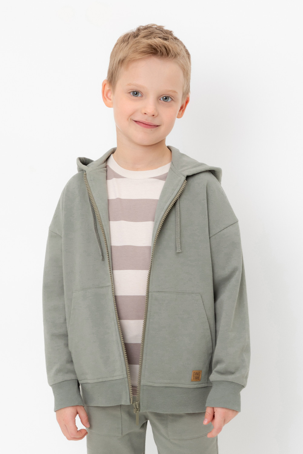 Трикотажная толстовка с капюшоном из петельчатого футера. Застёгивается на молнию. Спереди удобные накладные карманы. Манжеты и пояс из эластичного трикотажа в рубчик.
