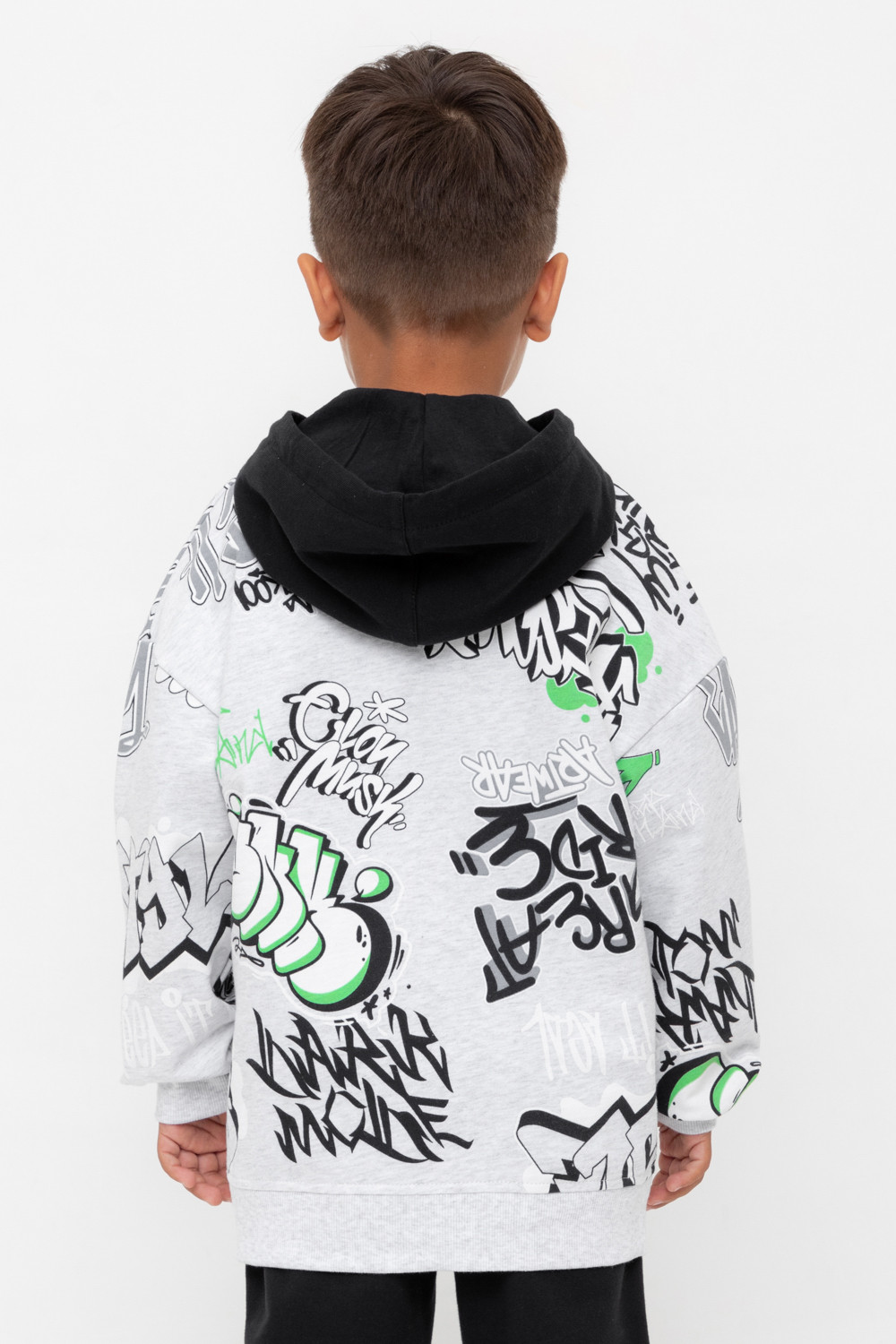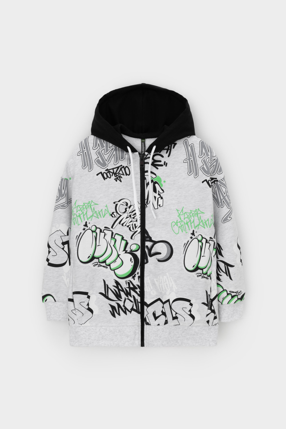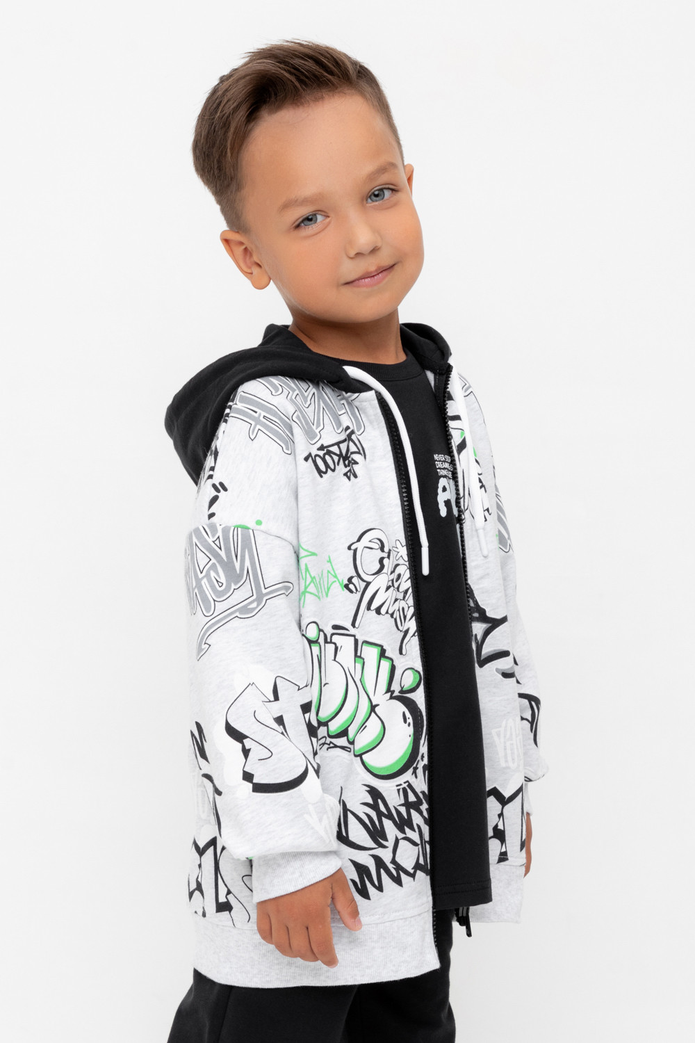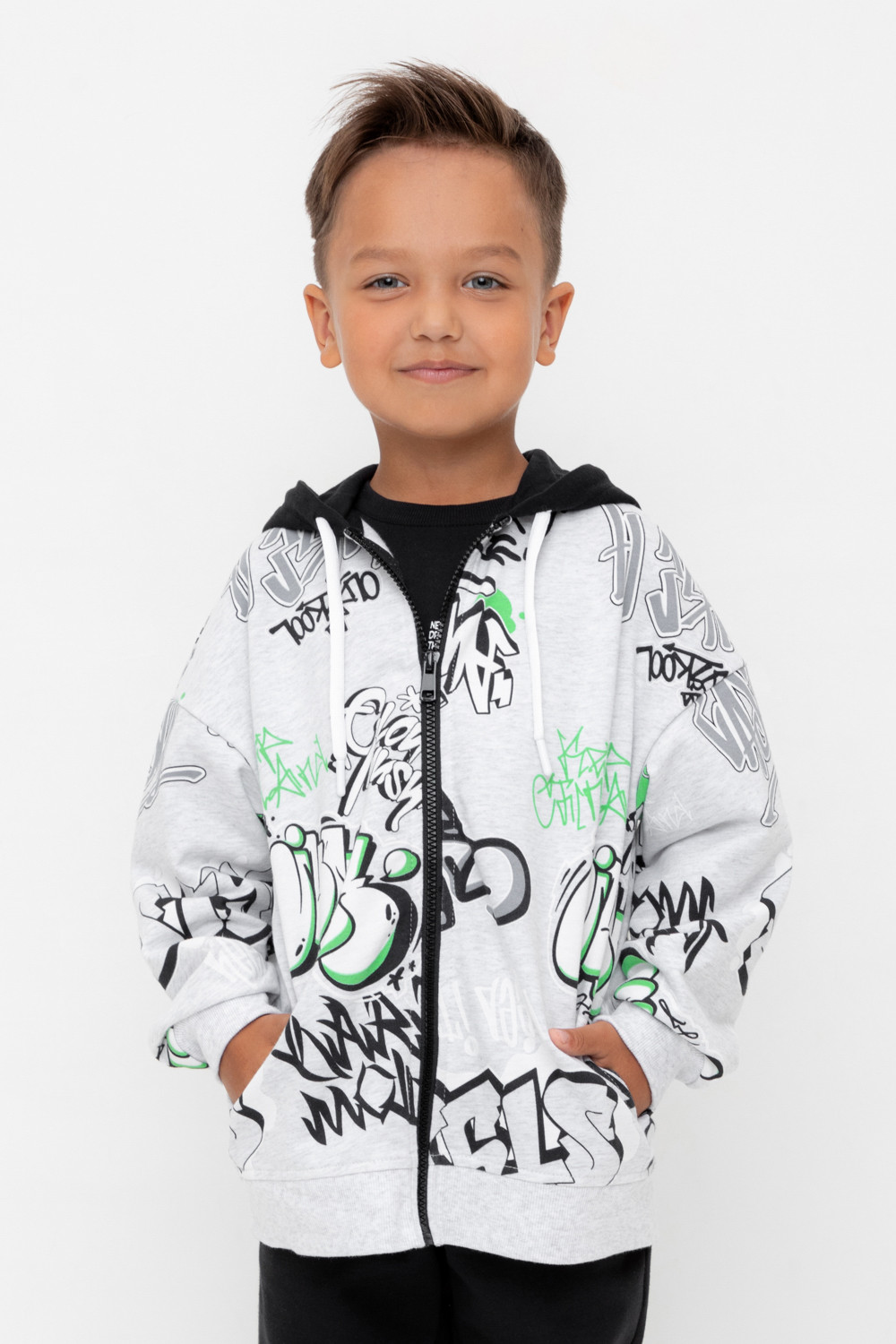 Трикотажная толстовка с капюшоном из петельчатого футера. Застёгивается на молнию. Спереди удобные накладные карманы. Манжеты и пояс из эластичного трикотажа в рубчик.