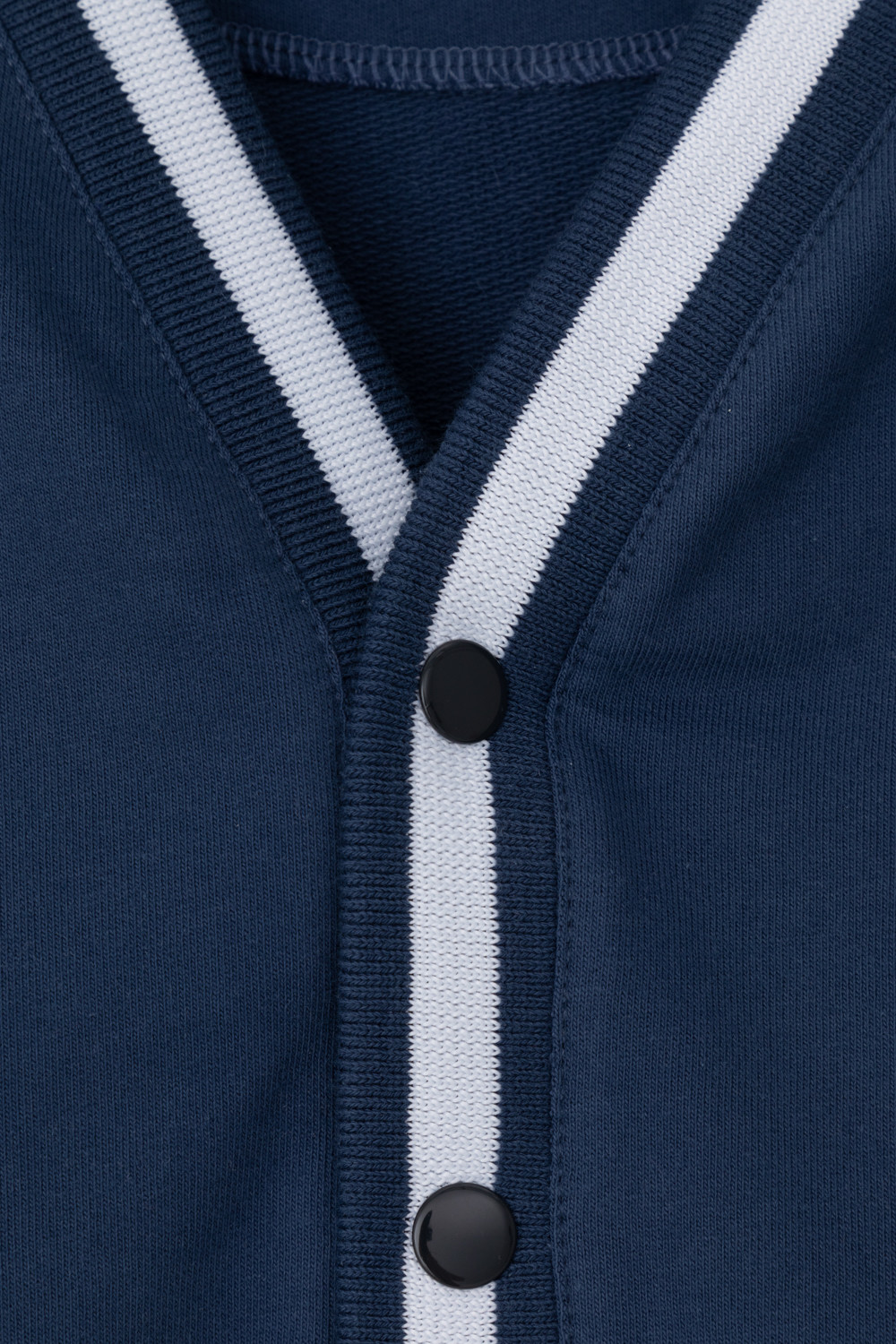 Жакет для мальчика из высококачественного трикотажного полотна футер петля. Застёгивается на кнопки. На рукавах эластичные вязаные манжеты. По бокам накладные карманы.