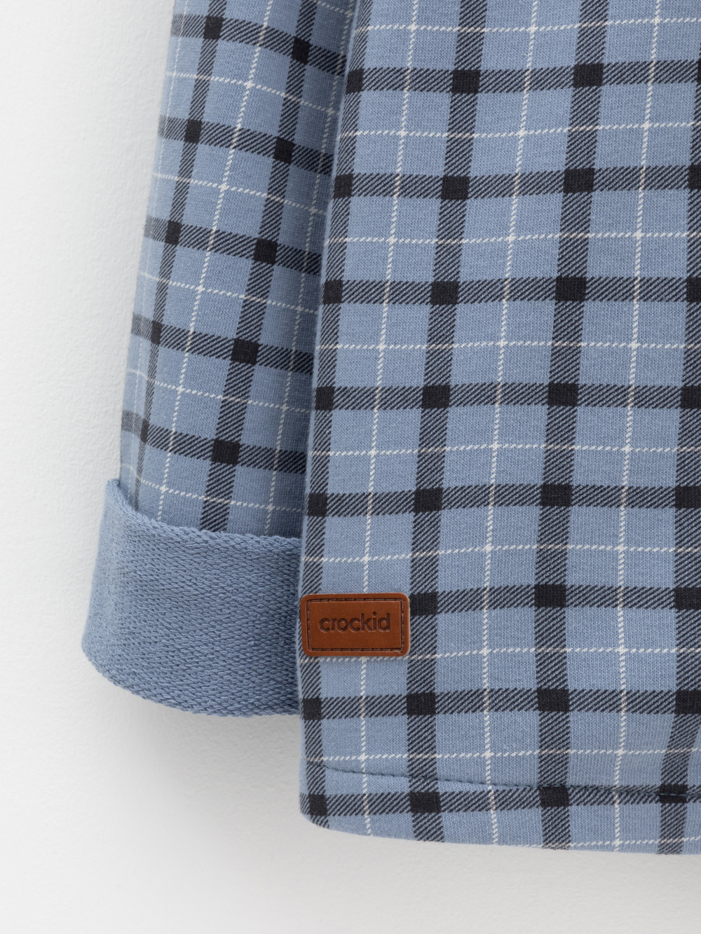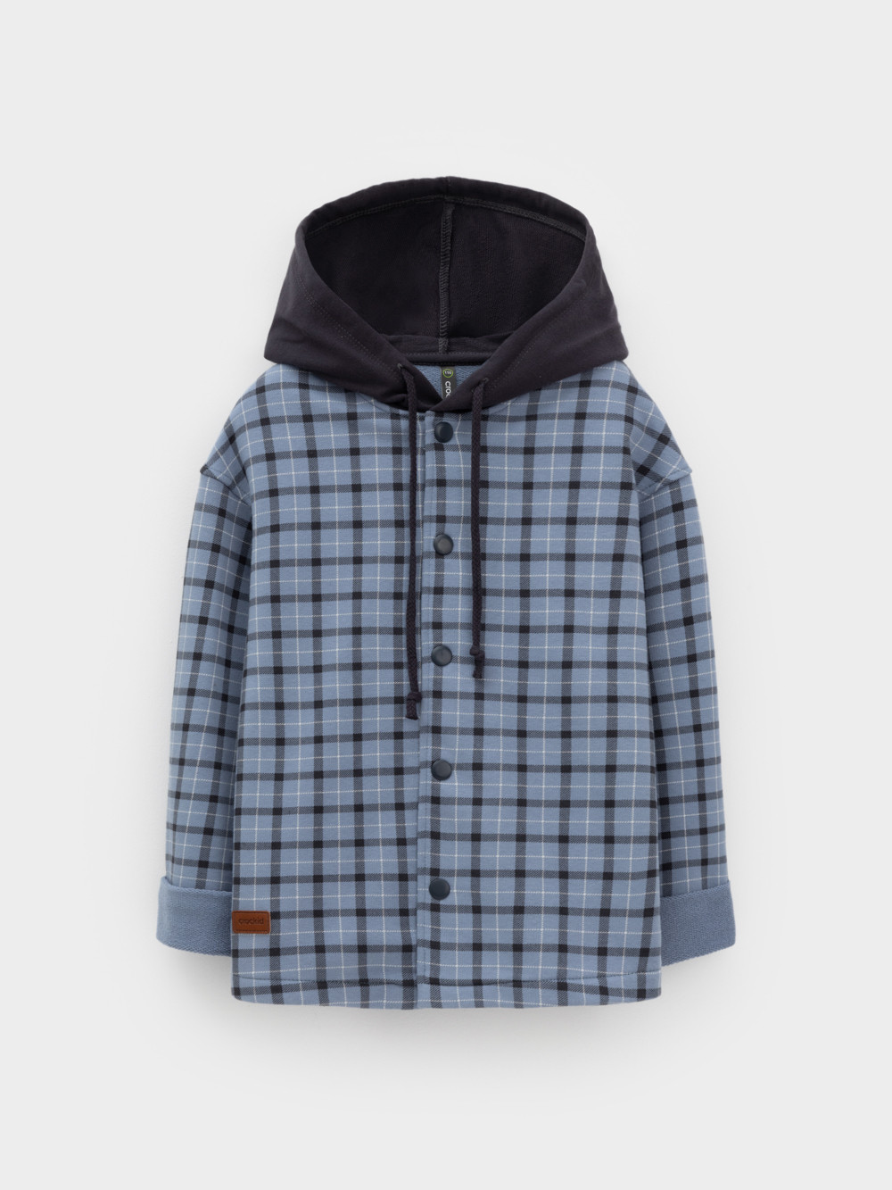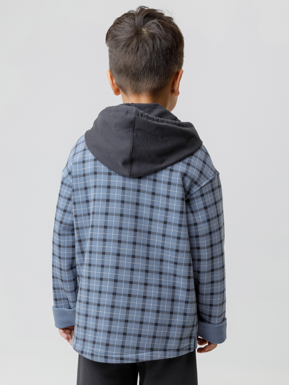 Свободная трикотажная рубашка для мальчика из мягкого петельчатого футера. В составе 80% натурального хлопка и 20% полиэстера, при этом полиэстер ввязан внутрь по особой технологии и не соприкасается с кожей. Застёгивается на кнопки. Модель с капюшоном и спущенным плечом. Рисунок в клетку выполнен из стойких текстильных гипоаллергенных красителей. Изделие сохраняет цвет и форму после многократных стирок. Все трикотажные полотна производятся в соответствии с нормами швейцарского сертификата ЭкоТекс.