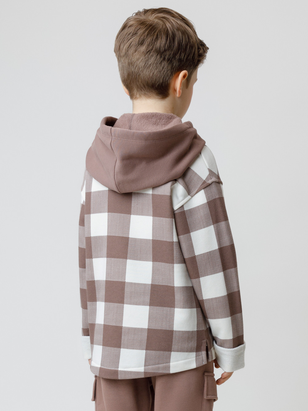 Свободная трикотажная рубашка для мальчика из мягкого петельчатого футера. В составе 80% натурального хлопка и 20% полиэстера, при этом полиэстер ввязан внутрь по особой технологии и не соприкасается с кожей. Застёгивается на кнопки. Модель с капюшоном и спущенным плечом. Рисунок в клетку выполнен из стойких текстильных гипоаллергенных красителей. Изделие сохраняет цвет и форму после многократных стирок. Все трикотажные полотна производятся в соответствии с нормами швейцарского сертификата ЭкоТекс.