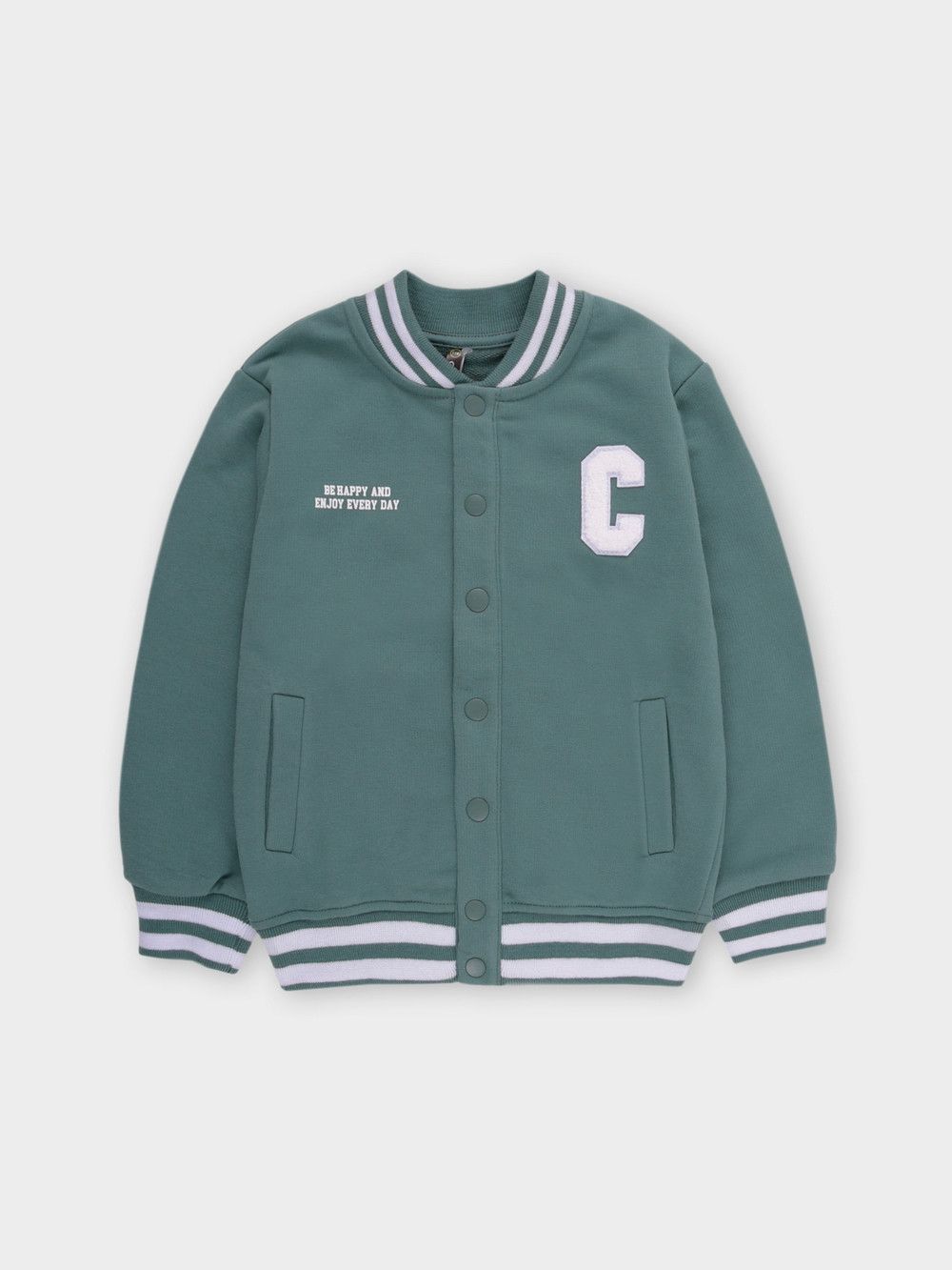 Бомбер с контрастными рукавами для мальчика. Изготовлен из мягкого петельчатого трикотажа. Застёгивается на кнопки. Воротник, манжеты и пояс - вязаные. Спереди карманы с листочкой.