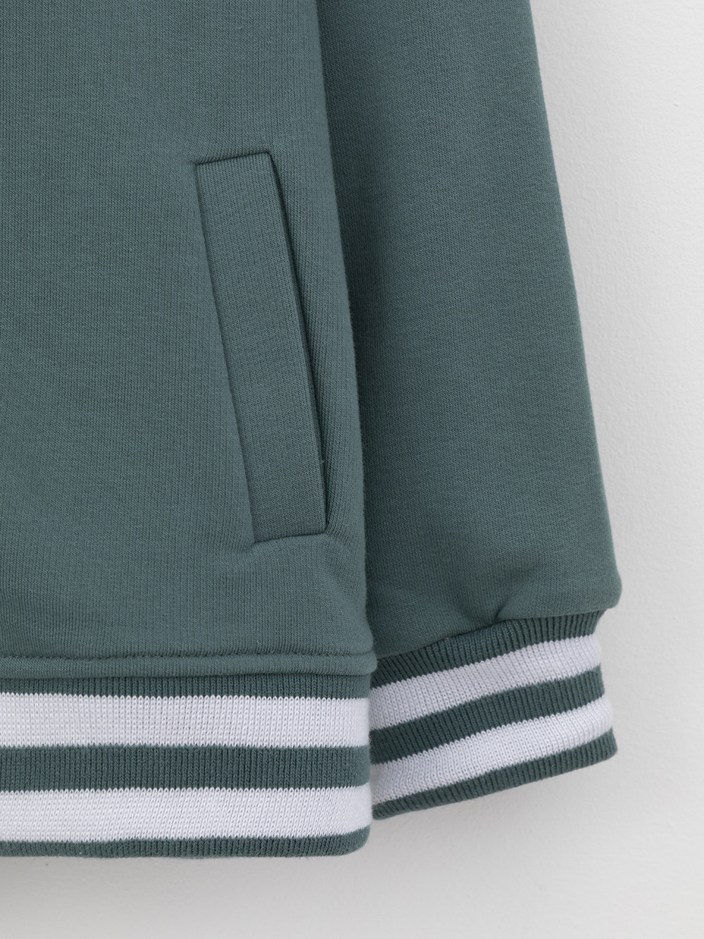 Бомбер с контрастными рукавами для мальчика. Изготовлен из мягкого петельчатого трикотажа. Застёгивается на кнопки. Воротник, манжеты и пояс - вязаные. Спереди карманы с листочкой.