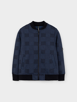 Бомбер для мальчика из мягкого трикотажа. Застёгивается на молнию. Воротник, манжеты и пояс -из эластичного трикотажа в рубчик. Спереди карманы с листочкой.