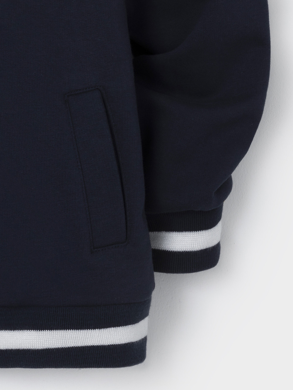 Бомбер для мальчика из мягкого трикотажа. В составе 80% натурального хлопка и 20% полиэстера, при этом полиэстер ввязан внутрь по особой технологии и не соприкасается с кожей.  Застёгивается на кнопки. Воротник, манжеты и пояс вязаные. Спереди два кармана. Изделие сохраняет цвет и форму после многократных стирок. Все трикотажные полотна производятся в соответствии с нормами швейцарского сертификата ЭкоТекс.