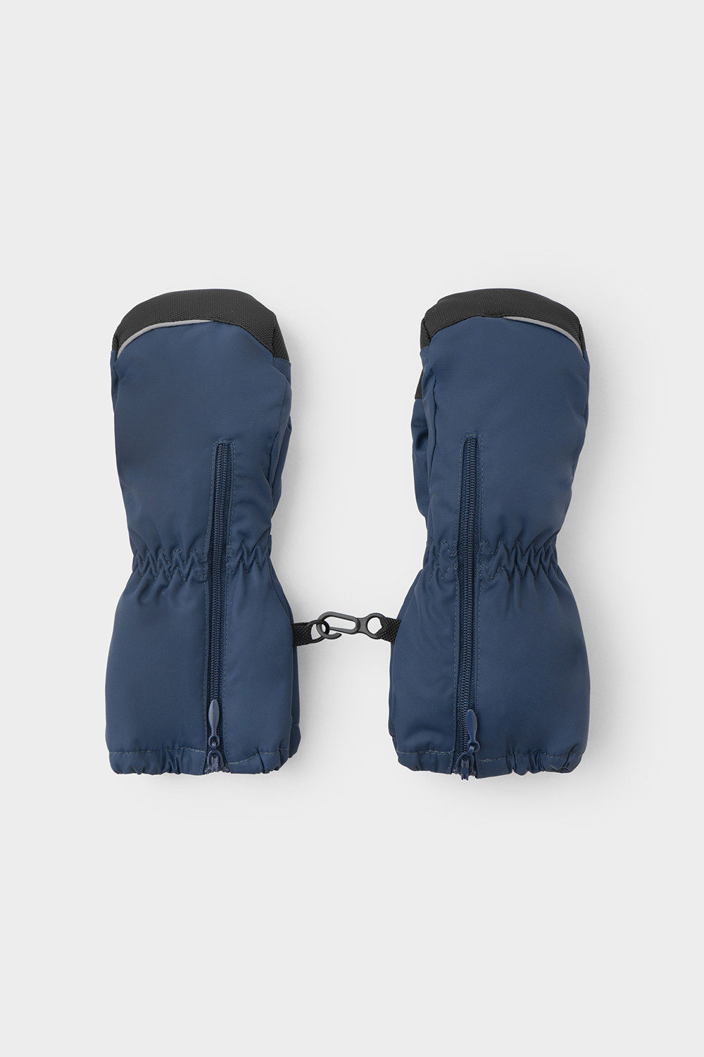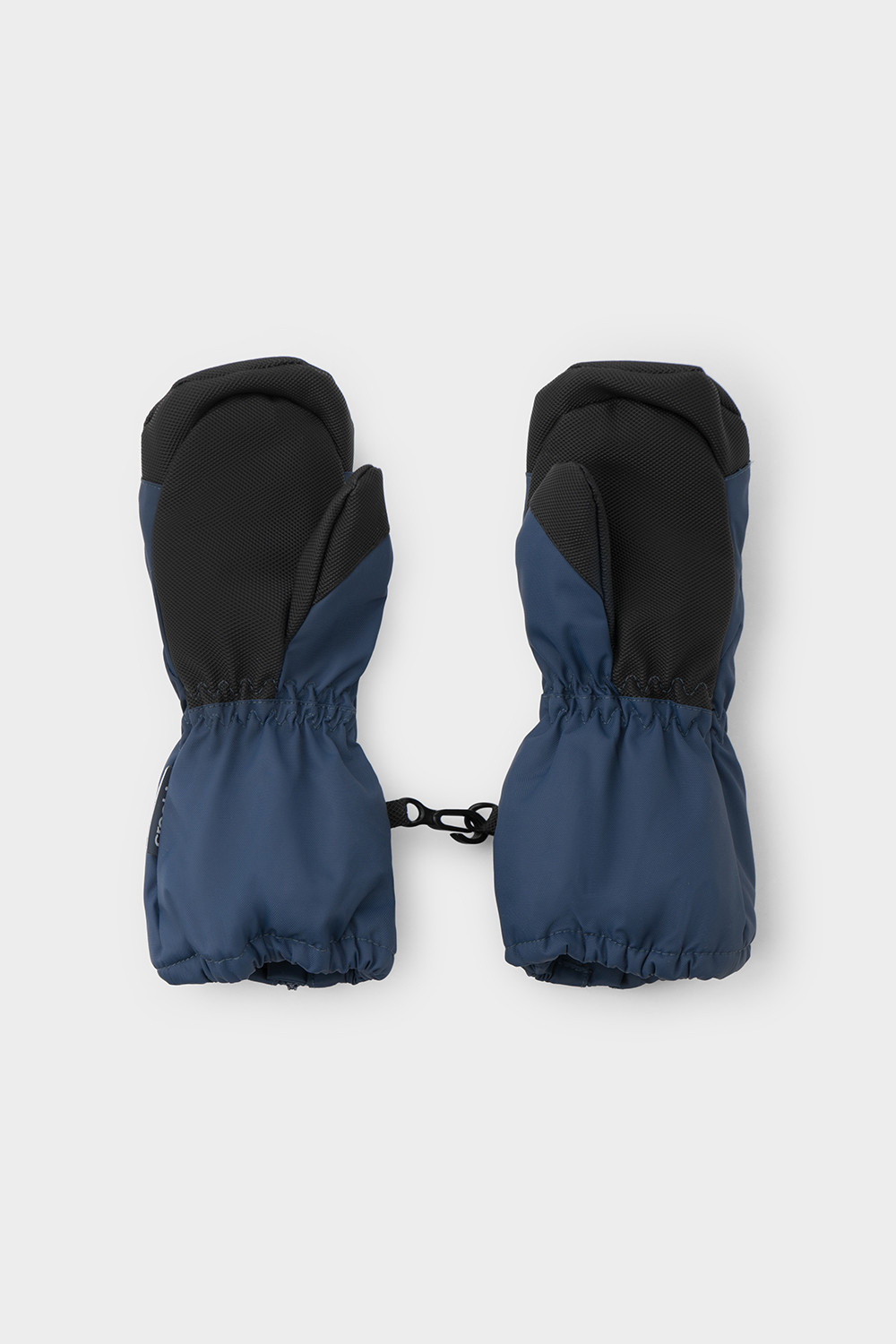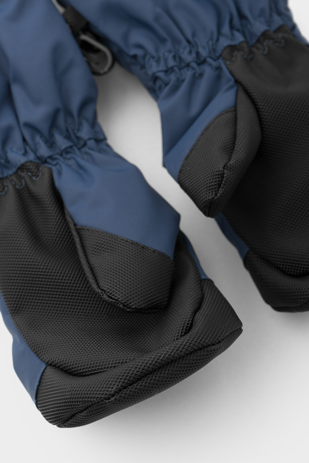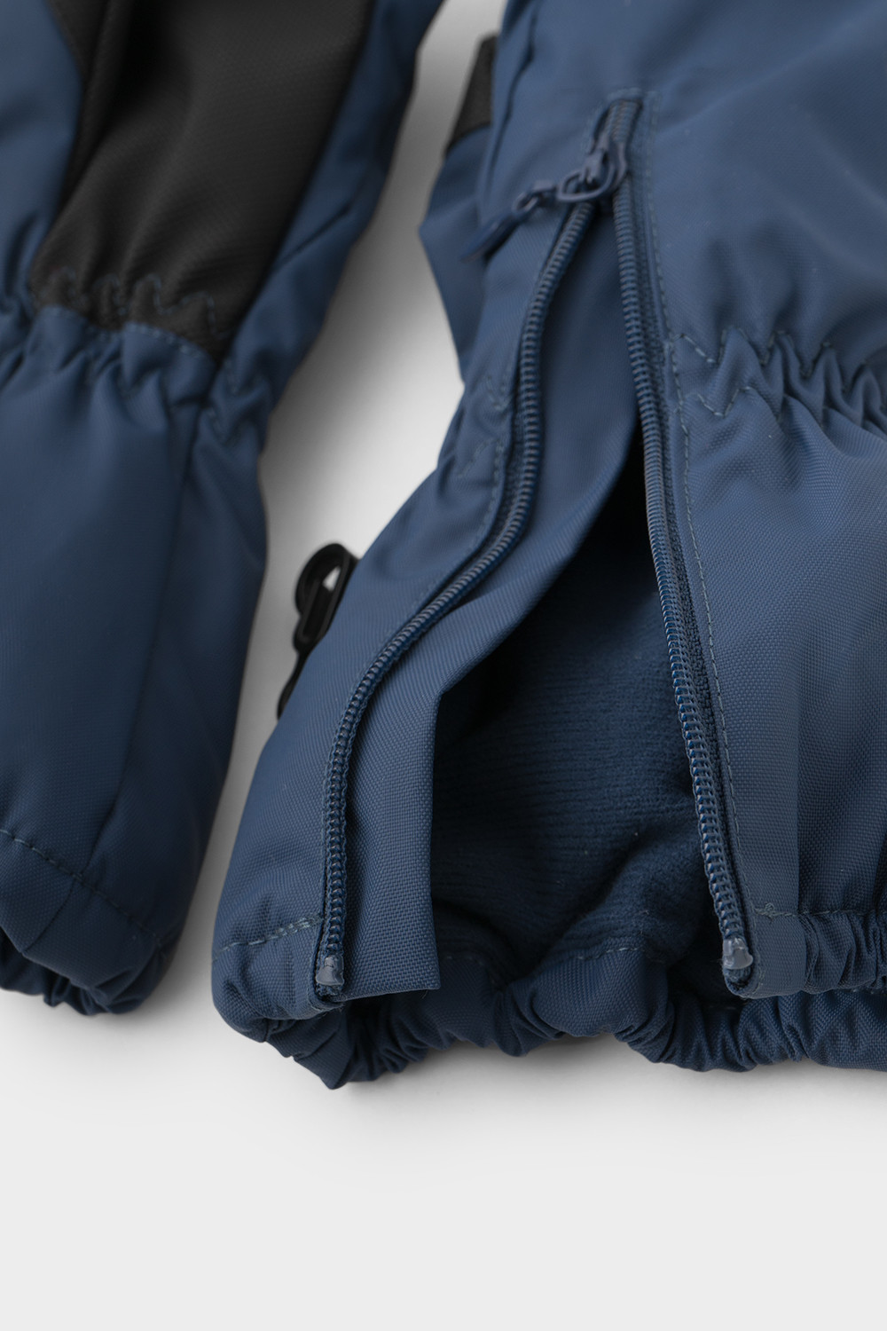 Детские утеплённые рукавицы из однотонной мембранной ткани со вставками из искусственной кожи. Удлинённые манжеты на молнии. Мягкий подклад из флиса. Пластиковый карабин для скрепления рукавиц между собой. Светоотражающие элементы.
