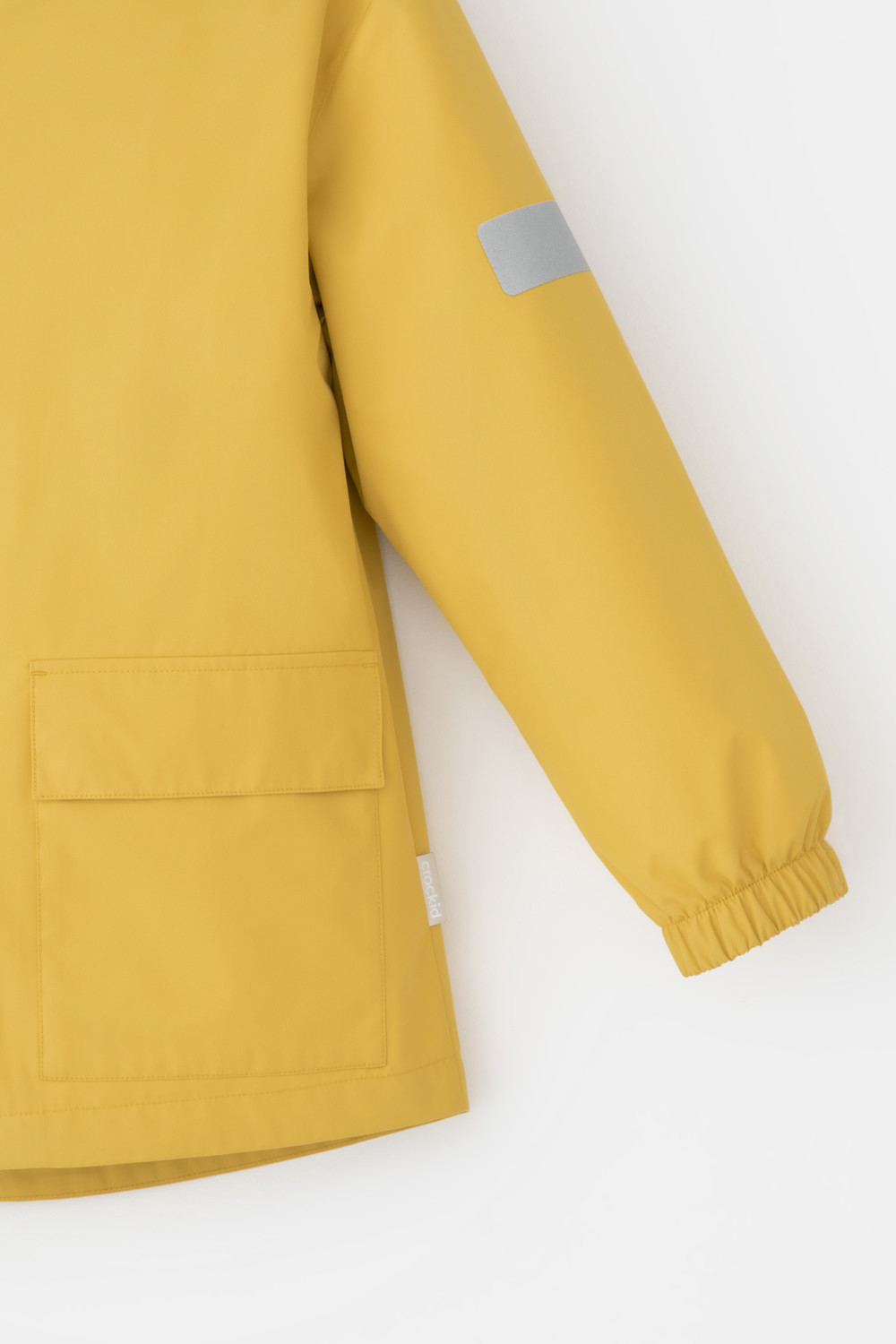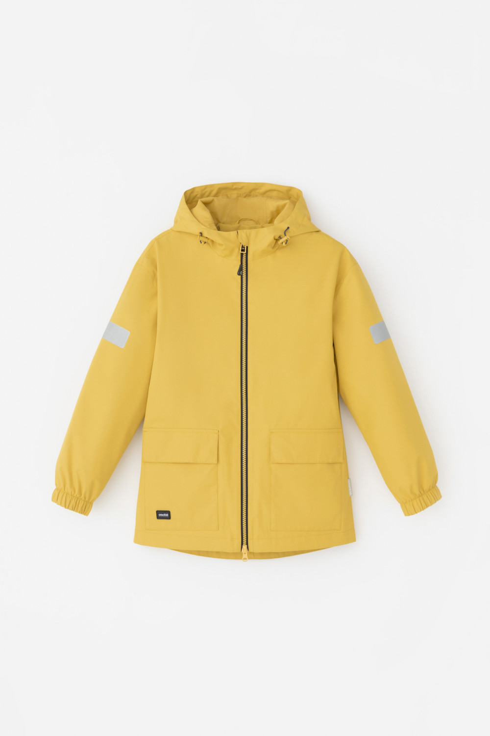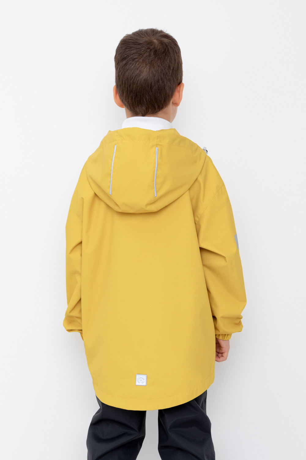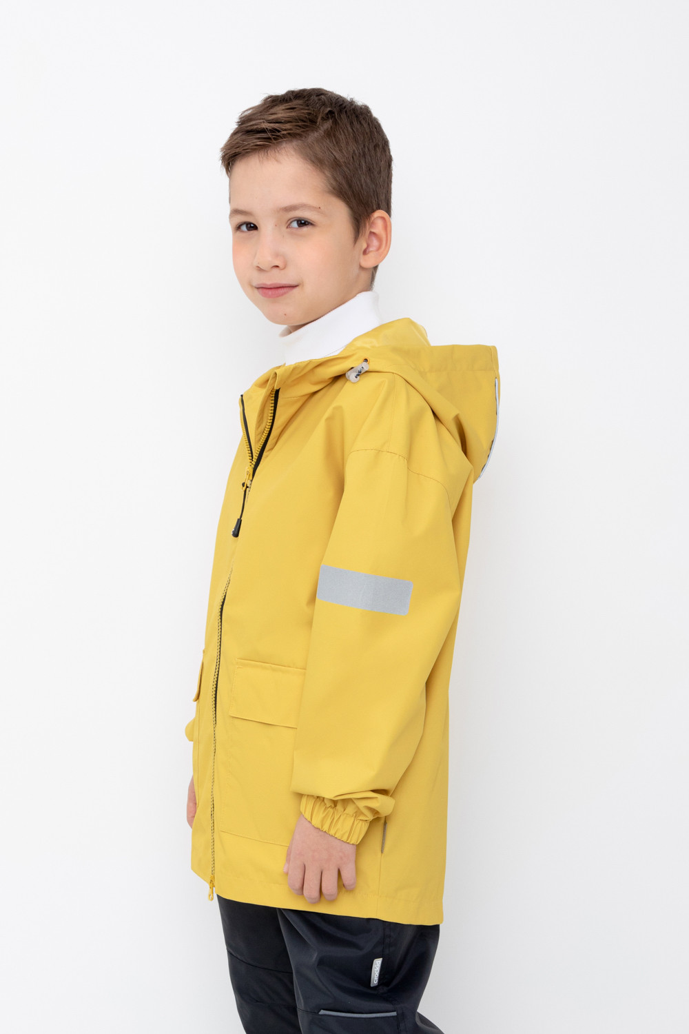 Куртка для мальчика без утеплителя. Верхняя мембранная ткань 1000/1000 с тефлоновым покрытием отталкивает воду и грязь и обладает «дышащими» свойствами. Подкладка из 100% полиэстера. Дополнительная ветрозащитная планка внутри. Застёгивается на молнию, предусмотрена защита подбородка. Капюшон не снимается, утгивается с помощью эластичного шнурка со стопперами. Манжеты на резинке. Спереди два накладных кармана с клапанами на магнитных кнопках. Светоотражающие элементы служат для безопасности в тёмное время суток.