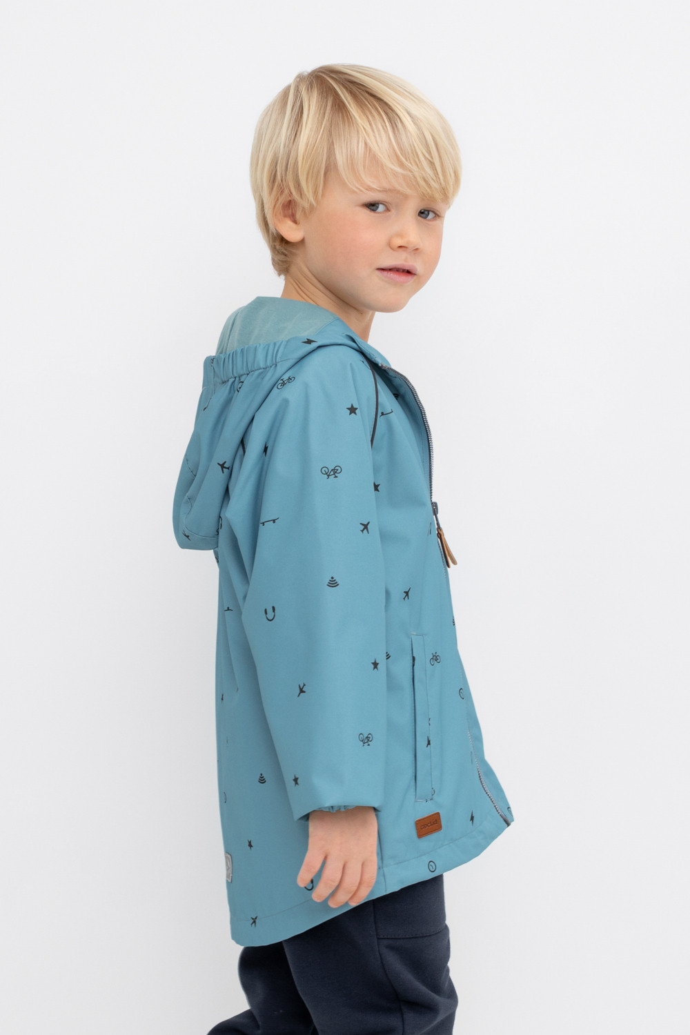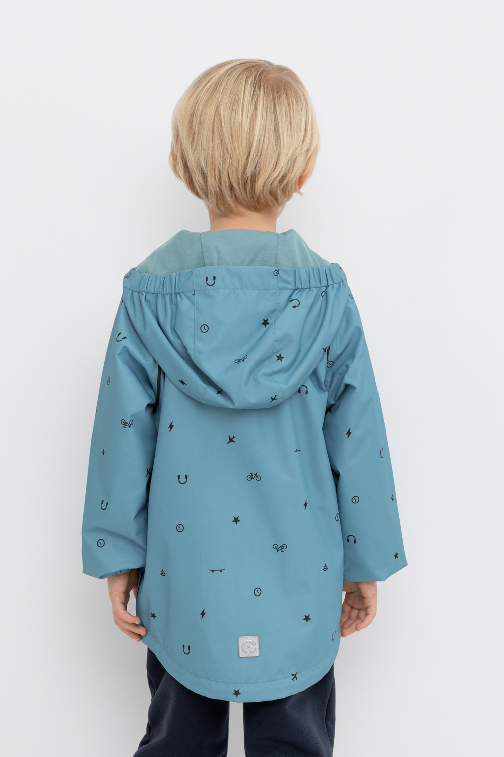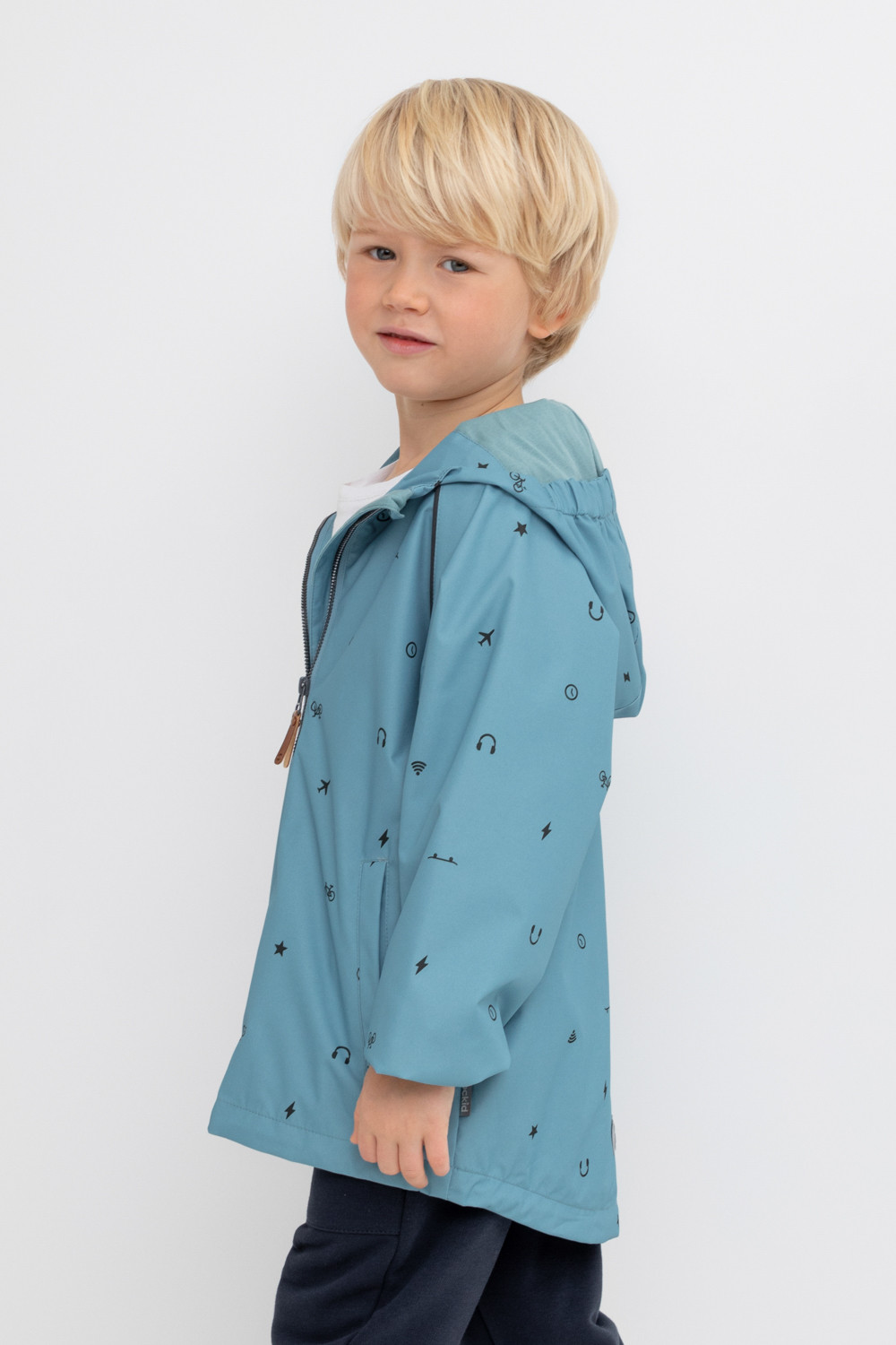 Ветровка для мальчика из мембранной ткани с дополнительной тефлоновой обработкой.  Верхняя мембранная ткань 1000/1000 с тефлоновым покрытием отталкивает воду и грязь и обладает «дышащими» свойствами. Подкладка выполнена 60% хлопка и 40% полиэстера. У изделия предусмотрена защита подбородка. Несъемный капюшон регулируется с помощью эластичного шнура со стопперами. Низ рукавов имеет эластичную резинку для лучшего прилегания. Во всех изделиях верхнего ассортимента для безопасности ребенка предусмотрены светоотражающие элементы.