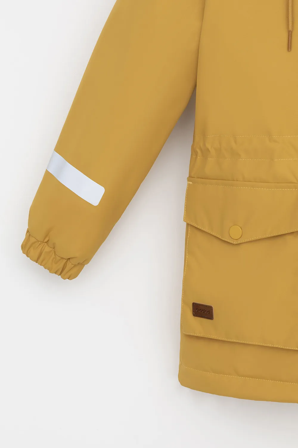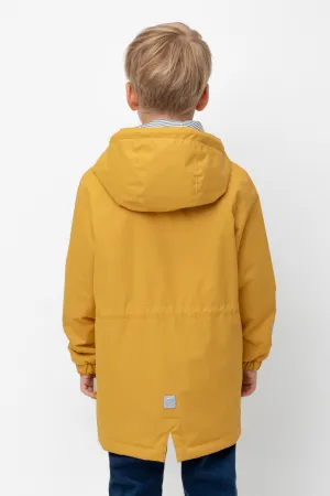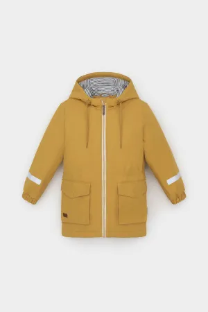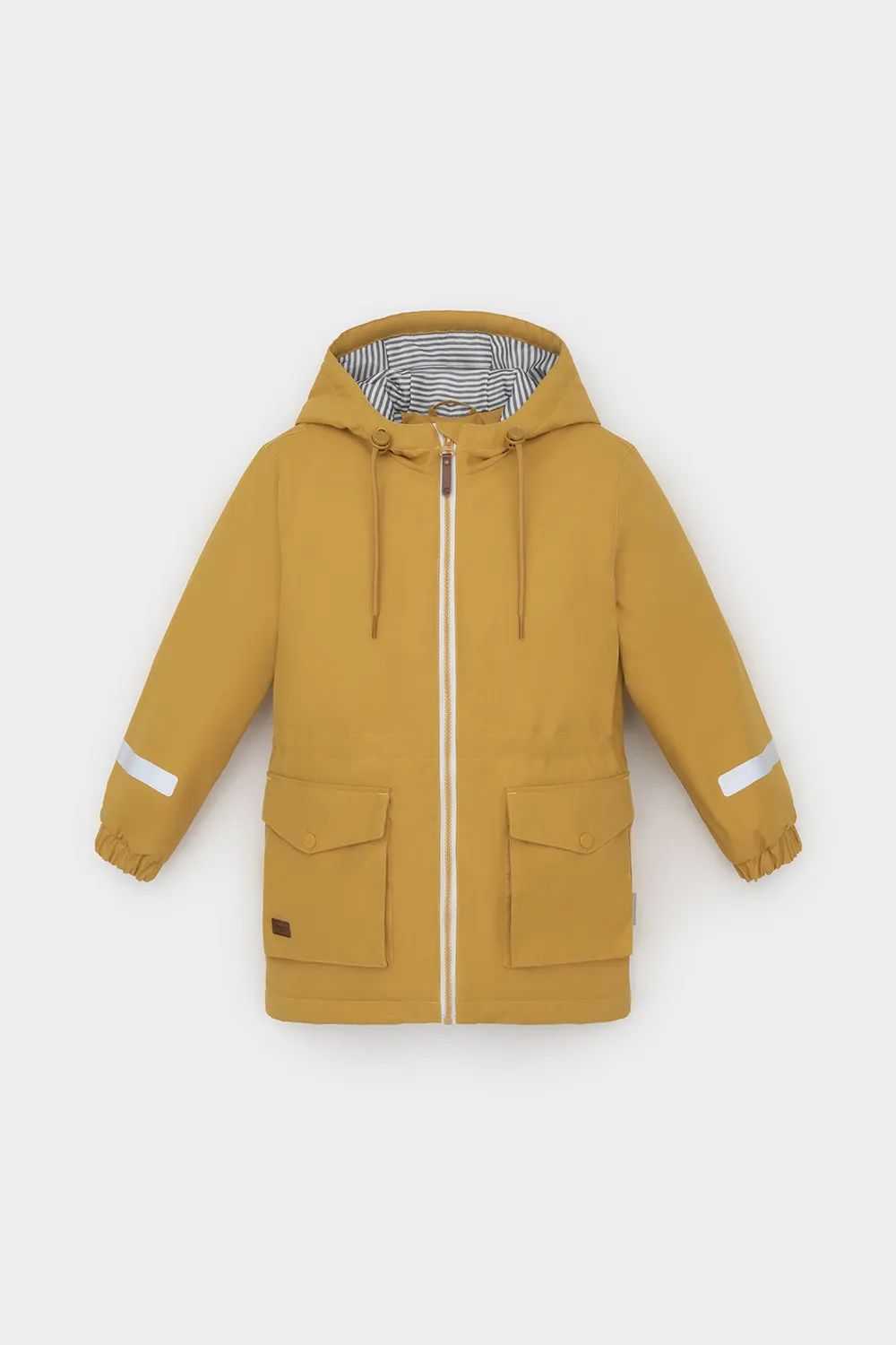 Демисезонная куртка для мальчика с утеплителем SEE®: 120 г/м2. Выполнена из мембранной ткани с дополнительной тефлоновой обработкой. Данный вид обработки предохраняет изделие от загрязнения и лучше отводит влагу. Подклад из 100% полиэстера. У изделия предусмотрена защита подбородка. Несъемный капюшон имеет эластичную утяжку со стопперами. Низ рукавов на эластичной резинке для лучшего прилегания. На талии утяжка при помощи шнура со стопперами. По бокам два накладных кармана с клапанами. Во всех изделиях верхнего ассортимента для безопасности ребенка предусмотрены светоотражающие элементы.