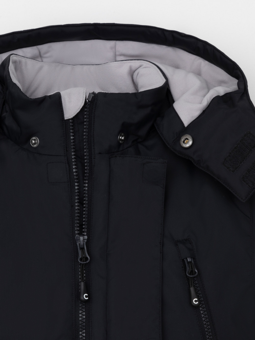 Зимняя куртка для мальчика с утеплителем  SEE®: 250 г/м2. Выполнена из мембранной ткани с дополнительной тефлоновой обработкой, которая предохраняет изделие от загрязнений и отталкивает влагу. Подклад выполнен из 100% полиэстера Tricot. Куртка застёгивается на молнию и внешнюю планку с магнитными кнопками, предусмотрена защита подбородка. Съёмный капюшон на кнопках и липучках имеет эластичную утяжку со стопперами. На рукавах внутренние эластичные манжеты. Два накладных кармана с клапанами по бокам и два кармана с молниями на груди. По талии эластичная утяжка со стопперами. Во всех изделиях верхнего ассортимента для безопасности ребёнка предусмотрены светоотражающие элементы.
