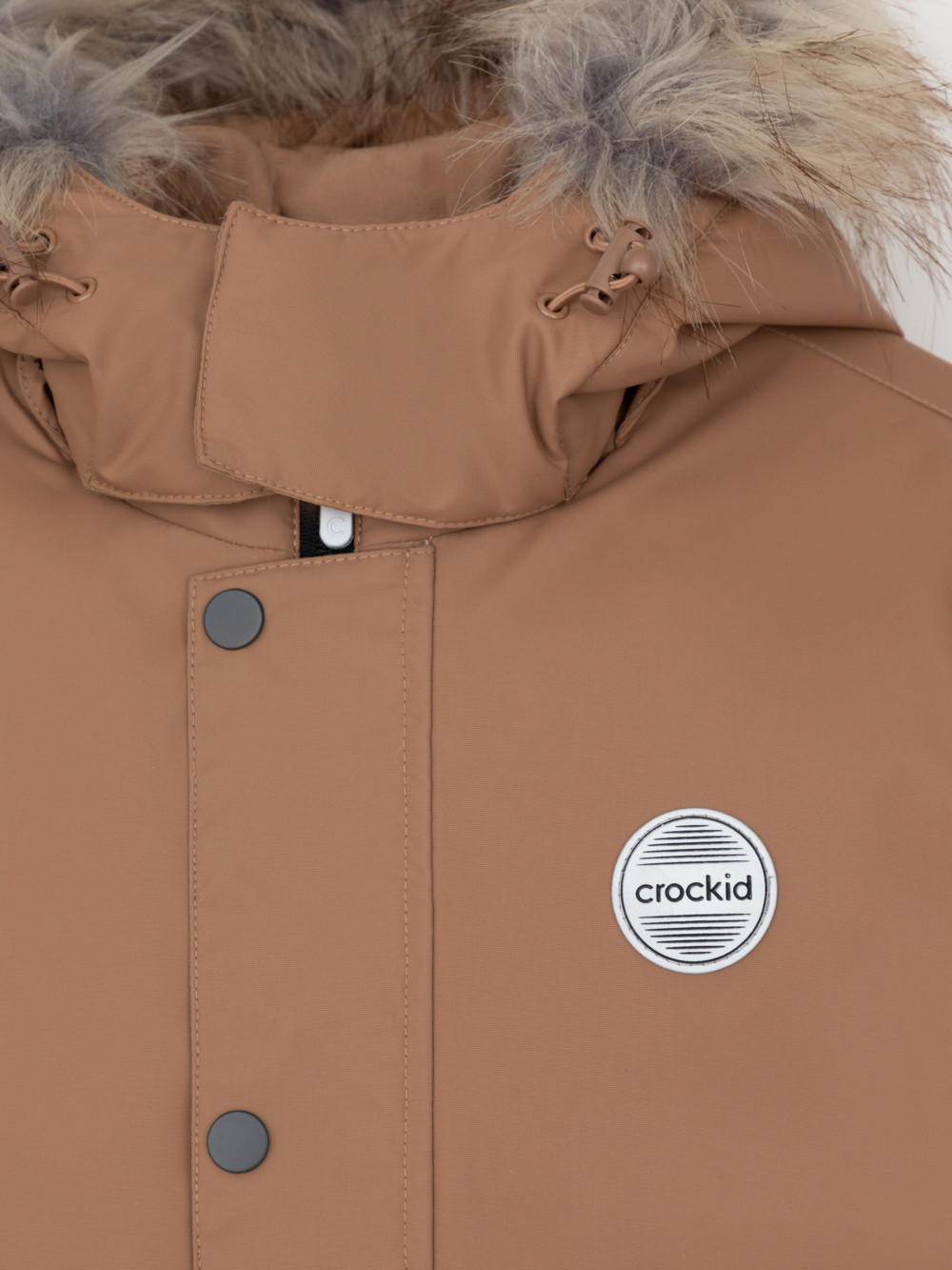 Зимняя парка для мальчика с утеплителем  SEE®: 250 г/м2. Выполнена из мембранной ткани с дополнительной тефлоновой обработкой, которая предохраняет изделие от загрязнений и отталкивает влагу. Подклад выполнен из 100% полиэстера Tricot. Парка застёгивается на молнию и внешнюю планку с металлическими кнопками, предусмотрена защита подбородка. Съёмный капюшон на кнопках и липучках имеет эластичную утяжку со стопперами и отстёгивающуюся опушку из искусственного меха. На рукавах внутренние эластичные манжеты. Два накладных кармана с клапанами по бокам. По талии эластичная утяжка со стопперами. Во всех изделиях верхнего ассортимента для безопасности ребёнка предусмотрены светоотражающие элементы.