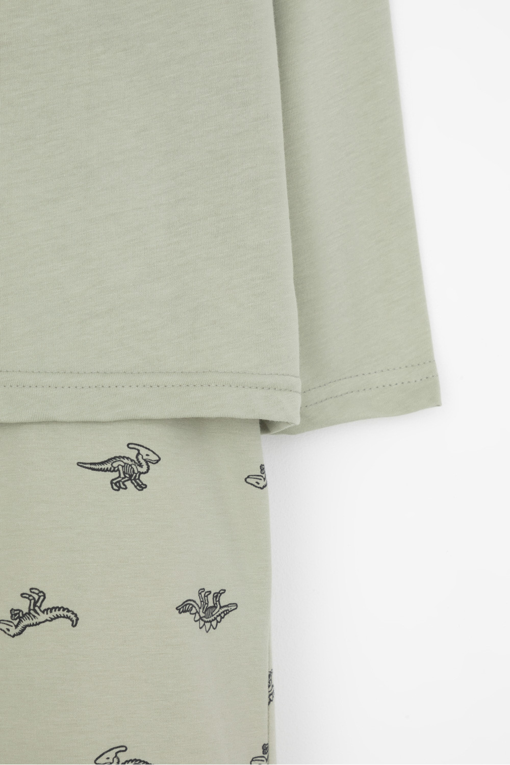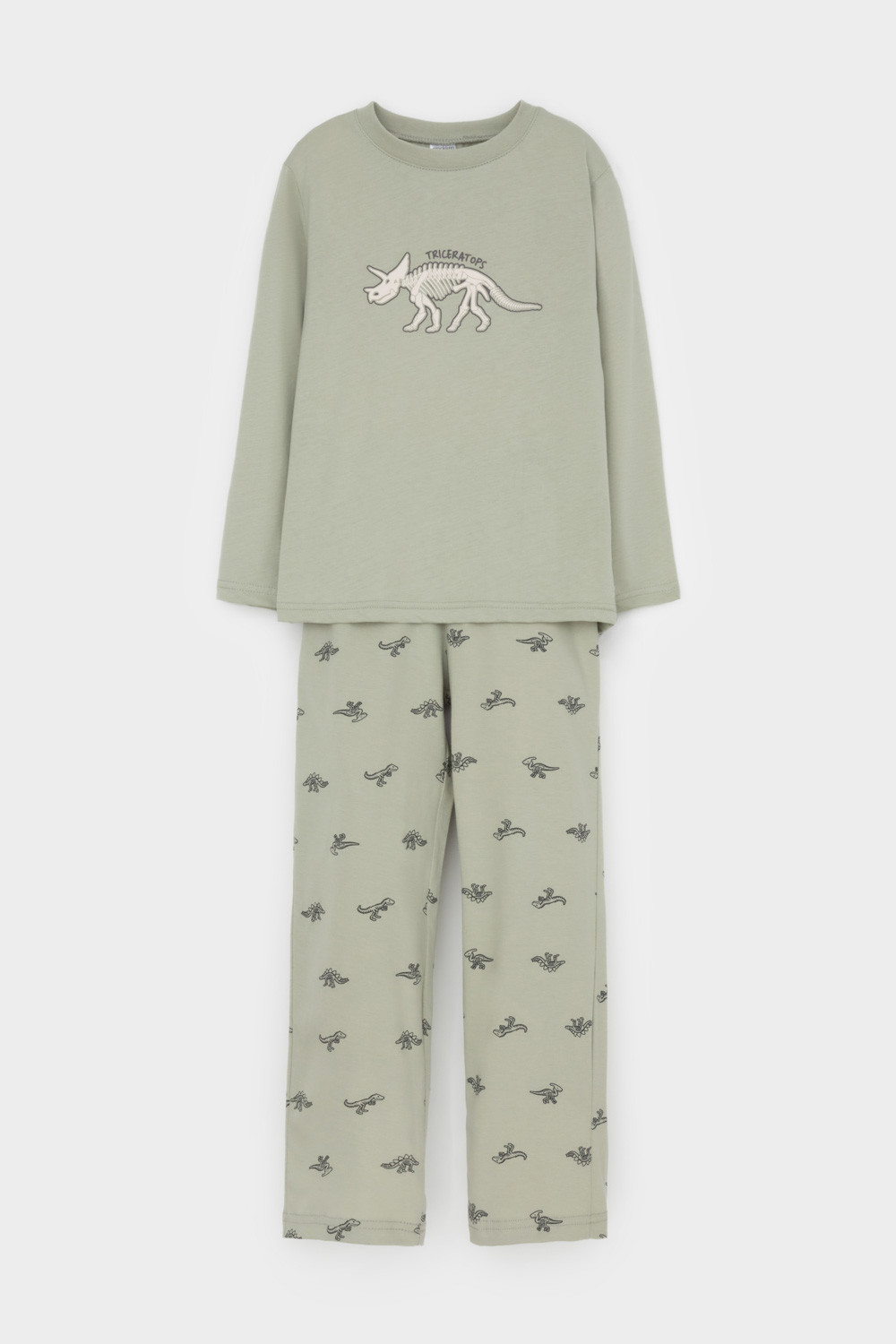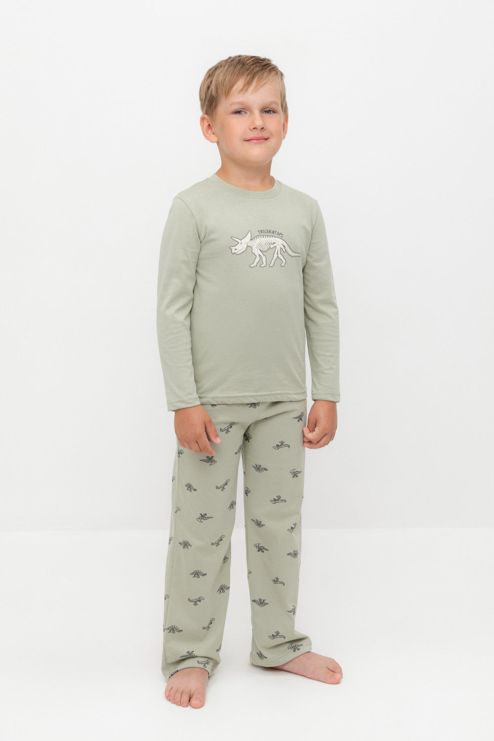 Трикотажная пижама из натурального хлопка.  Джемпер с длинными рукавами с принтом. У брюк эластичный пояс на резинке. Оригинальные принт и набивка выполнены из стойких, гипоаллергенных текстильных красителей. Пижама сохраняет цвет и форму после многократных стирок. Все трикотажные полотна производятся в соответсвии с нормами Швейцарского сертификата ЭкоТекс.