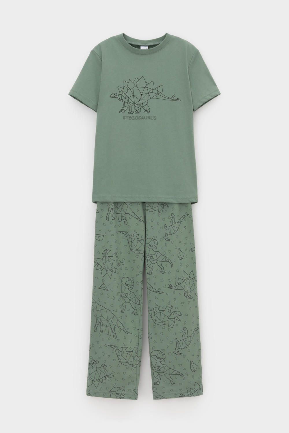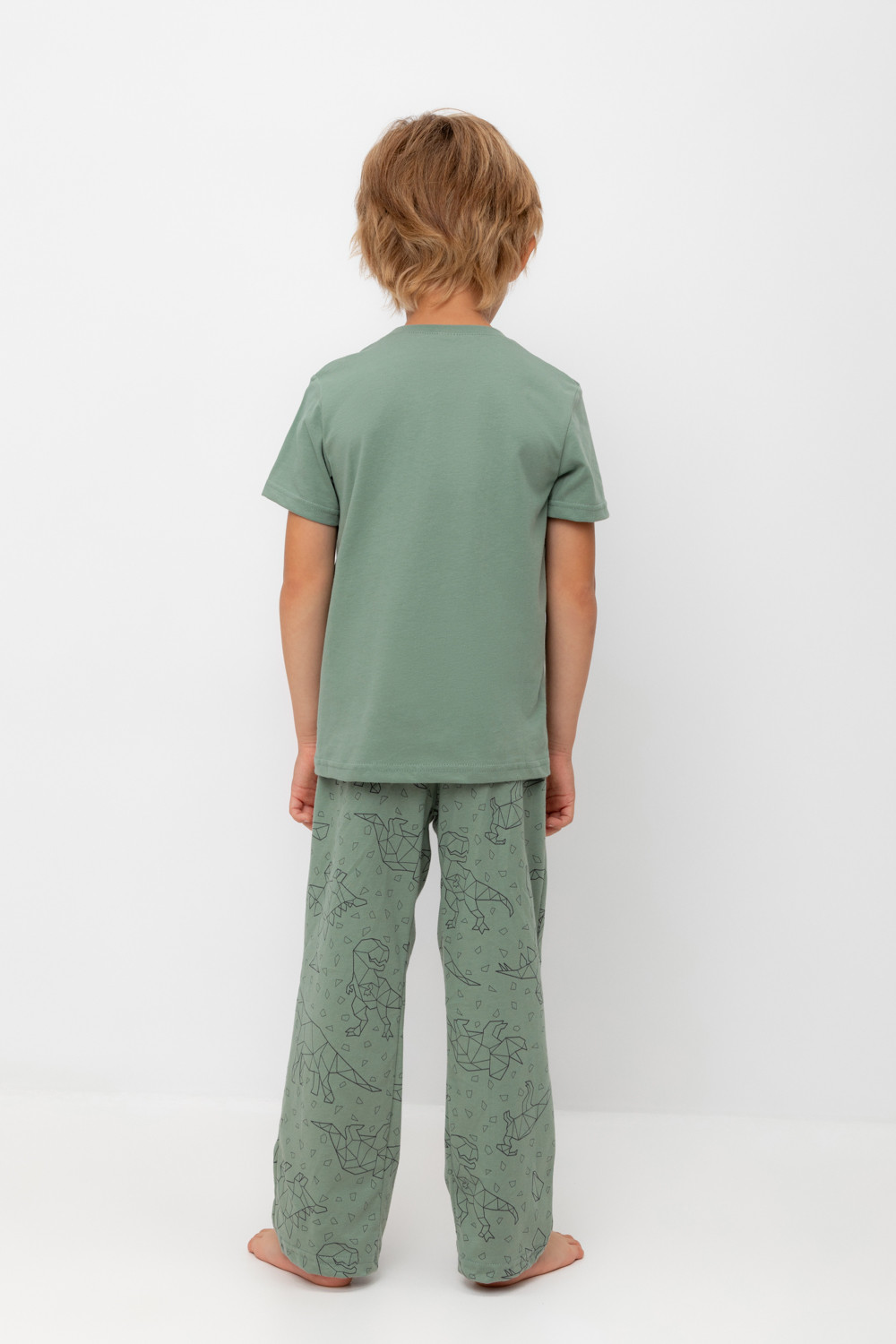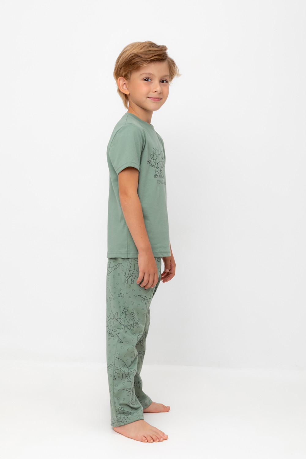 Трикотажная пижама из натурального хлопка.  Футболка с короткими рукавами с принтом. У брюк эластичный пояс на резинке. Оригинальные принт и набивка выполнены из стойких, гипоаллергенных текстильных красителей. Пижама сохраняет цвет и форму после многократных стирок. Все трикотажные полотна производятся в соответсвии с нормами Швейцарского сертификата ЭкоТекс.
