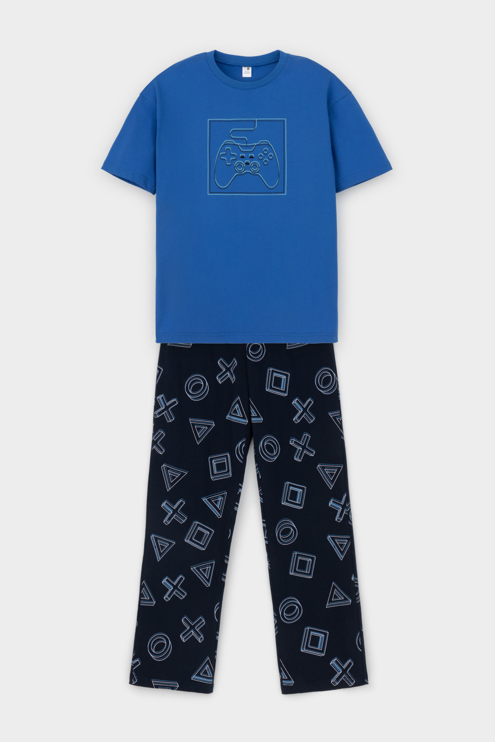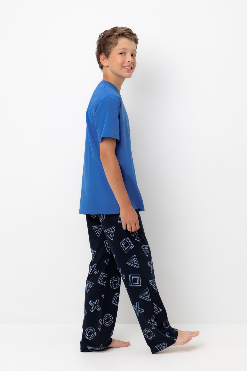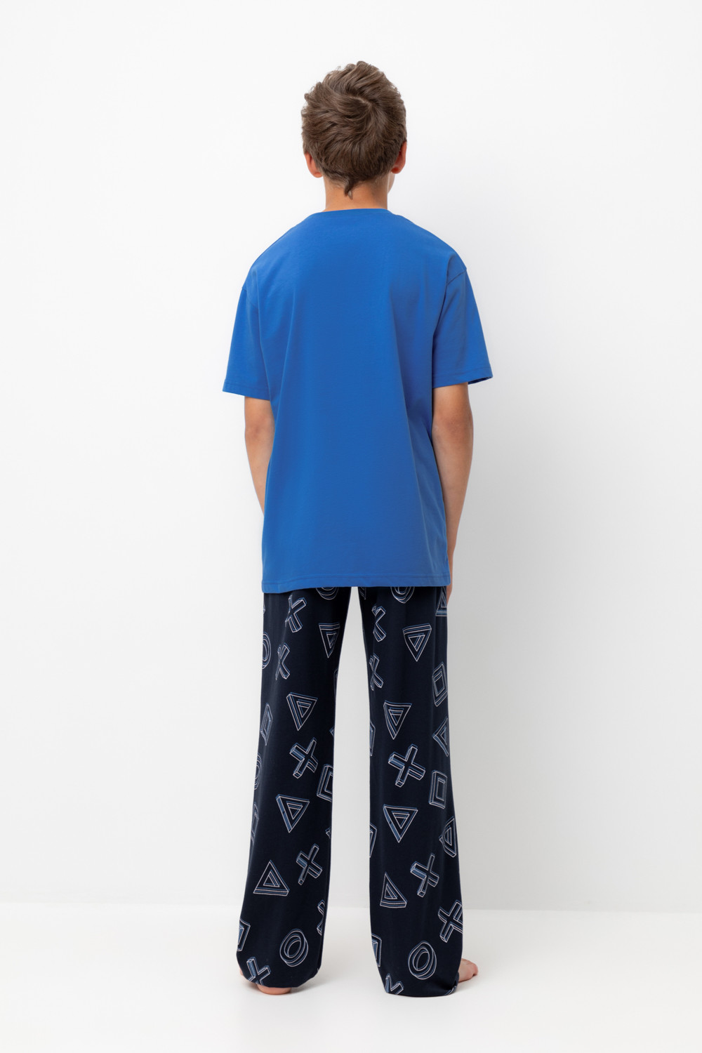 Трикотажный пижамный комплект из натурального хлопка. У футболки короткие рукава. Брюки с удобным поясом на резинке и утягивающим плетеным шнуром. Оригинальная набивка и принт выполнены из стойких, гипоаллергенных текстильных красителей. Все трикотажные полотна производятся в соответствии с нормами Швейцарского сертификата ЭкоТекс.