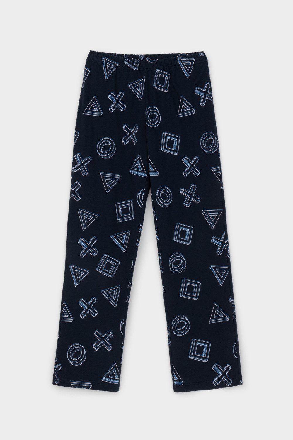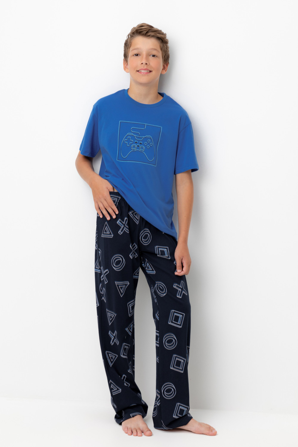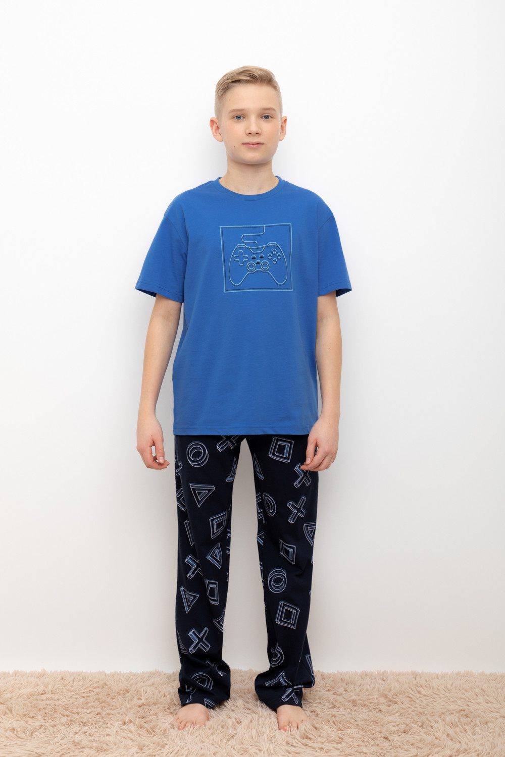 Трикотажный пижамный комплект из натурального хлопка. У футболки короткие рукава. Брюки с удобным поясом на резинке и утягивающим плетеным шнуром. Оригинальная набивка и принт выполнены из стойких, гипоаллергенных текстильных красителей. Все трикотажные полотна производятся в соответствии с нормами Швейцарского сертификата ЭкоТекс.