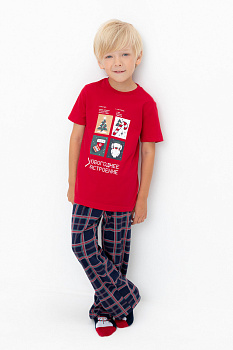 Трикотажная пижама из натурального хлопка. Футболка с короткими рукавами с принтом. У брюк эластичный пояс на резинке. Оригинальные принт и набивка выполнены из стойких, гипоаллергенных текстильных красителей. Пижама сохраняет цвет и форму после многократных стирок. Все трикотажные полотна производятся в соответсвии с нормами Швейцарского сертификата ЭкоТекс.