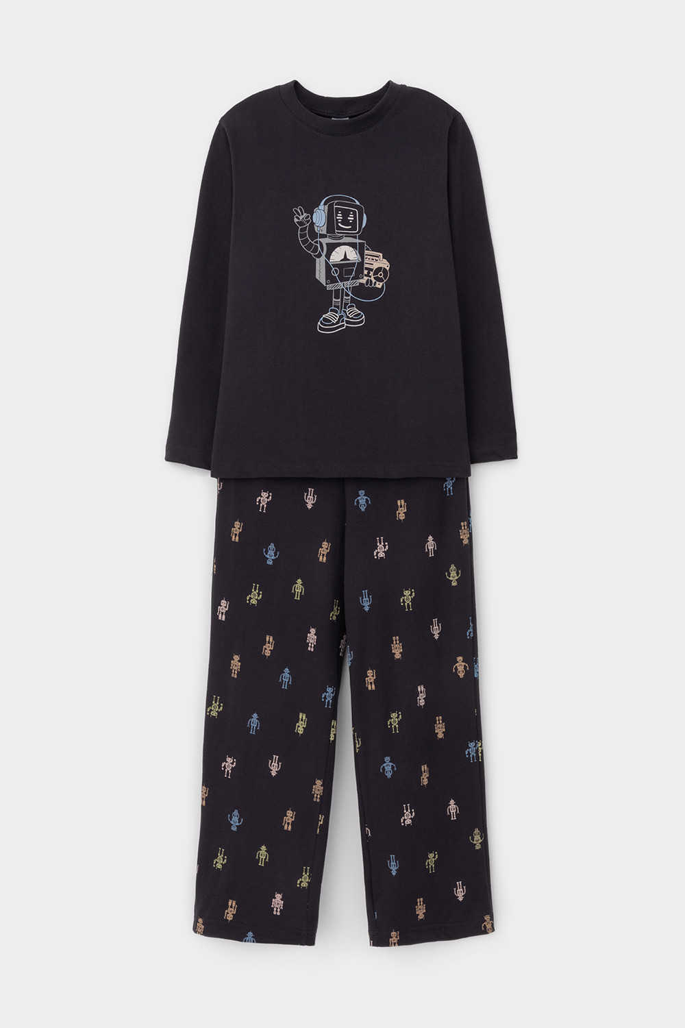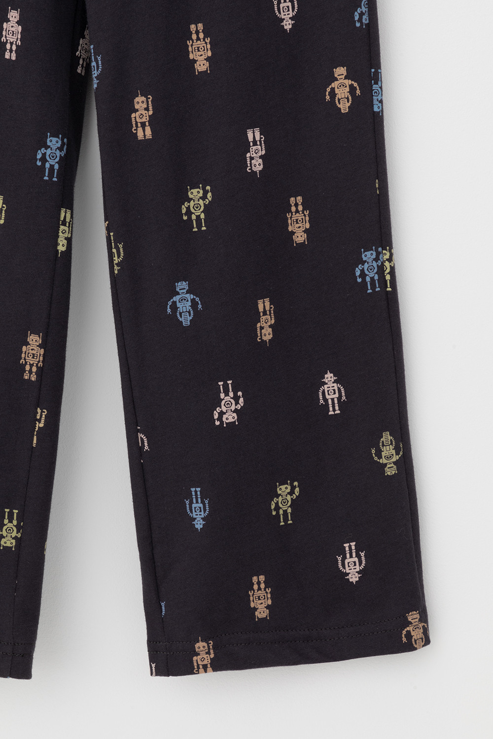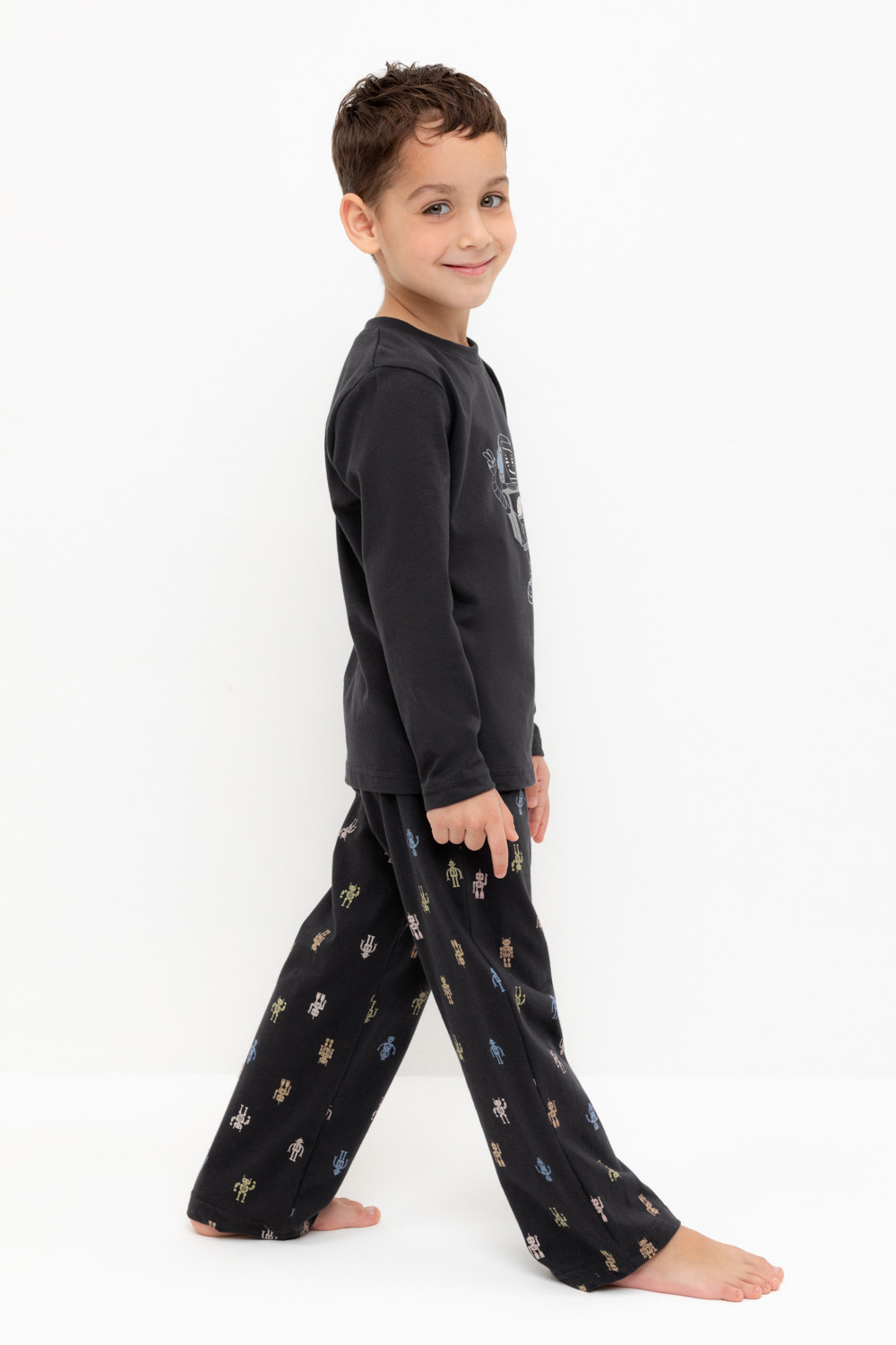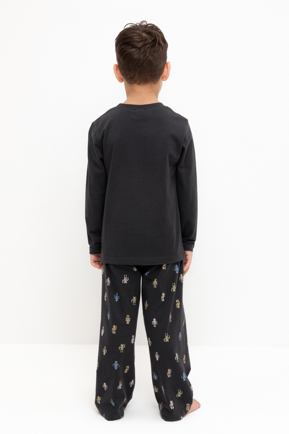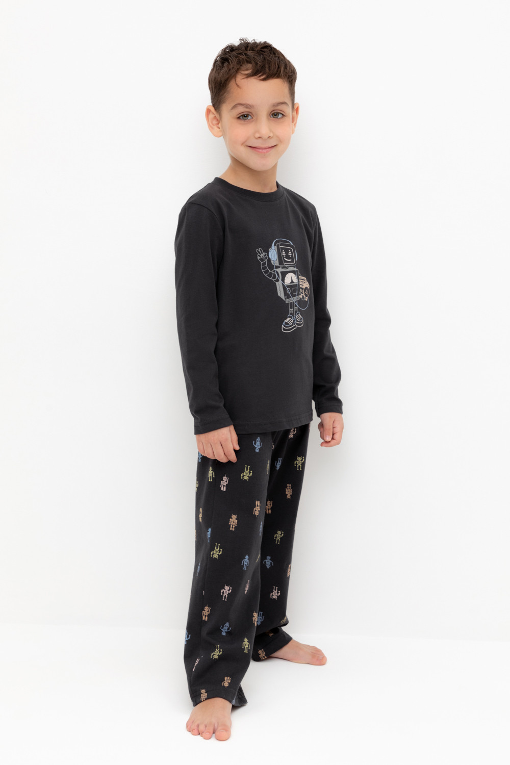 Трикотажная пижама из натурального хлопка. Джемпер с длинными рукавами с принтом. У брюк эластичный пояс на резинке. Оригинальные принт и набивка выполнены из стойких, гипоаллергенных текстильных красителей. Пижама сохраняет цвет и форму после многократных стирок. Все трикотажные полотна производятся в соответсвии с нормами Швейцарского сертификата ЭкоТекс.