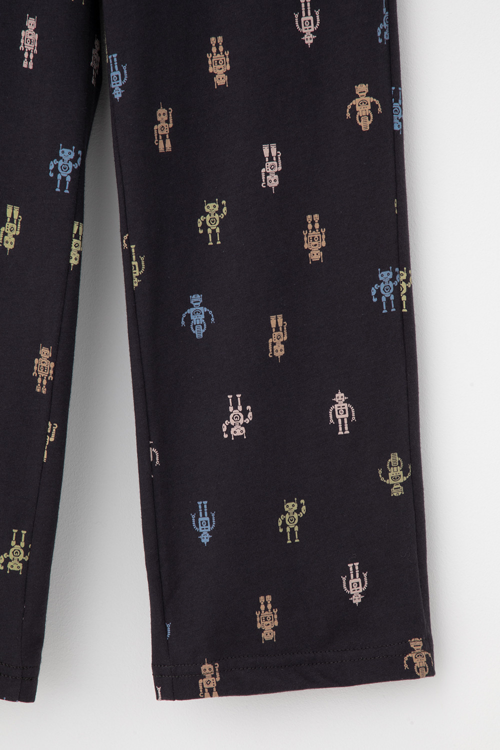 Трикотажная пижама из натурального хлопка. Футболка с короткими рукавами с принтом. У брюк эластичный пояс на резинке. Оригинальные принт и набивка выполнены из стойких, гипоаллергенных текстильных красителей. Пижама сохраняет цвет и форму после многократных стирок. Все трикотажные полотна производятся в соответсвии с нормами Швейцарского сертификата ЭкоТекс.