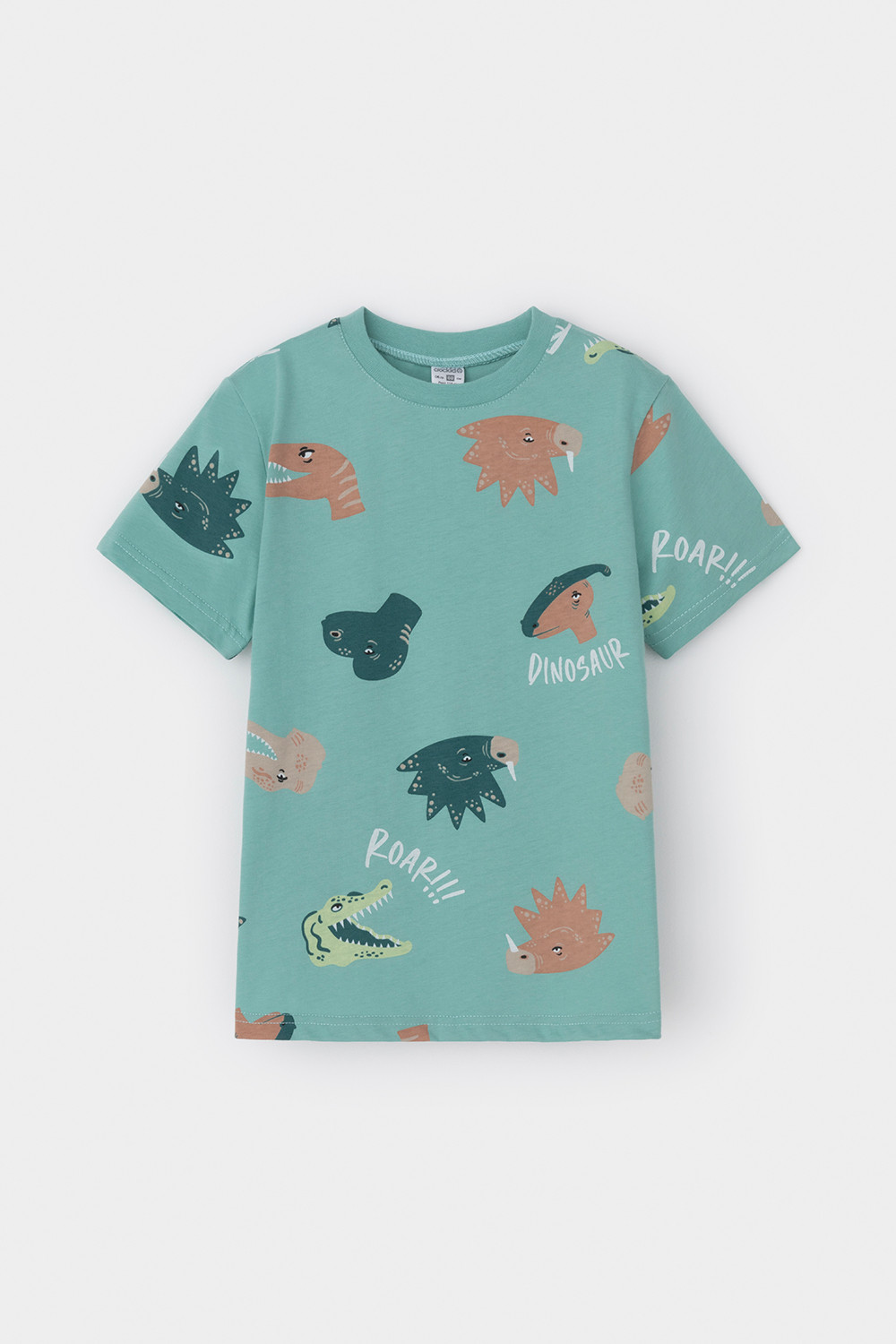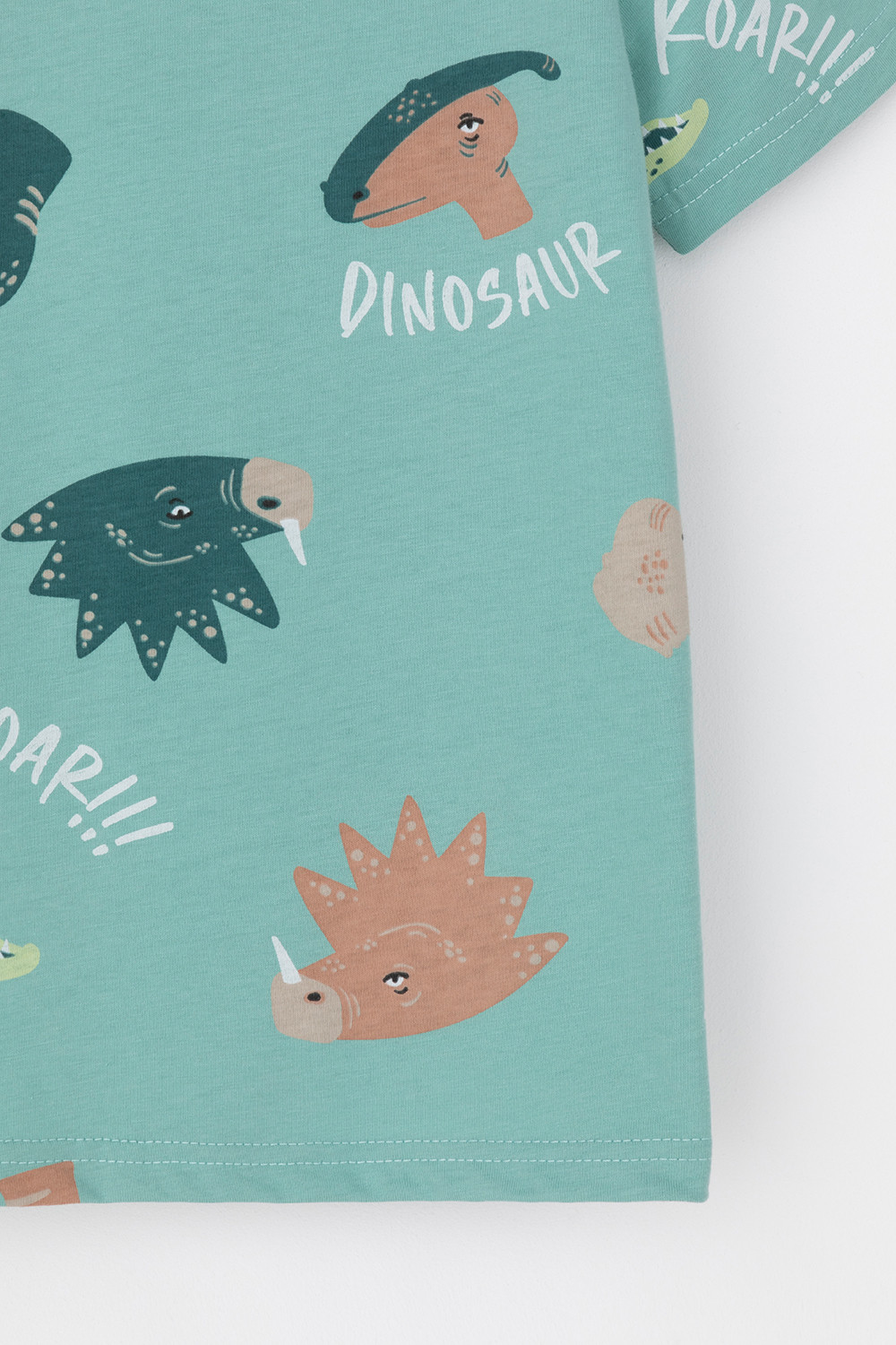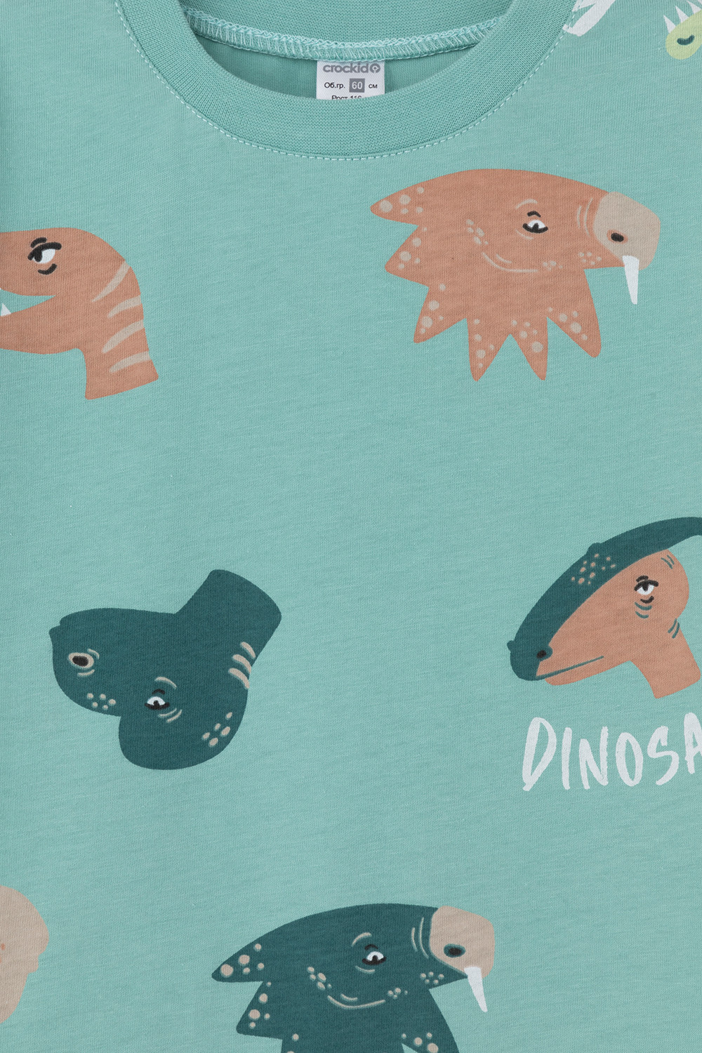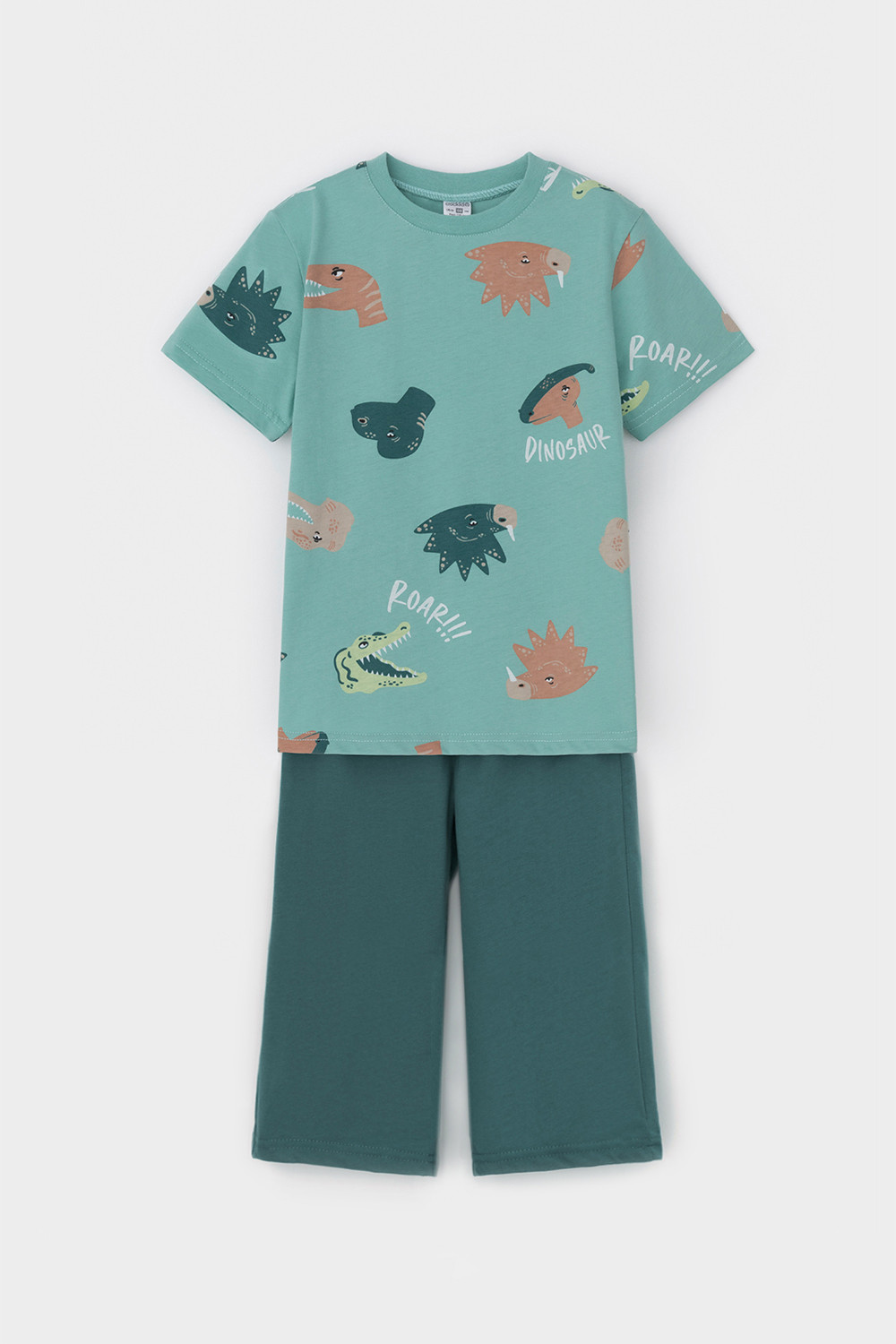 Трикотажная пижама из натурального хлопка. Футболка с короткими втачными рукавами и прямые брюки с эластичной резинкой в поясе. Оригинальная набивка выполнена из стойких гипоаллергенных текстильных гипоаллергенных красителей. Изделие сохраняет цвет и форму после многократных стирок. Все трикотажные полотна производятся в соответсвии с нормами швейцарского сертификата ЭкоТекс.