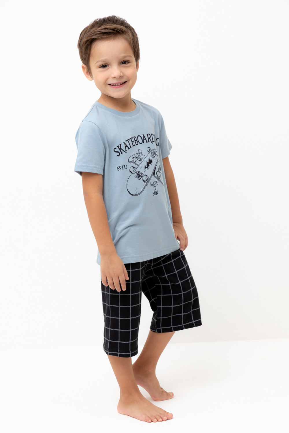 Трикотажная пижама из натурального хлопка. Футболка с короткими втачными рукавами и шорты с эластичной резинкой в поясе. Оригинальные набивка и принт выполнены из стойких гипоаллергенных текстильных гипоаллергенных красителей. Изделие сохраняет цвет и форму после многократных стирок. Все трикотажные полотна производятся в соответсвии с нормами швейцарского сертификата ЭкоТекс.