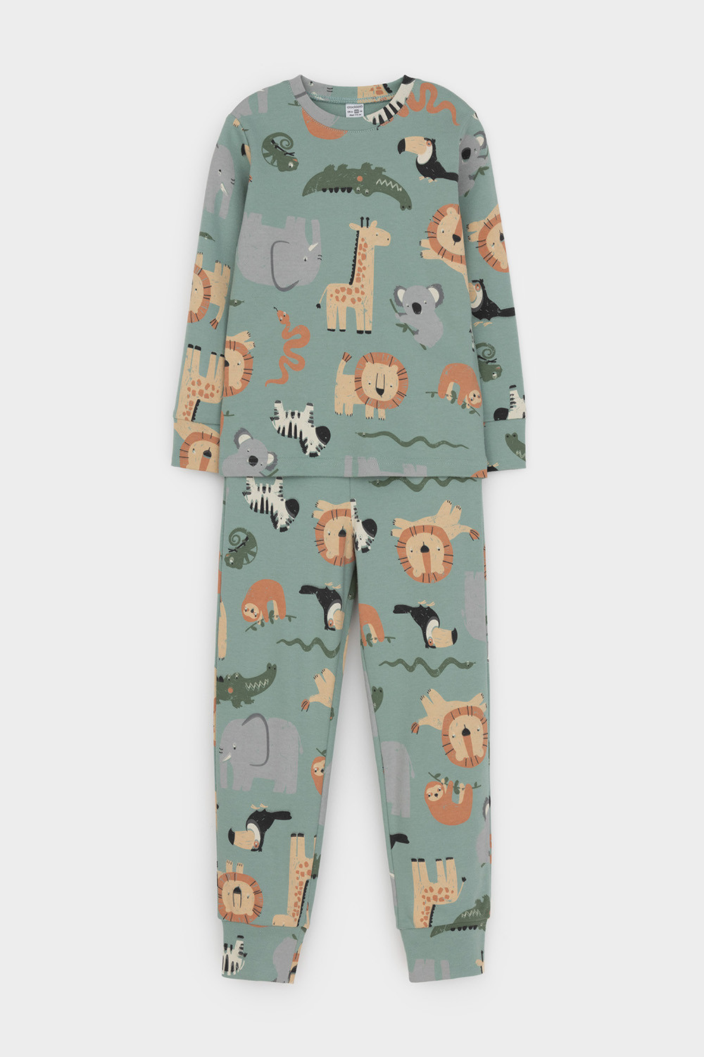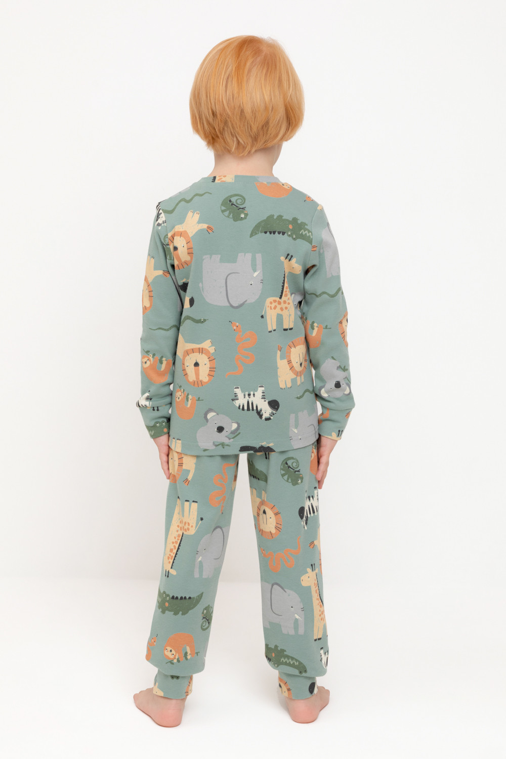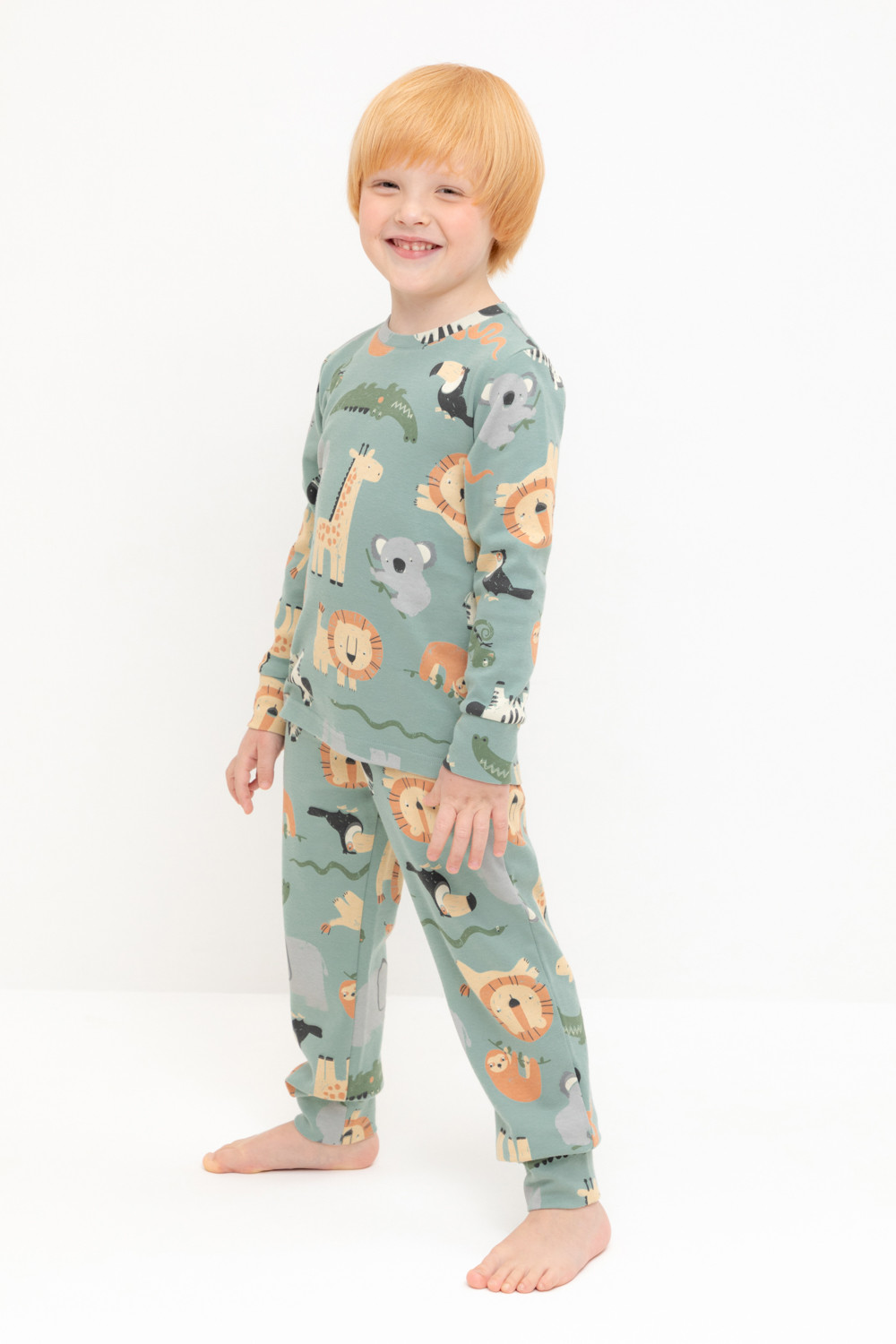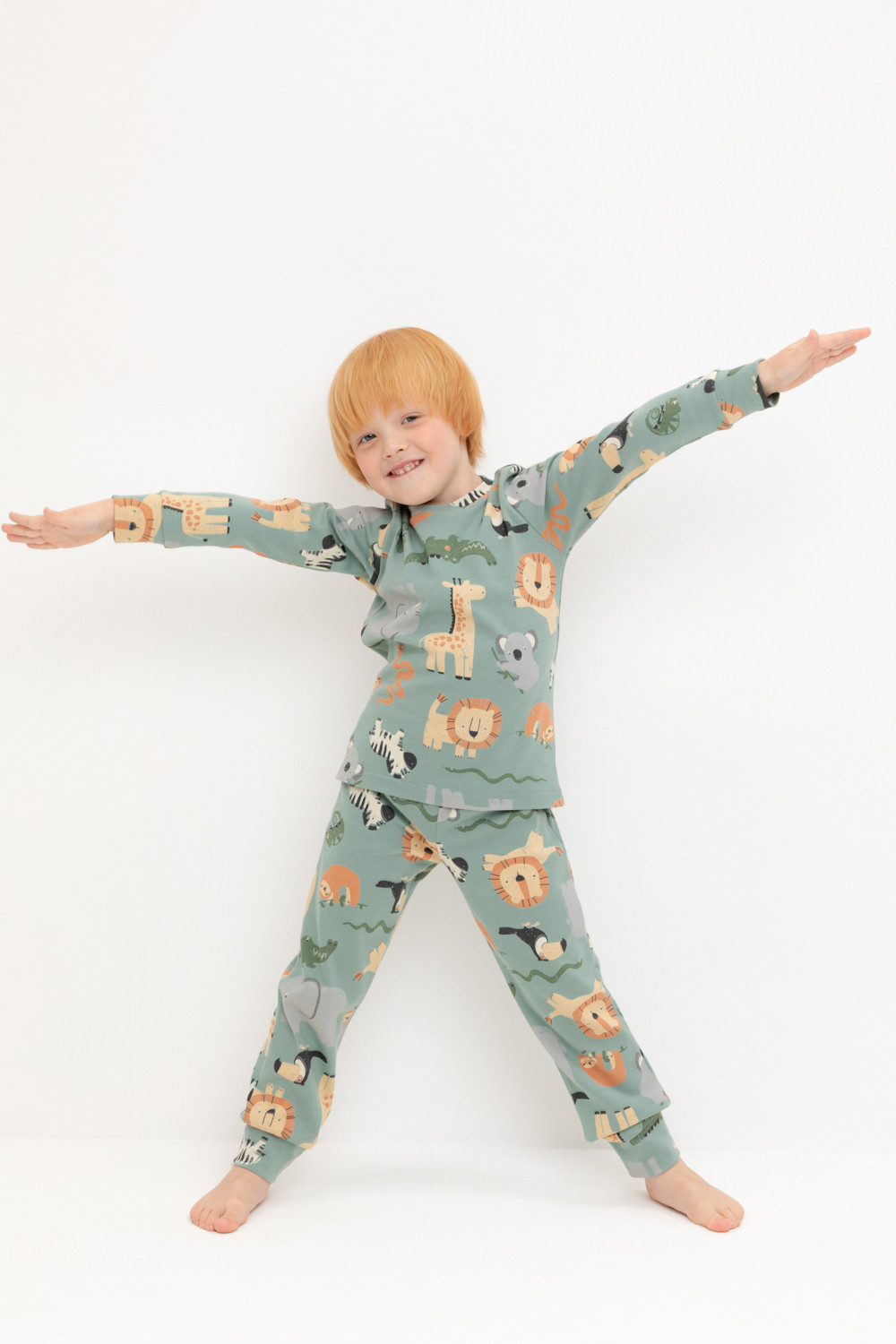 Трикотажная пижама из натурального хлопка. Джемпер с длинными втачными рукавами и брюки с эластичной резинкой в поясе. Мягкие манжеты на рукавах и по низу брюк. Оригинальная набивка выполнена из стойких текстильных гипоаллергенных красителей. Изделие сохраняет цвет и форму после многократных стирок. Все трикотажные полотна производятся в соответсвии с нормами швейцарского сертификата ЭкоТекс.