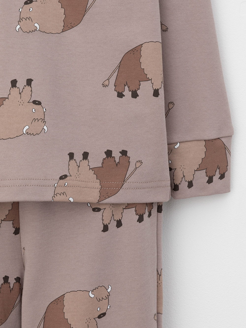 Трикотажная пижама из натурального хлопка. Джемпер с длинными втачными рукавами и брюки с эластичной резинкой в поясе. Мягкие манжеты на рукавах и по низу брюк. Оригинальная набивка выполнена из стойких текстильных гипоаллергенных красителей. Изделие сохраняет цвет и форму после многократных стирок. Все трикотажные полотна производятся в соответствии с нормами швейцарского сертификата ЭкоТекс.