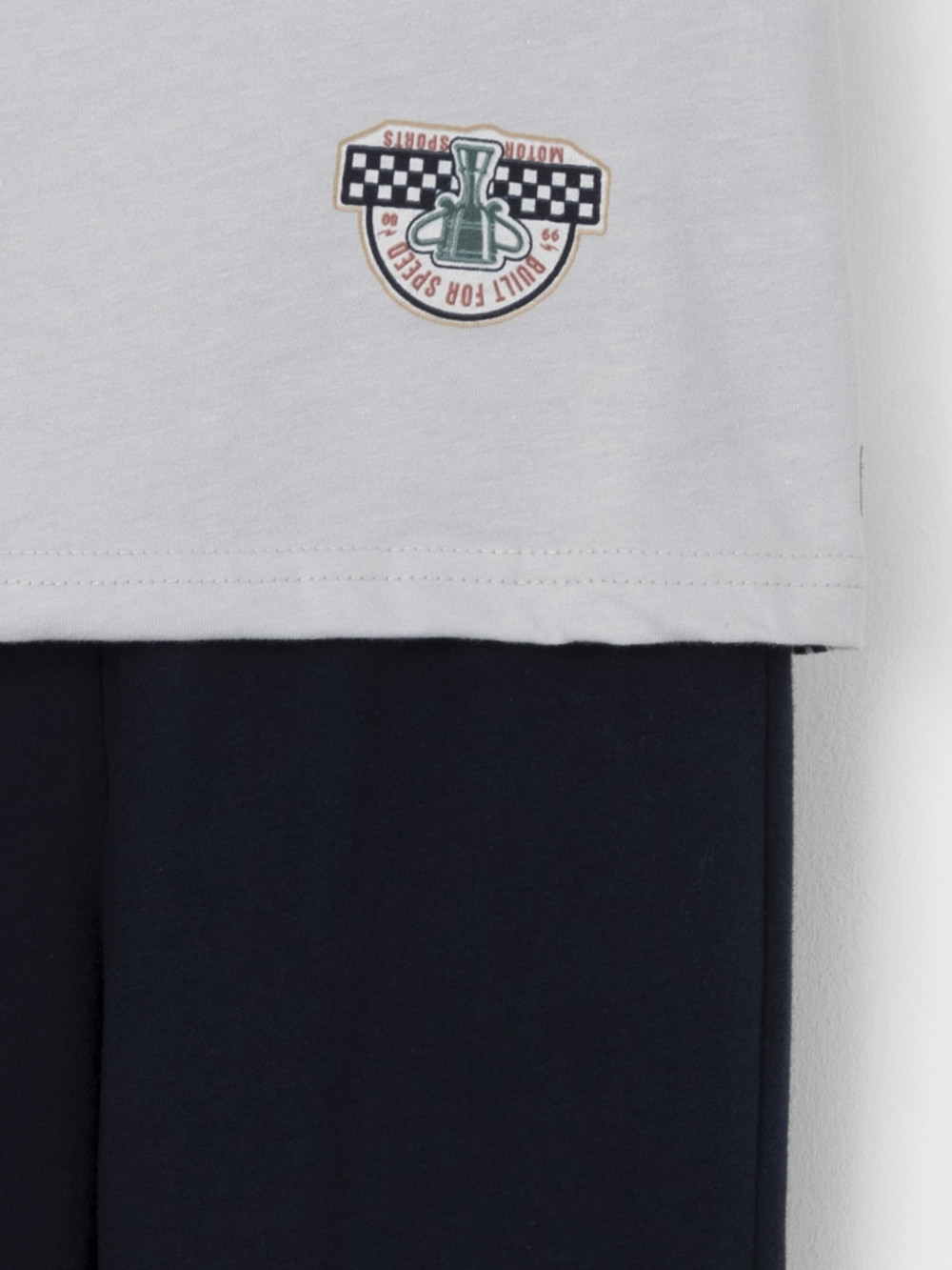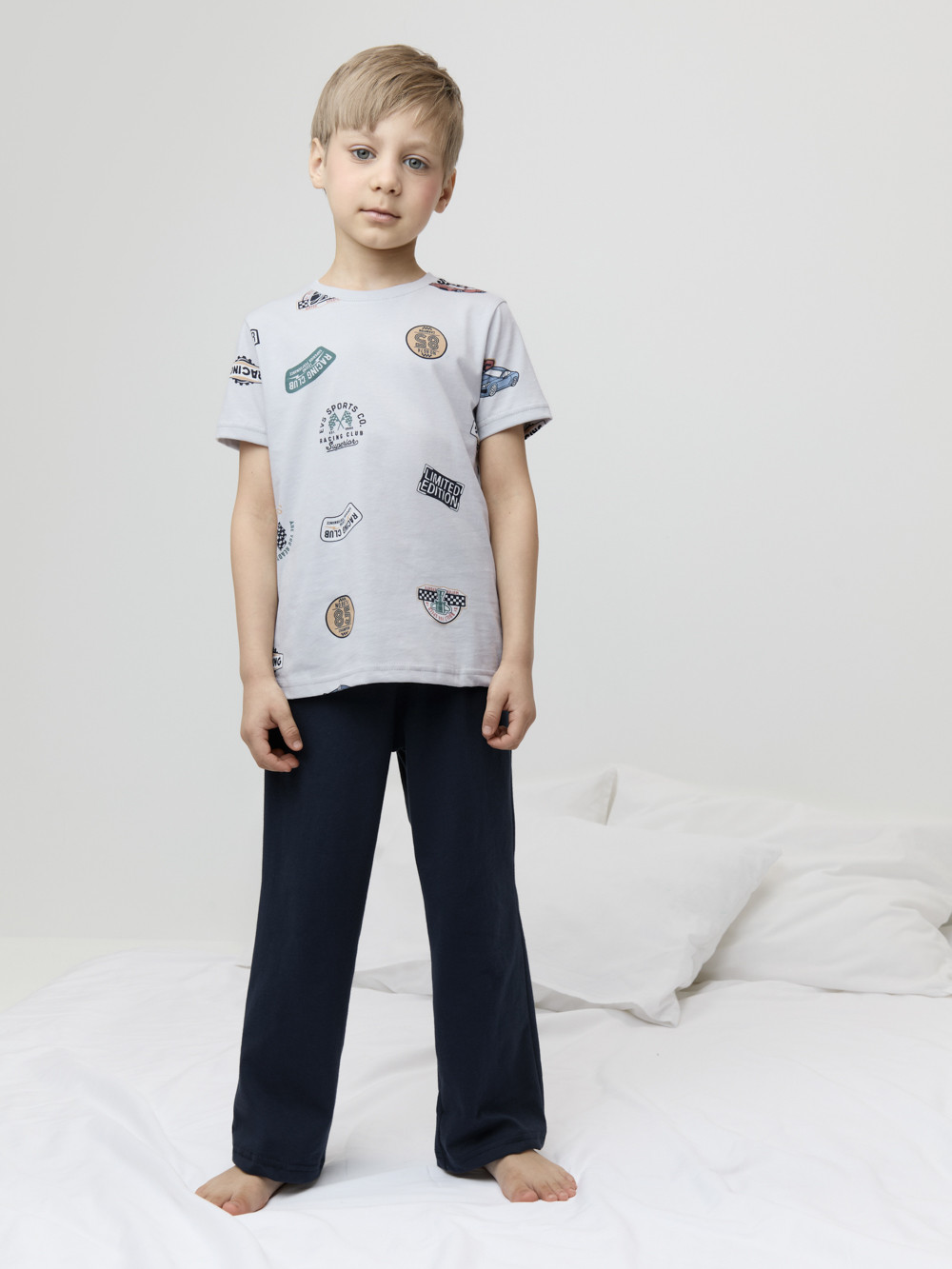 Пижама для мальчика из натурального хлопка. Футболка с короткими втачными рукавами и прямые брюки с эластичной резинкой в поясе. Оригинальная набивка выполнена из стойких текстильных гипоаллергенных красителей. Изделие сохраняет цвет и форму после многократных стирок. Все трикотажные полотна производятся в соответствии с нормами швейцарского сертификата ЭкоТекс.