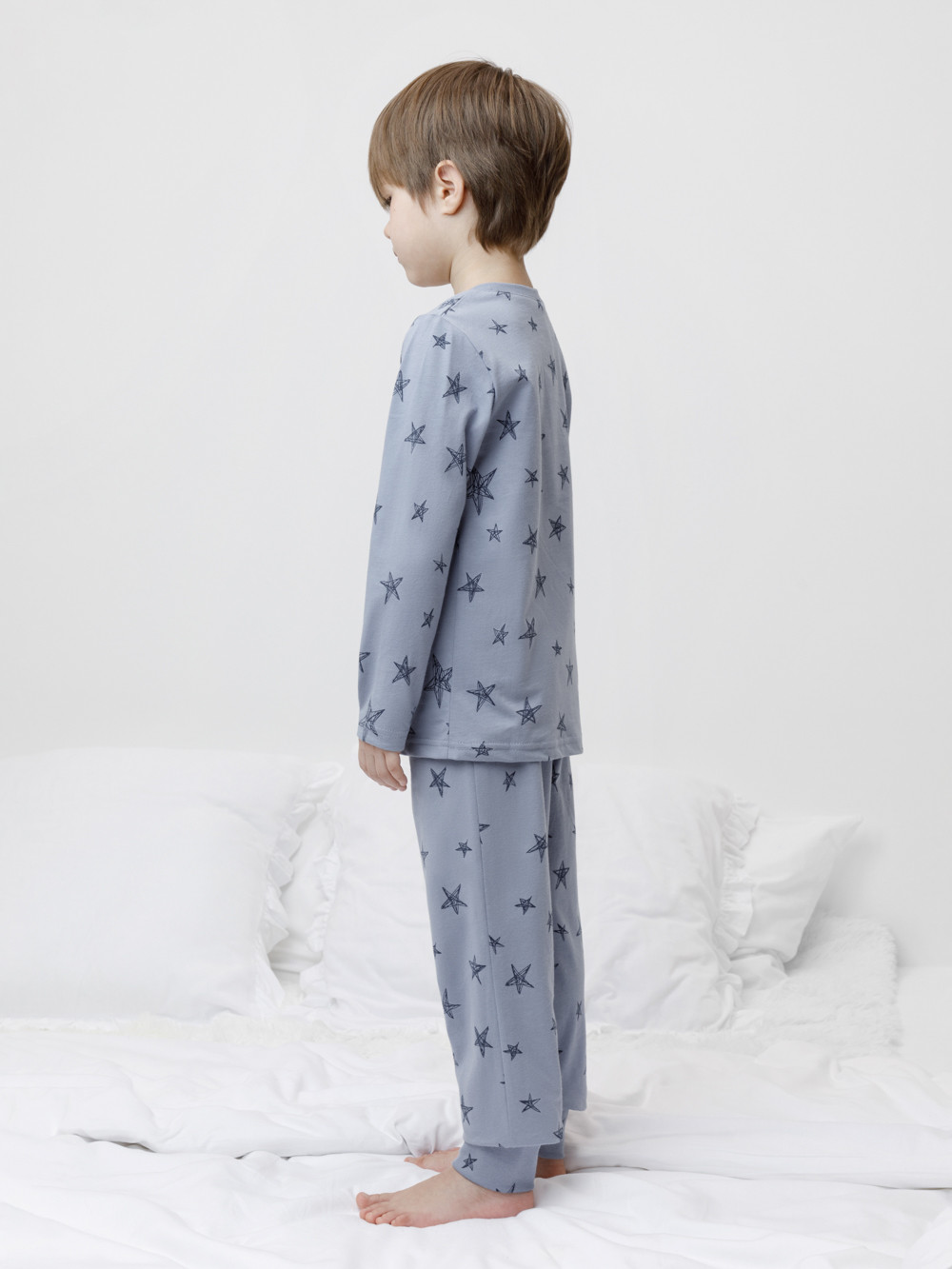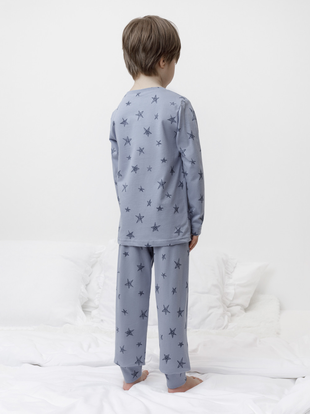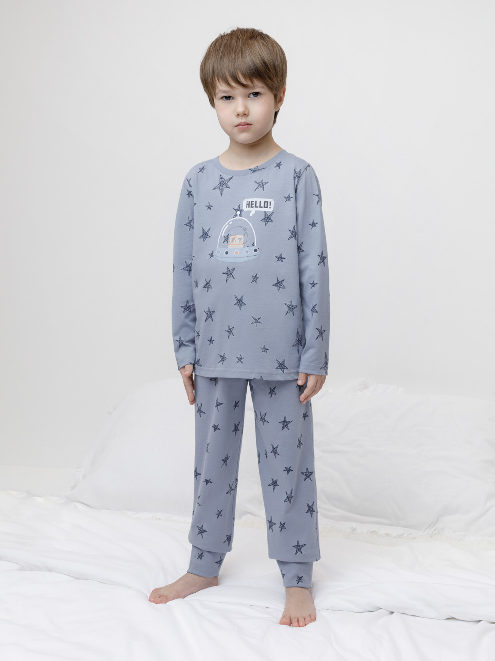 Пижама для мальчика из натурального хлопка. Джемпер с длинными втачными рукавами и брюки с эластичной резинкой в поясе. Мягкие манжеты по низу брюк сделаны из материала в рубчик. Оригинальная набивка и принт выполнены из стойких текстильных гипоаллергенных красителей. Изделие сохраняет цвет и форму после многократных стирок. Все трикотажные полотна производятся в соответствии с нормами швейцарского сертификата ЭкоТекс.