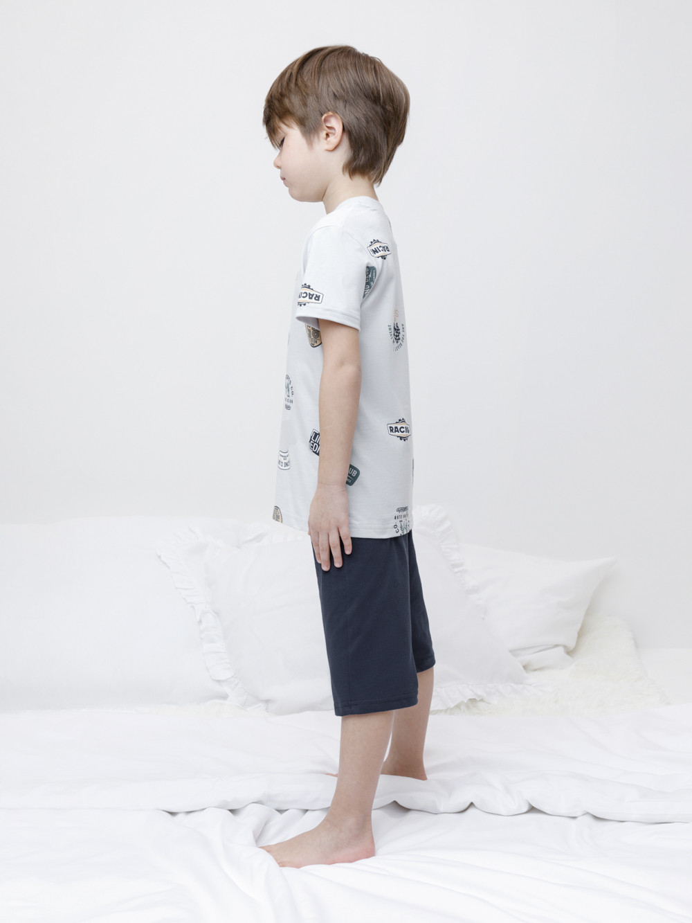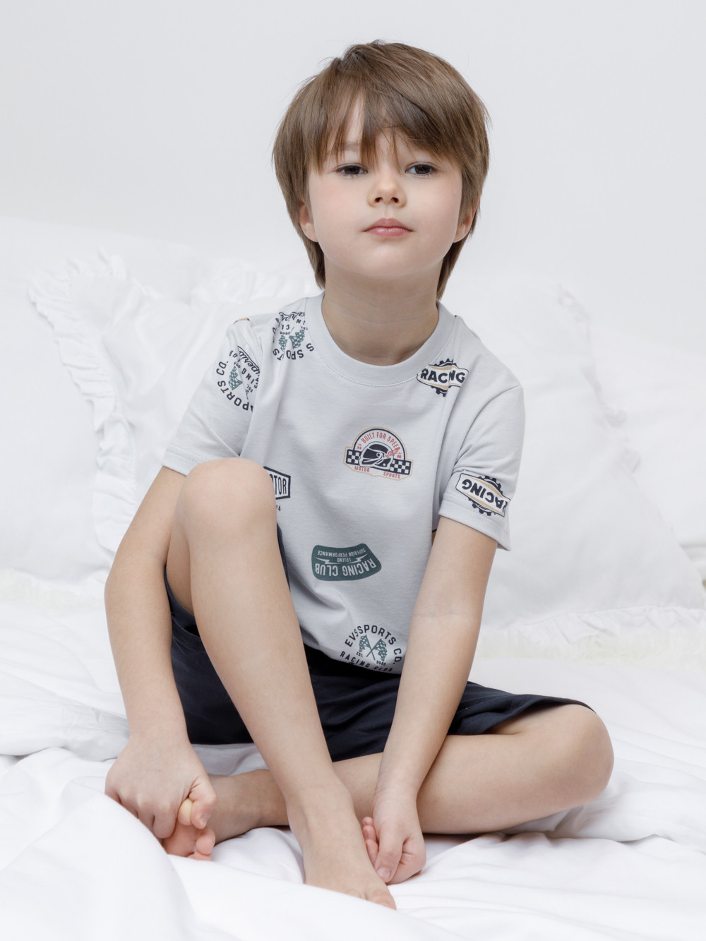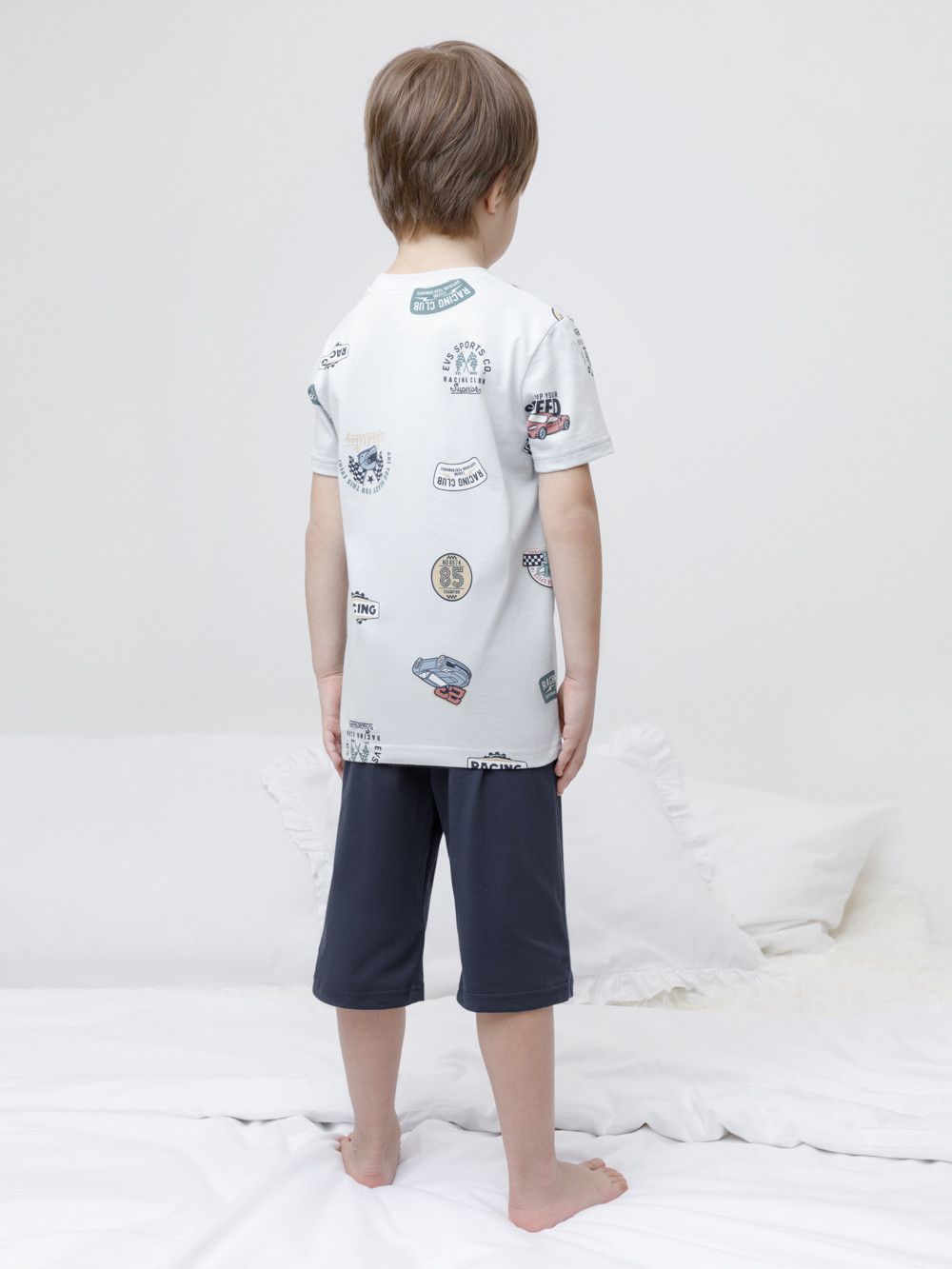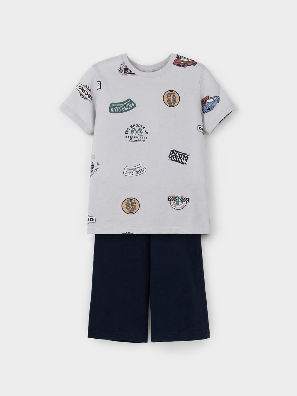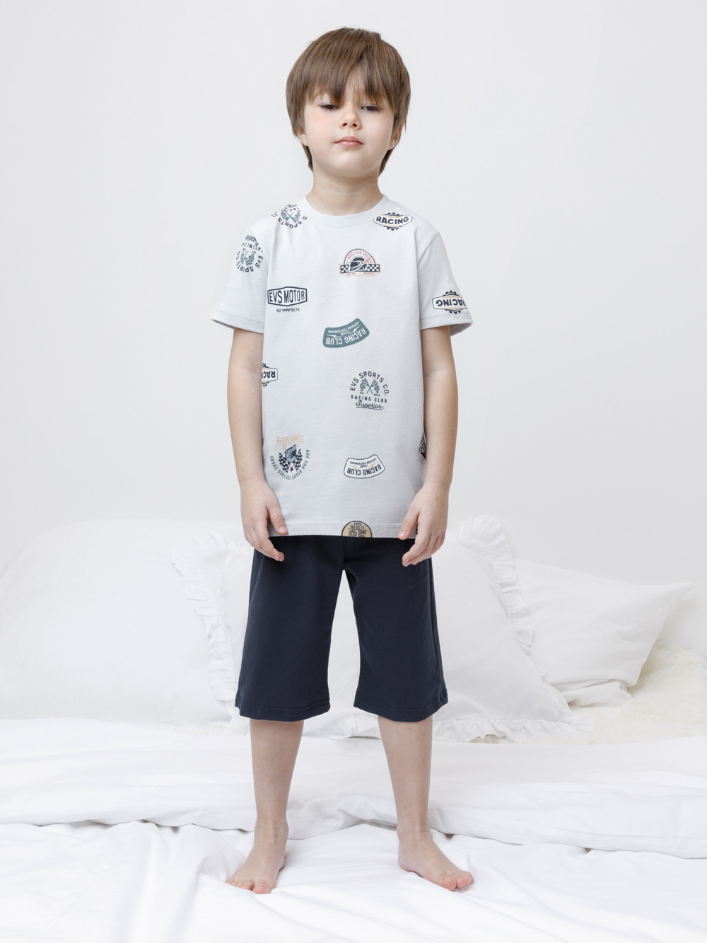 Пижама для мальчика из натурального хлопка. Футболка с короткими втачными рукавами и шорты с эластичной резинкой в поясе. Оригинальная набивка выполнена из стойких текстильных гипоаллергенных красителей. Изделие сохраняет цвет и форму после многократных стирок. Все трикотажные полотна производятся в соответствии с нормами швейцарского сертификата ЭкоТекс.
