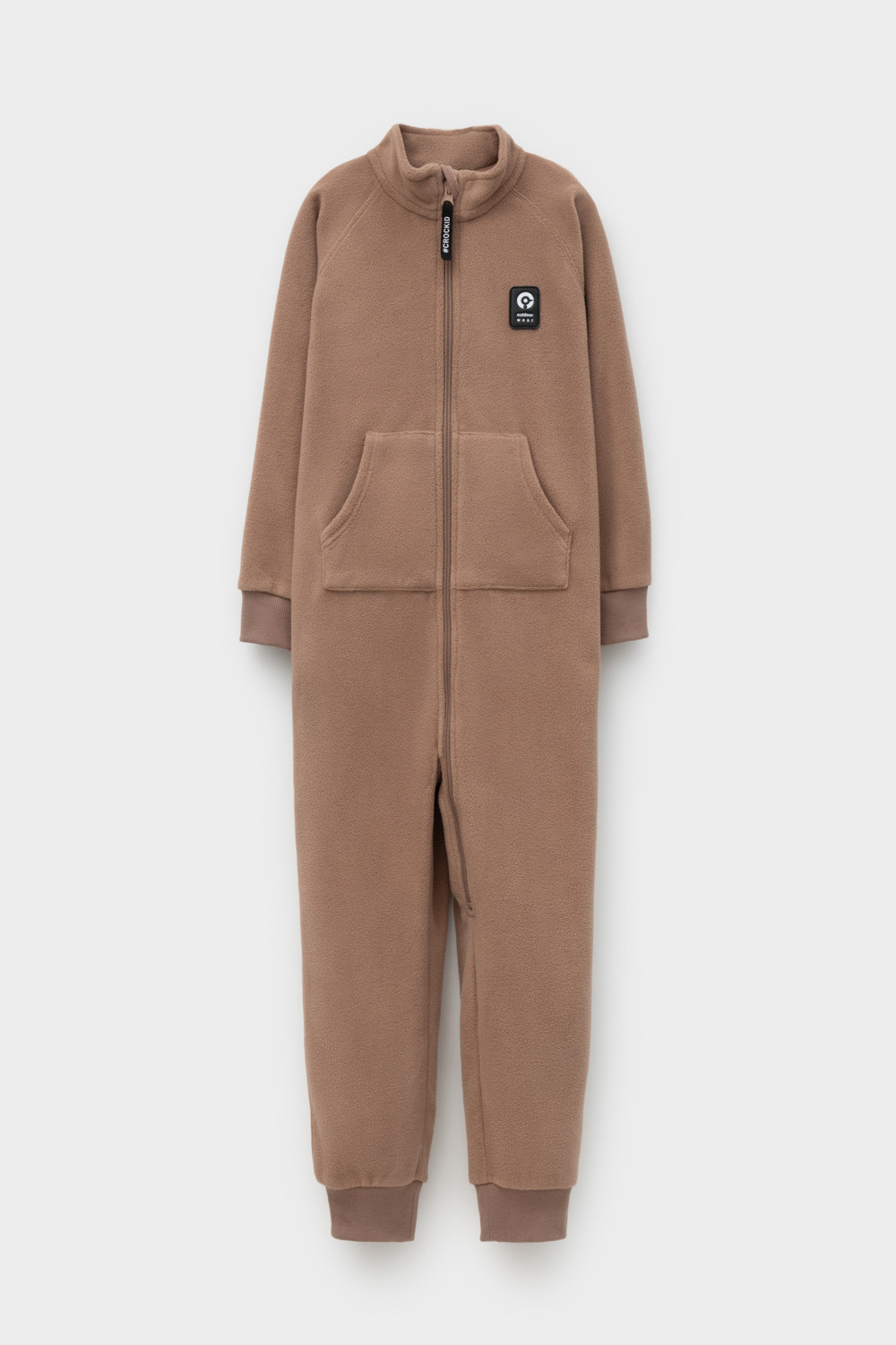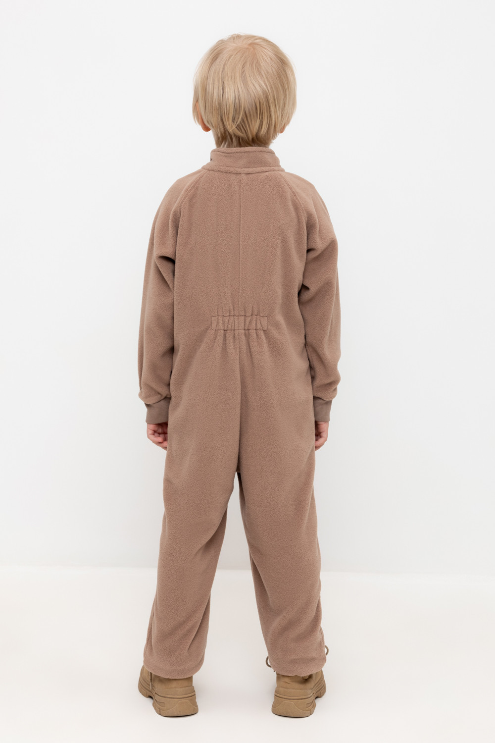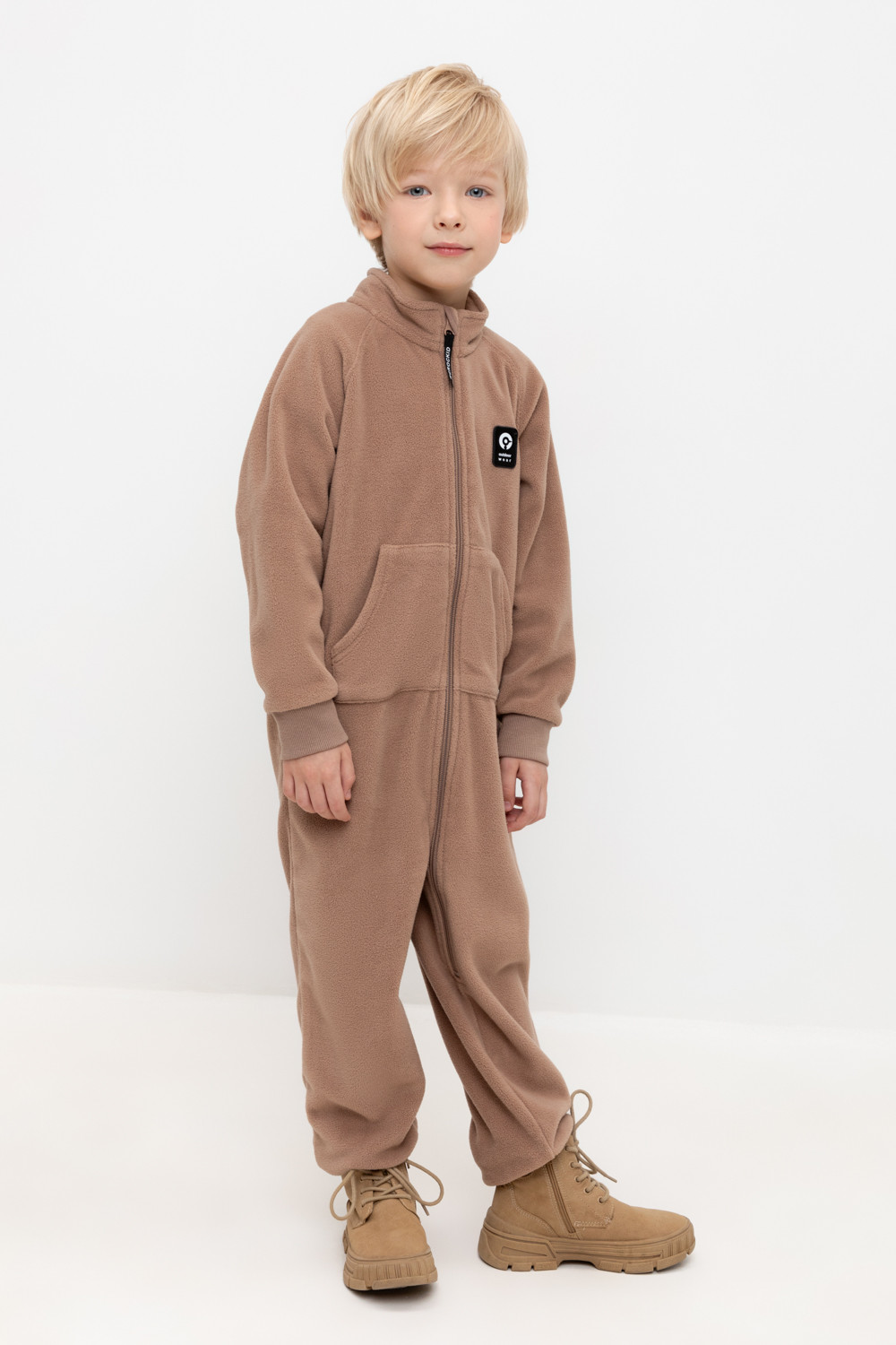 Флисовый комбинезон для мальчика. У изделия высокий воротник и рукава-реглан. Застёгивается на удлинённую молнию. Предусмотрена защита шеи и подбородка. Спереди карман-кенгуру. Комбинезон сохраняет цвет и форму после многократных стирок.
