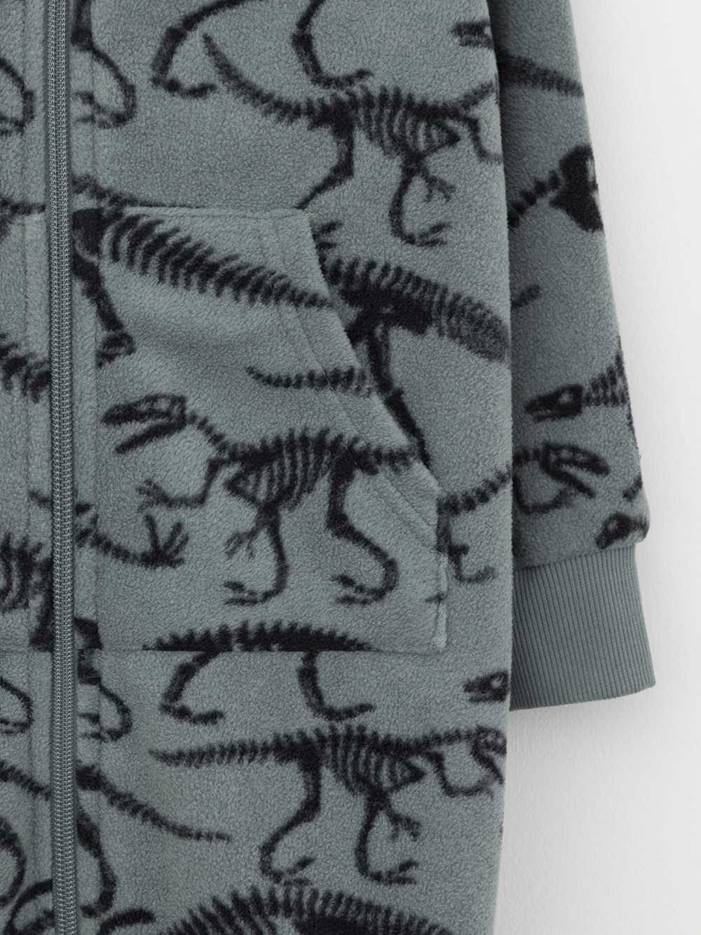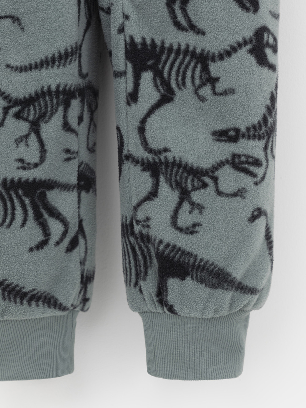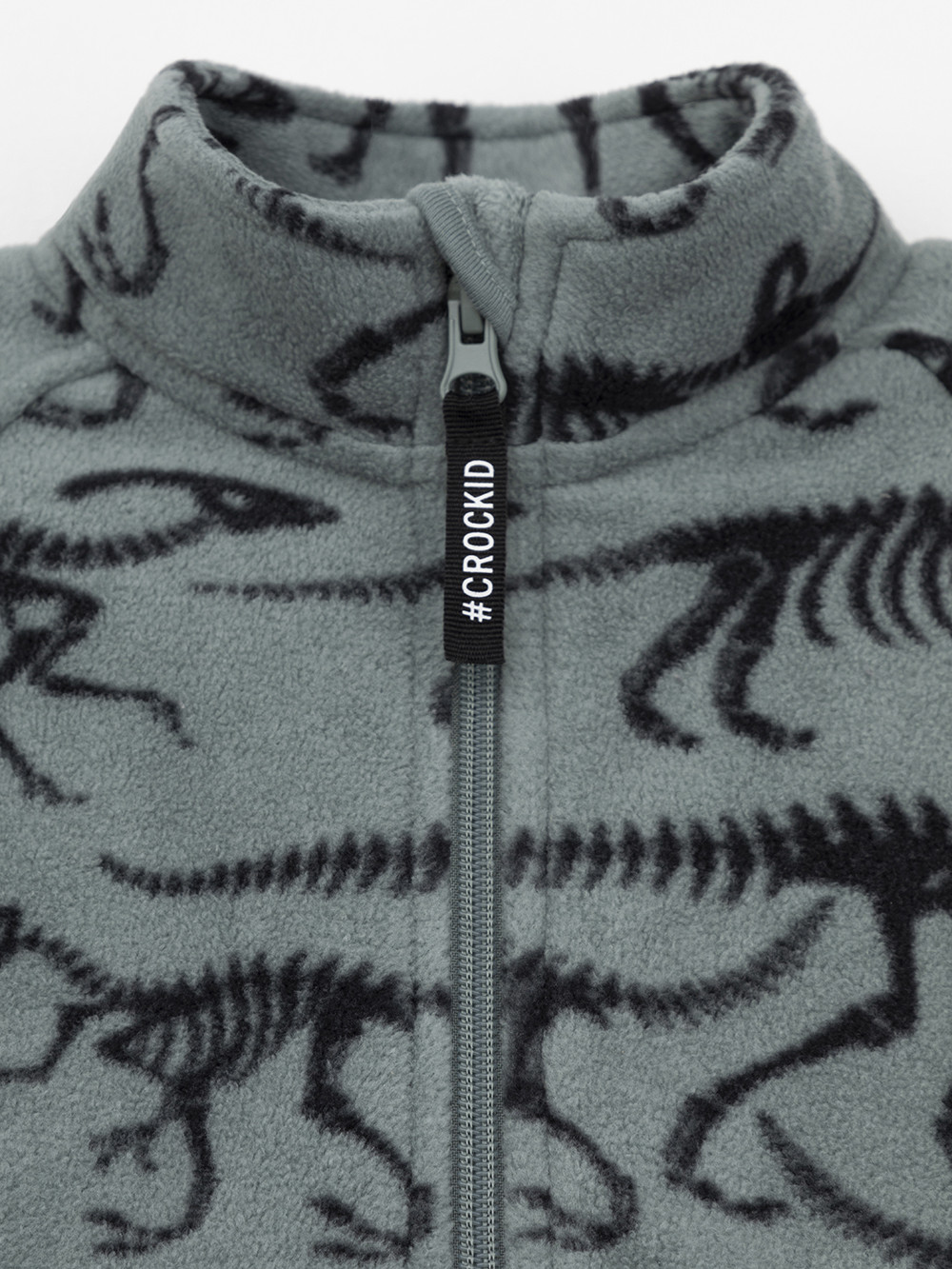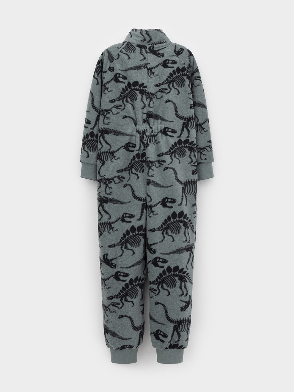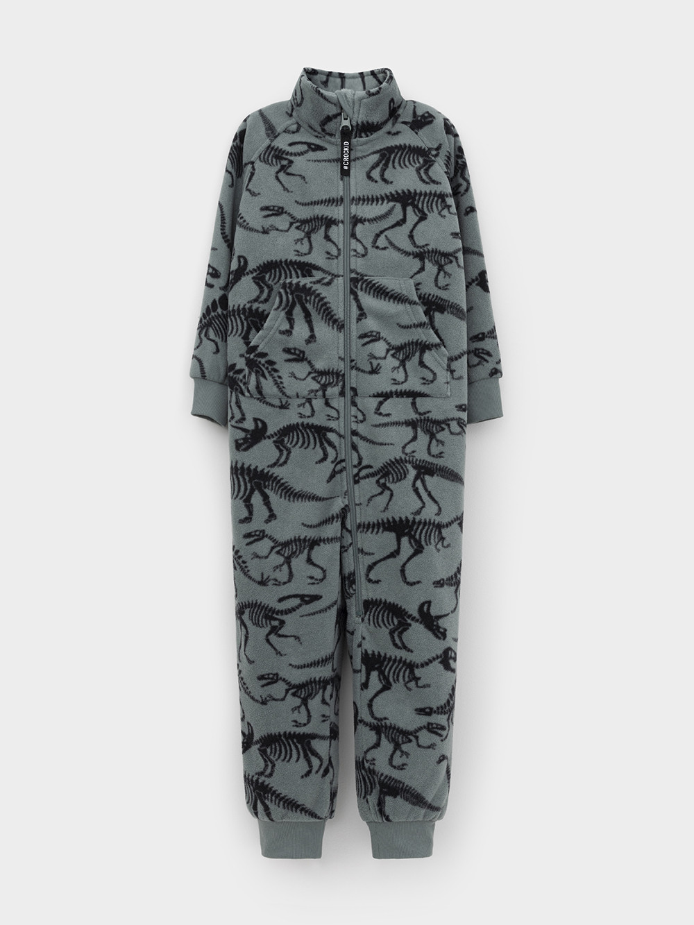 Флисовый комбинезон для мальчика с высоким воротником. Застёгивается на удлинённую молнию с мягкой защитой шеи и подбородка. Рукава и низ изделия на манжетах из  трикотажа в рубчик. Эластичная резинка по спинке обеспечивает идеальную посадку. Спереди удобный карман-кенгуру. Оригинальная набивка выполнена из стойких гипоаллергенных текстильных красителей. Комбинезон сохраняет цвет и форму после многократных стирок.