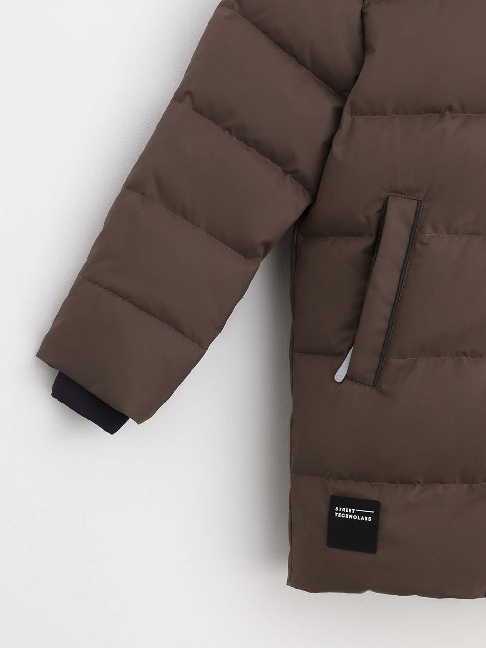 Зимнее пальто для мальчика с натуральным утеплителем из гусиного пуха (70%) и пера (30%). Выполнено из мембранной ткани с дополнительной тефлоновой обработкой, которая предохраняет изделие от загрязнений и отталкивает влагу. Подклад выполнен из 100% полиэстера. Пальто застёгивается на молнию, предусмотрена защита подбородка. Несъёмный капюшон имеет эластичные утяжки. По бокам два кармана на молнии, так же имеется внутренний карман. В рукавах мягкие внутренние манжеты. Во всех изделиях верхнего ассортимента для безопасности ребёнка предусмотрены светоотражающие элементы.