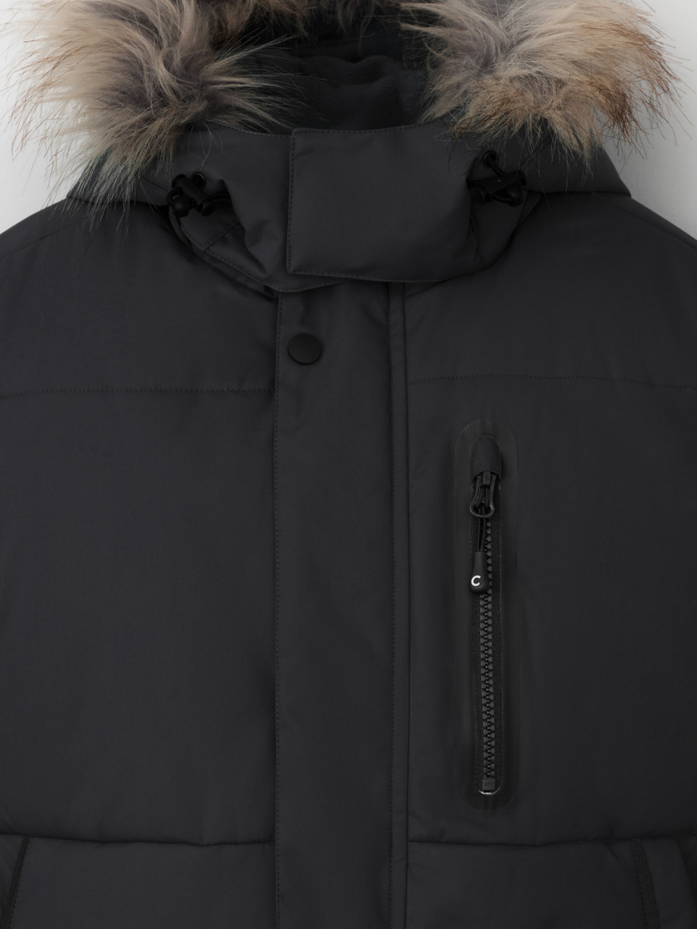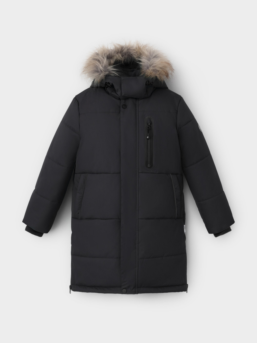 Зимнее пальто для мальчика с утеплителем  SEE®: 300 г/м2. Выполнено из мембранной ткани с дополнительной тефлоновой обработкой, которая предохраняет изделие от загрязнений и отталкивает влагу. Подклад выполнен из 100% полиэстера Tricot. Пальто застёгивается на молнию и внешнюю планку с кнопками. Съёмный капюшон имеет эластичную утяжку со стопперами и отстёгивающийся мех на молнии, регулируется по глубине с помощью липучки. На рукавах внутренние эластичные манжеты. По бокам два кармана на молниях и один карман на груди. Во всех изделиях верхнего ассортимента для безопасности ребёнка предусмотрены светоотражающие элементы.