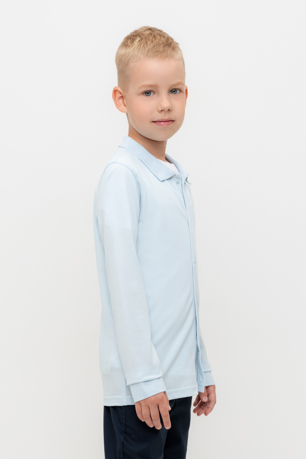 Рубашка школьная для мальчика из высококачественного трикотажного полотна пике. У изделия вязаный воротник, манжеты и застежка спереди на пуговицы.