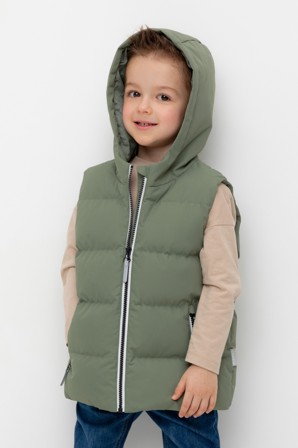 Стеганый жилет с капюшоном для мальчика с утеплителем Fellex®: 120 г/м2. Выполнен из мембранной ткани с дополнительной тефлоновой обработкой. Данный вид обработки предохраняет изделие от загрязнения и лучше отводит влагу. Подклад из 100% полиэстра. Капюшон не снимается. Изделие застёгивается на молнию, предусмотрена защита подбородка. Два кармана по бокам застёгиваются на молнии. Во всех изделиях верхнего ассортимента для безопасности ребенка предусмотрены светоотражающие элементы.