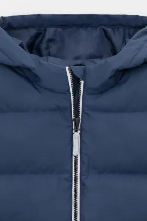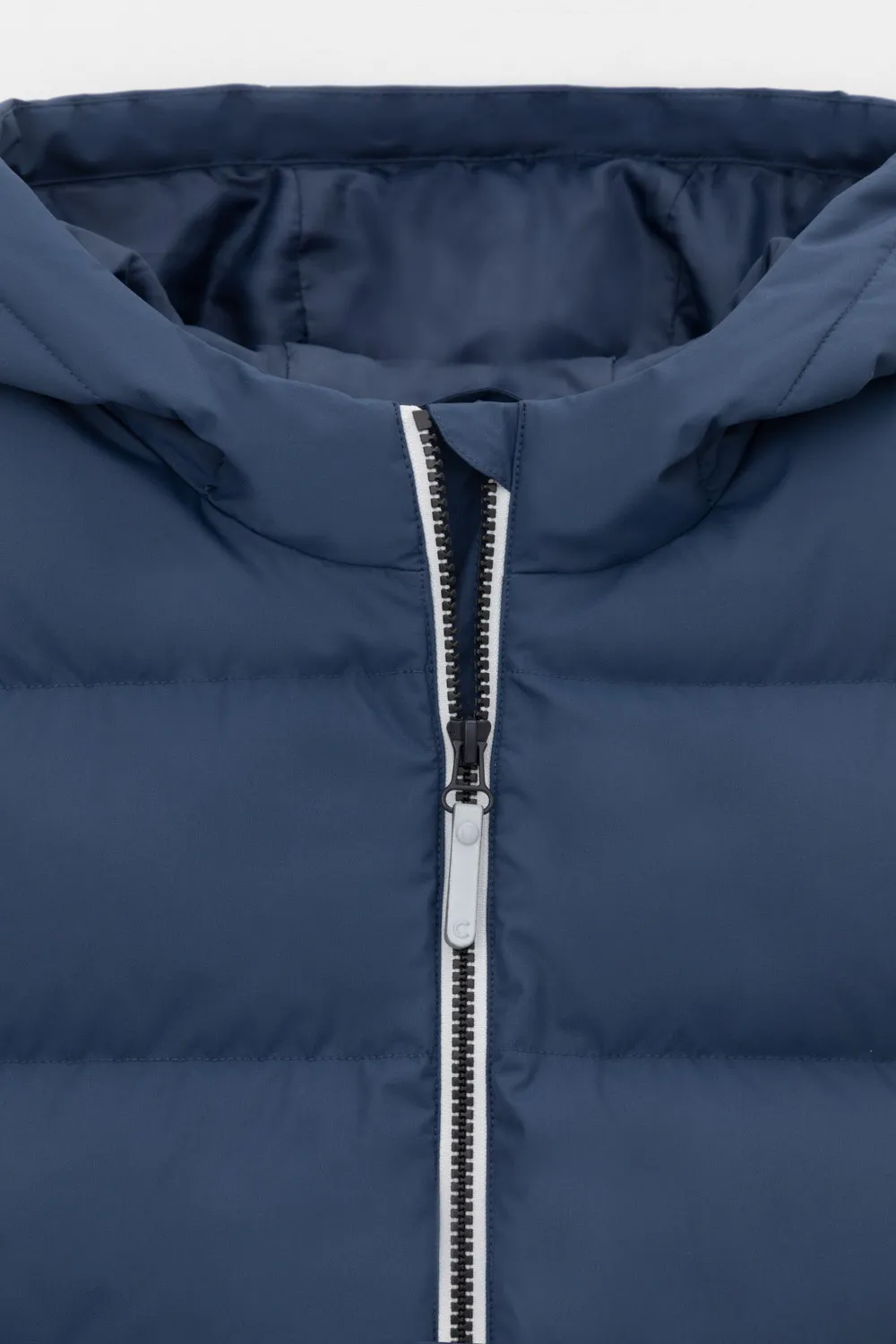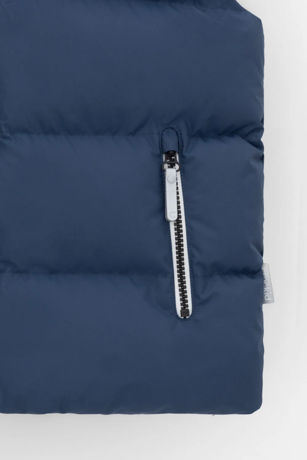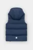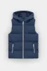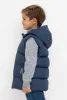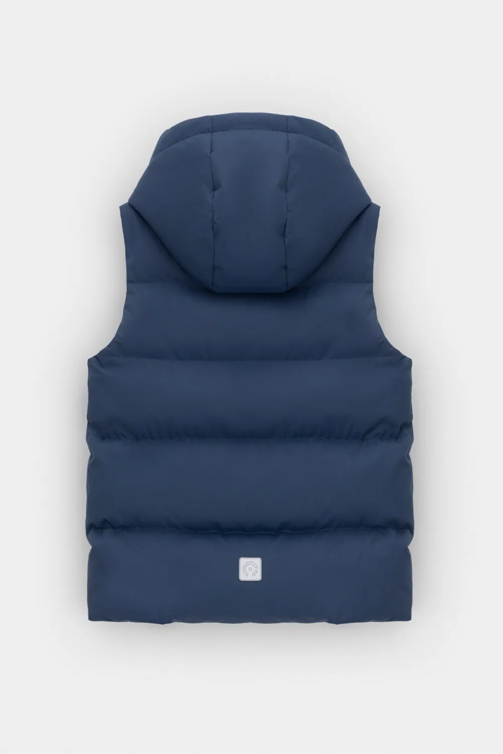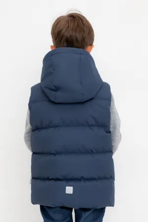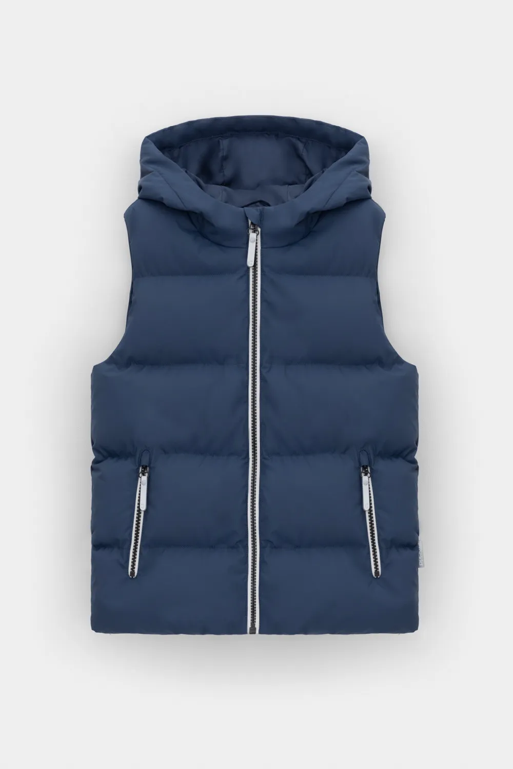 Стеганый жилет с капюшоном для мальчика с утеплителем Fellex®: 120 г/м2. Выполнен из мембранной ткани с дополнительной тефлоновой обработкой. Данный вид обработки предохраняет изделие от загрязнения и лучше отводит влагу. Подклад из 100% полиэстра. Капюшон не снимается. Изделие застёгивается на молнию, предусмотрена защита подбородка. Два кармана по бокам застёгиваются на молнии. Во всех изделиях верхнего ассортимента для безопасности ребенка предусмотрены светоотражающие элементы.