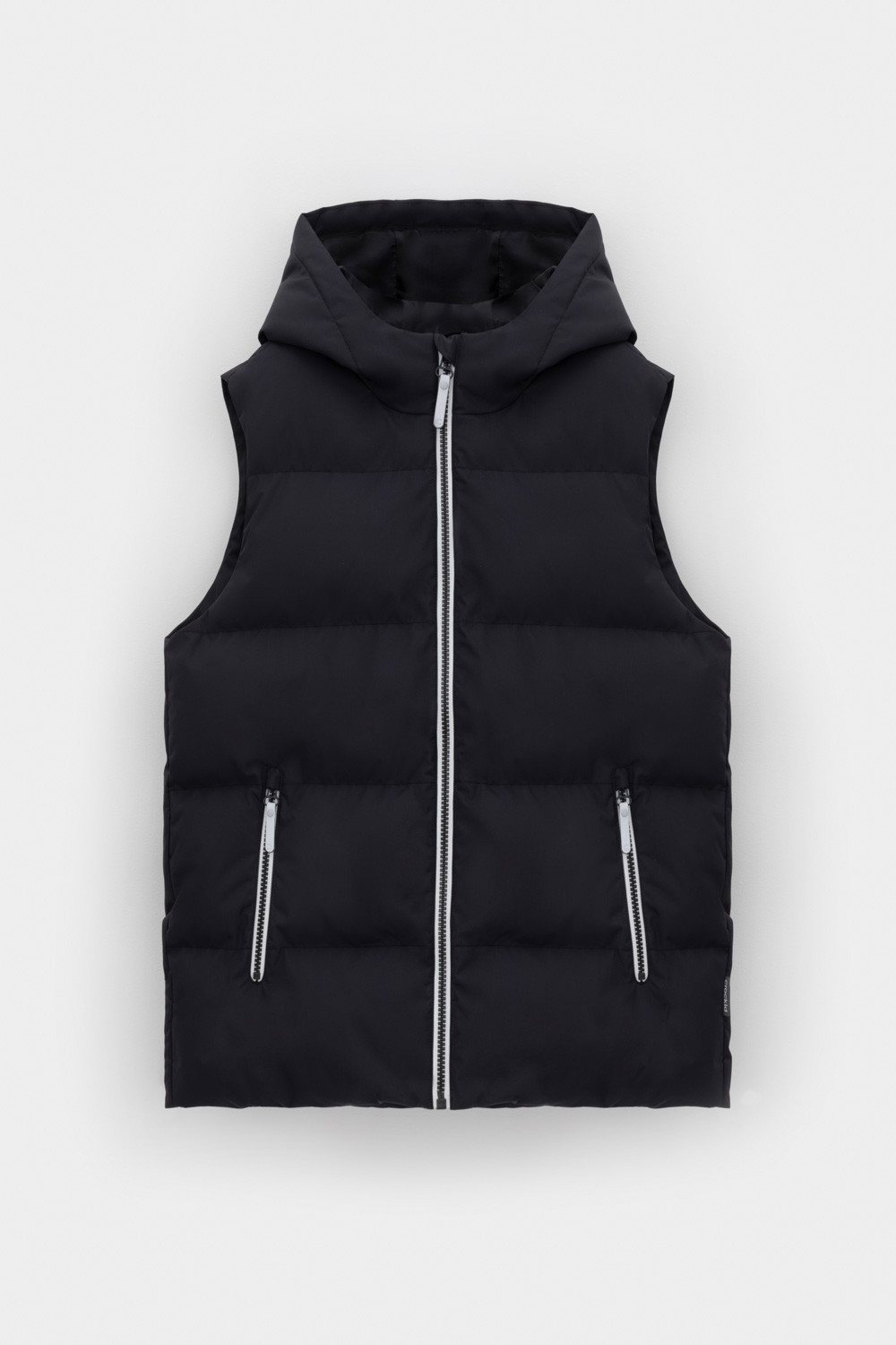 Стеганый жилет с капюшоном для мальчика с утеплителем Fellex®: 120 г/м2. Выполнен из мембранной ткани с дополнительной тефлоновой обработкой. Данный вид обработки предохраняет изделие от загрязнения и лучше отводит влагу. Подклад из 100% полиэстра. Капюшон не снимается. Изделие застёгивается на молнию, предусмотрена защита подбородка. Два кармана по бокам застёгиваются на молнии. Во всех изделиях верхнего ассортимента для безопасности ребенка предусмотрены светоотражающие элементы.