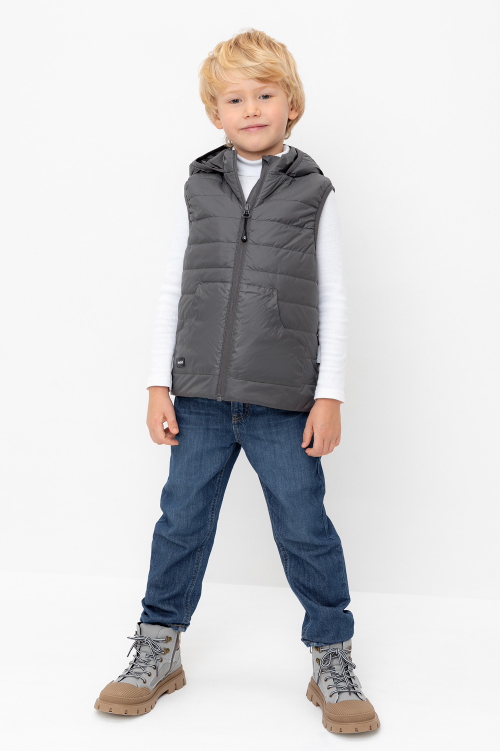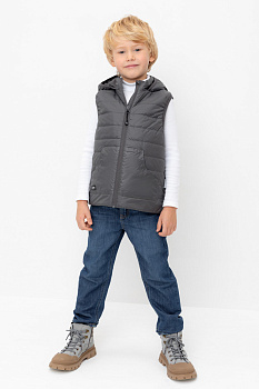 Стеганый жилет с капюшоном для мальчика с утеплителем Fellex®: 120 г/м2. Выполнен из мембранной ткани с дополнительной тефлоновой обработкой. Данный вид обработки предохраняет изделие от загрязнения и лучше отводит влагу. Подклад: 60% хлопок и 40% полиэстер на размерах 86-92 и 92-98 и 100% полиэстер на остальных размерах. У изделия предусмотрена защита подбородка. Спереди два кармана. Во всех изделиях верхнего ассортимента для безопасности ребенка предусмотрены светоотражающие элементы.