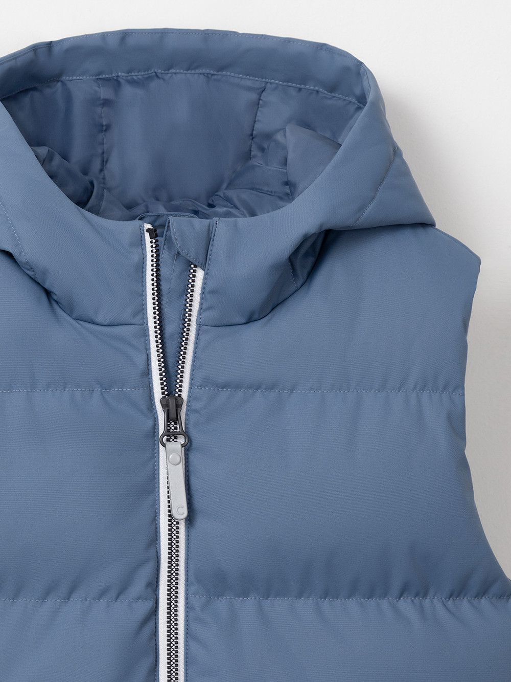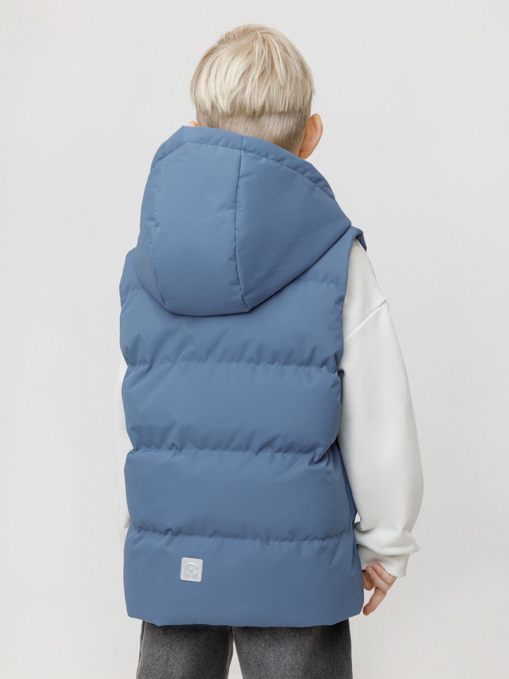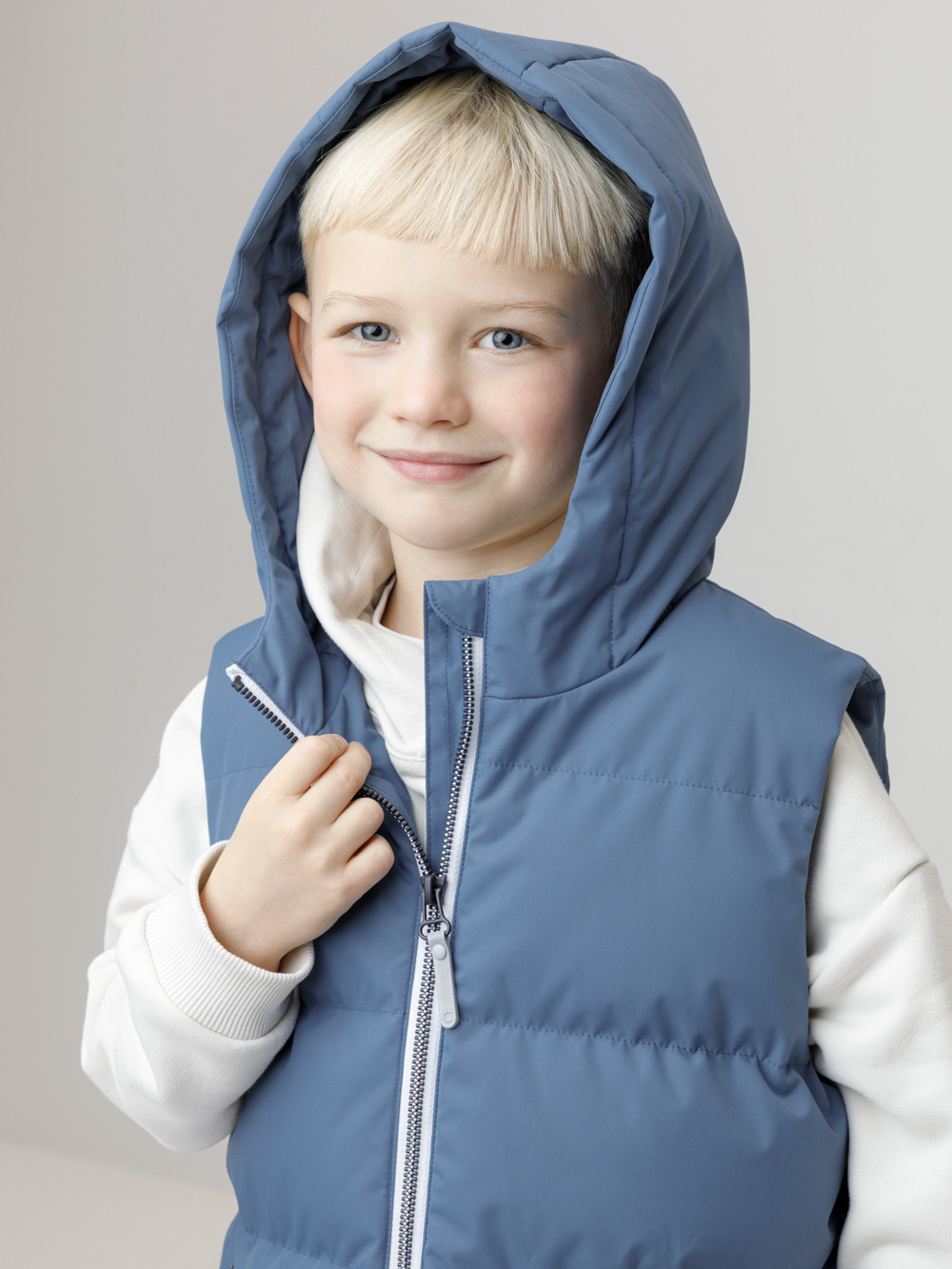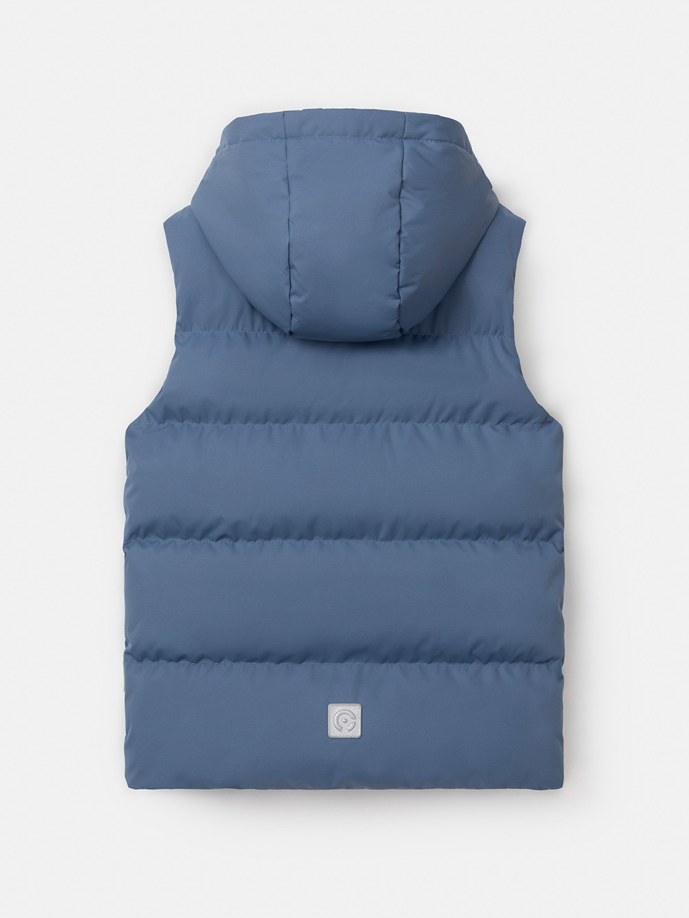Стёганый жилет с капюшоном для мальчика с утеплителем, 120 г/м2. Выполнен из мембранной ткани с дополнительной тефлоновой обработкой. Данный вид обработки предохраняет изделие от загрязнения и лучше отводит влагу. Подклад из 100% полиэстра. Капюшон не снимается. Изделие застёгивается на молнию, предусмотрена защита подбородка. Два кармана по бокам застёгиваются на молнии. Во всех изделиях верхнего ассортимента для безопасности ребёнка предусмотрены светоотражающие элементы.